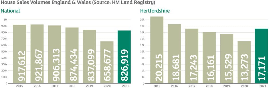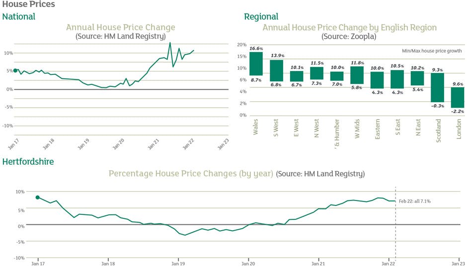 The annual rate of house price change remains high at 7.1% according to HM Land Registry. In Hertfordshire, the rise is into double digits as the popularity of strong commuter locations and the attraction of the many outstanding schools in the county continues to be a strong draw for both locals and those looking to relocate. Sales transactions are beginning to normalise from the artificial stimulus created by the Stamp Duty holidays of 2021.