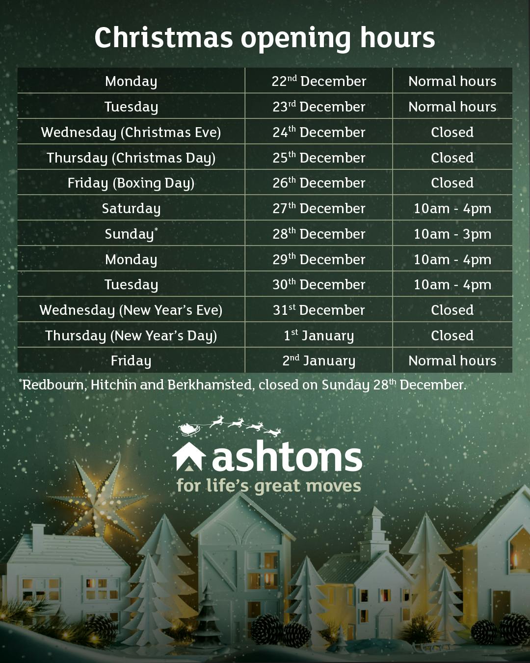 If you would like to visit us during the festive period, please see our opening hours below: