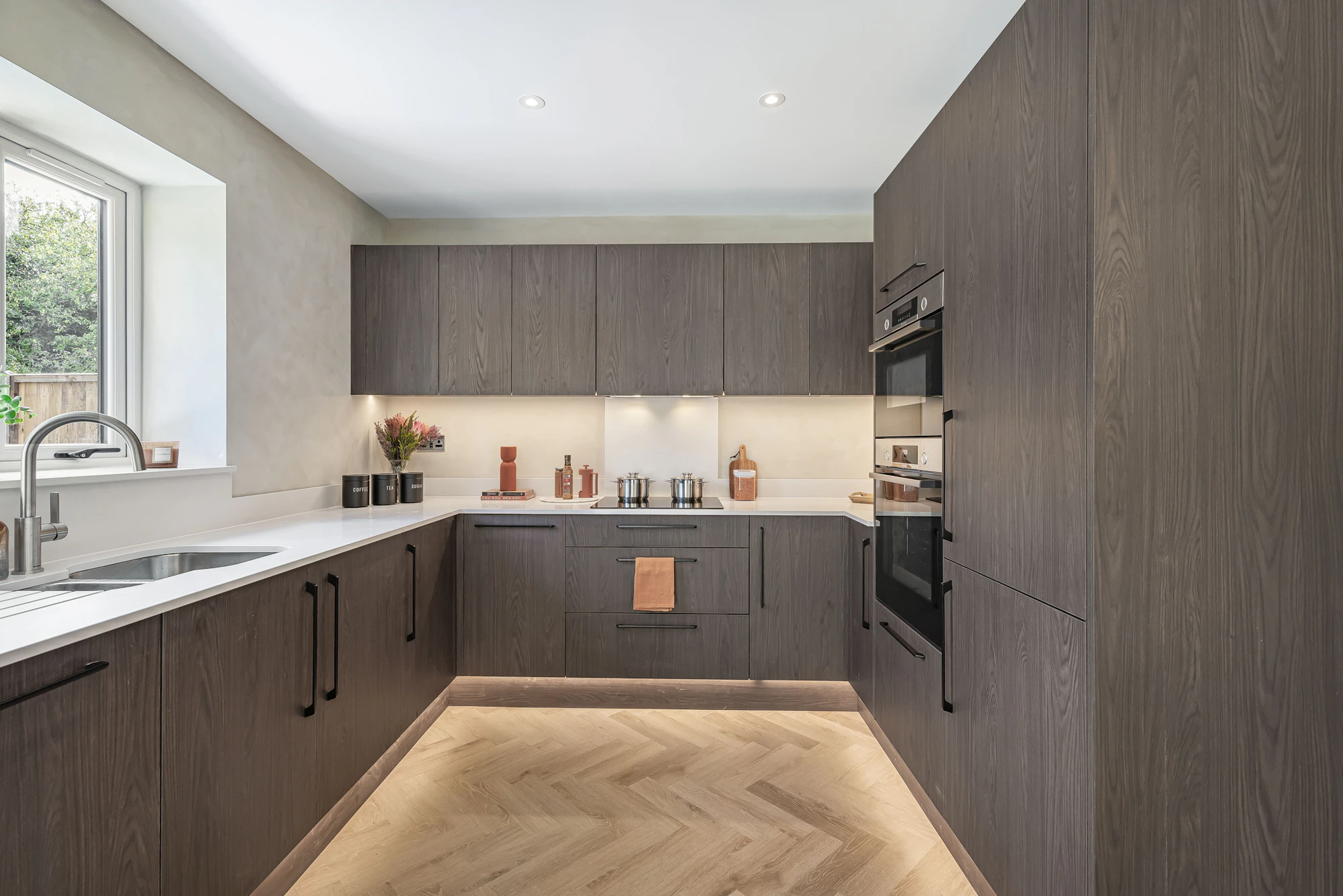 - To the rear is the beautifully finished open-plan kitchen/dining/family area with herringbone style flooring, striking Lime Wash effect painted walls and bi-fold doors opening up onto the extensive rear terrace and garden beyond. The contemporary chic dark wood effect kitchen boasts branded integrated appliances, white silestone work surfaces and upstands, and feature under unit and plinth soft mood lighting.