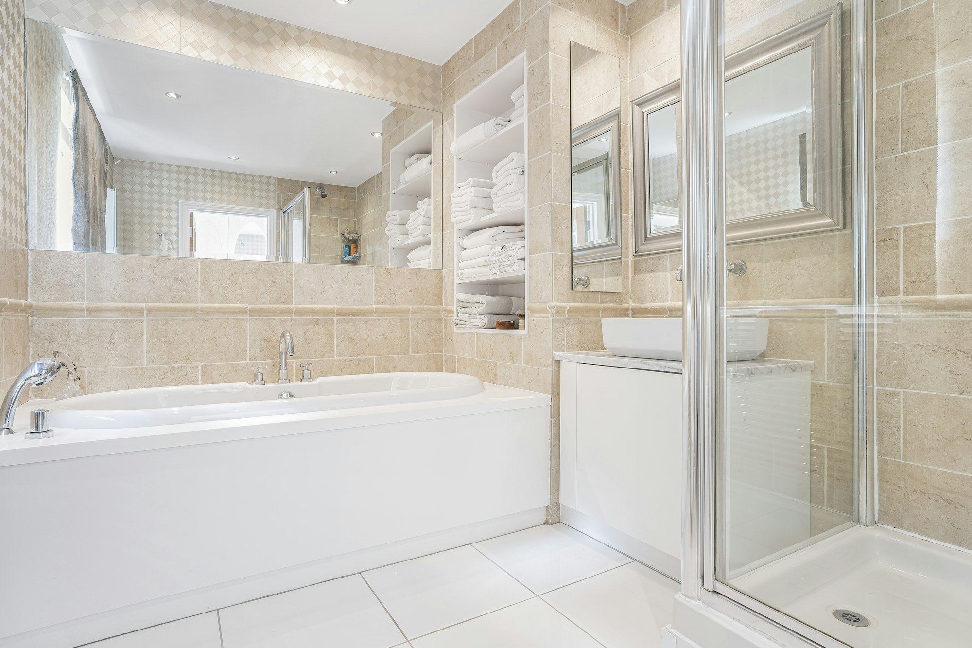 Upstairs, the luxurious principal suite enjoys double aspect views and features custom-fitted wardrobes and a beautifully appointed ensuite bathroom. Two further spacious double bedrooms and a stylish family bathroom complete the first floor, while the top level offers two additional dual-aspect bedrooms along with a contemporary shower room and WC, providing flexible accommodation for family or guests.
