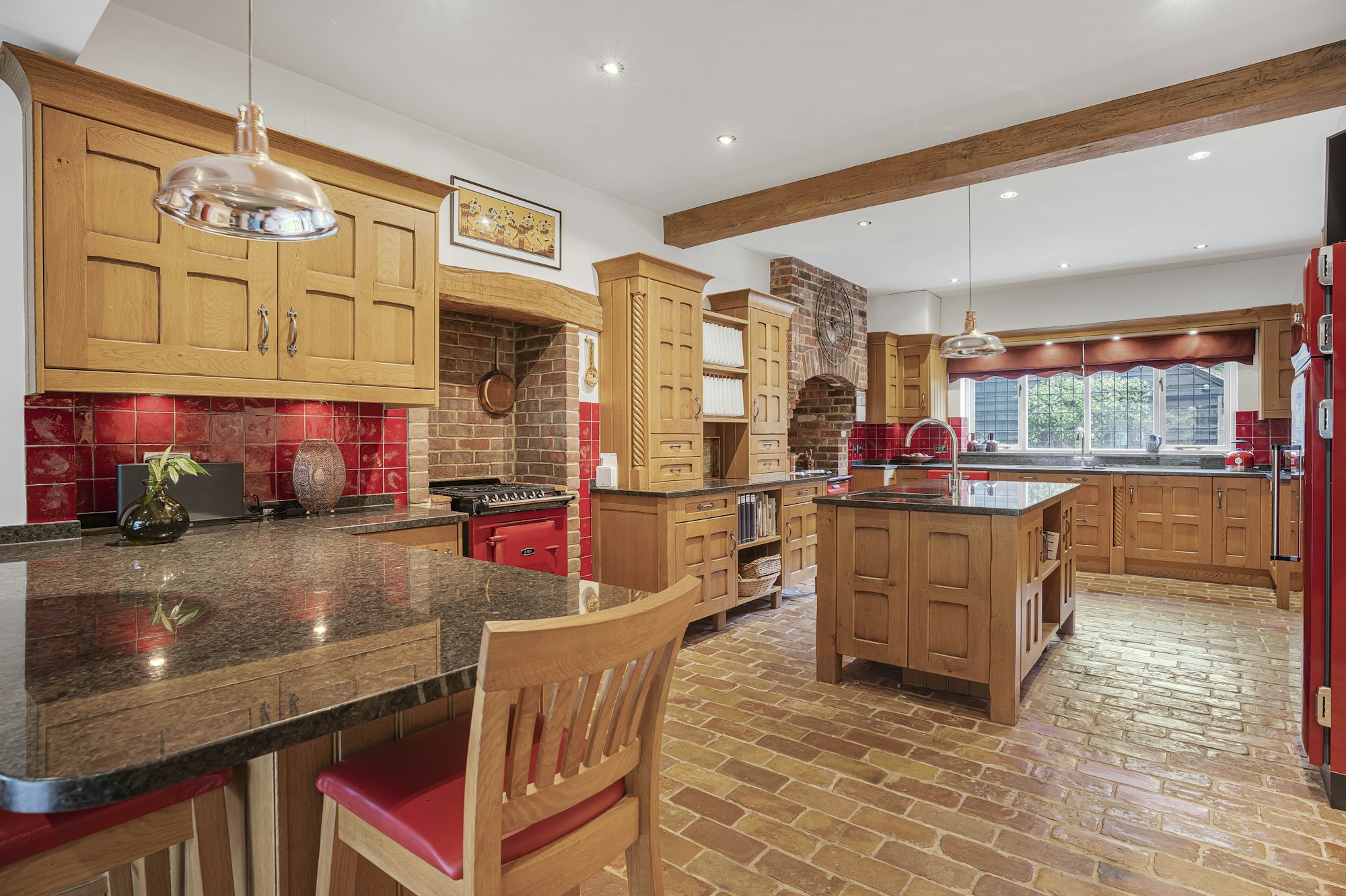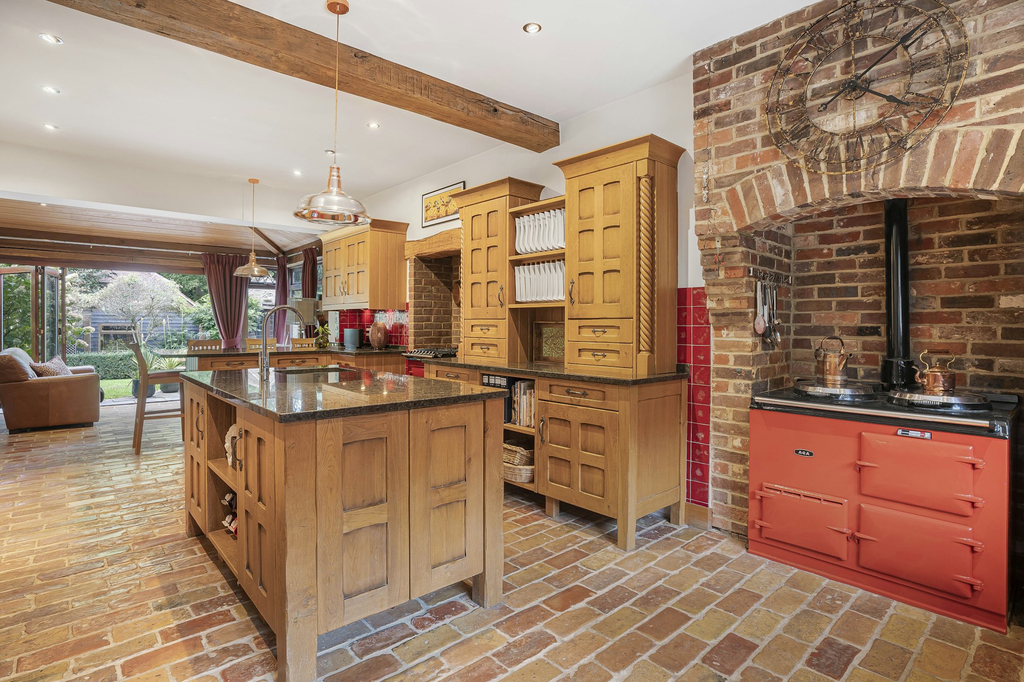 The entrance hall, features an elegant staircase, cloakroom, and storage. A study featuring a charming fireplace, and a beautifully designed open-plan kitchen/ breakfast room. Styled in an elegant French country farmhouse aesthetic, the kitchen showcases bespoke wooden cabinetry, underfloor heating, a central island with inset sink, and includes an AGA. Open plan to the adjoining family area and the bright, spacious conservatory both with doors opening directly onto the sun-soaked, south-westerly terrace and garden. At the heart of the home, the 25-ft central sitting room offers comfort and style, a fireplace, and bespoke illuminated shelving.