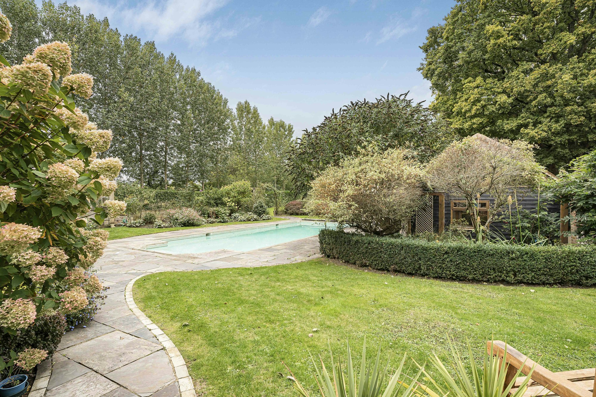 Outside the landscaped garden features a large, paved terrace leading to a full-size, heated and lit 12m x 5m outdoor swimming pool—ideal for summer relaxation and entertaining. A two-storey summer house with mezzanine overlooking the pool boasts bi-fold doors, floor-to-ceiling timber-framed windows, a built-in bar, cloakroom and shower, making it the perfect poolside retreat, home office, or guest accommodation. The grounds also include an enclosed lawn bordered by mature hedging and trees, a paddock, orchard, greenhouse, kitchen garden, and a sunken circular seating area. Additional outbuildings and a large detached double garage/barn and enclosed brick paved courtyard offer extensive secure covered and open storage for numerous vehicles
