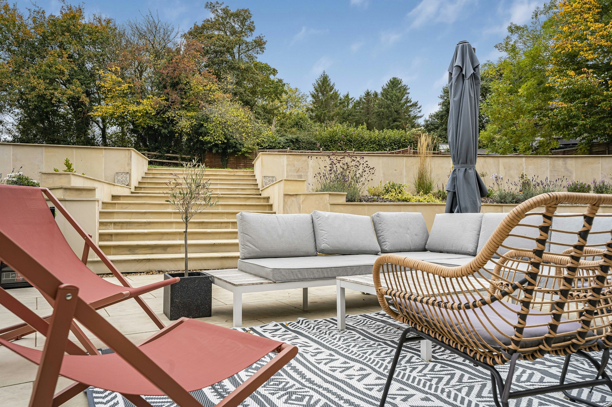 This impressive property benefits from a generous front garden and driveway, with parking for multiple vehicles and a double garage with storage area above, currently used as a gym. To the rear, the beautifully maintained south-west facing garden provides the perfect setting for outdoor dining and relaxation, enjoying sunshine throughout the day and into the evening.