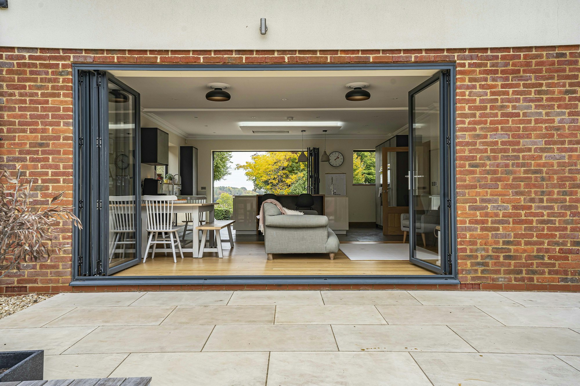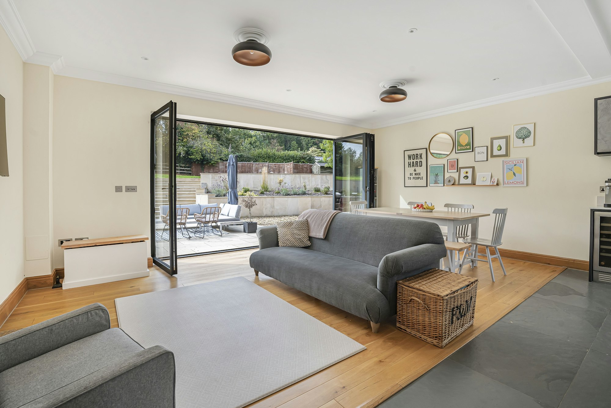 Inside, the house offers spacious and well-designed accommodation, finished to an excellent standard throughout. The two main reception rooms are both large and bright, each with bi-folding doors opening to the front and rear gardens, and a feature fireplace that services both rooms, creating a wonderful sense of warmth and flow.