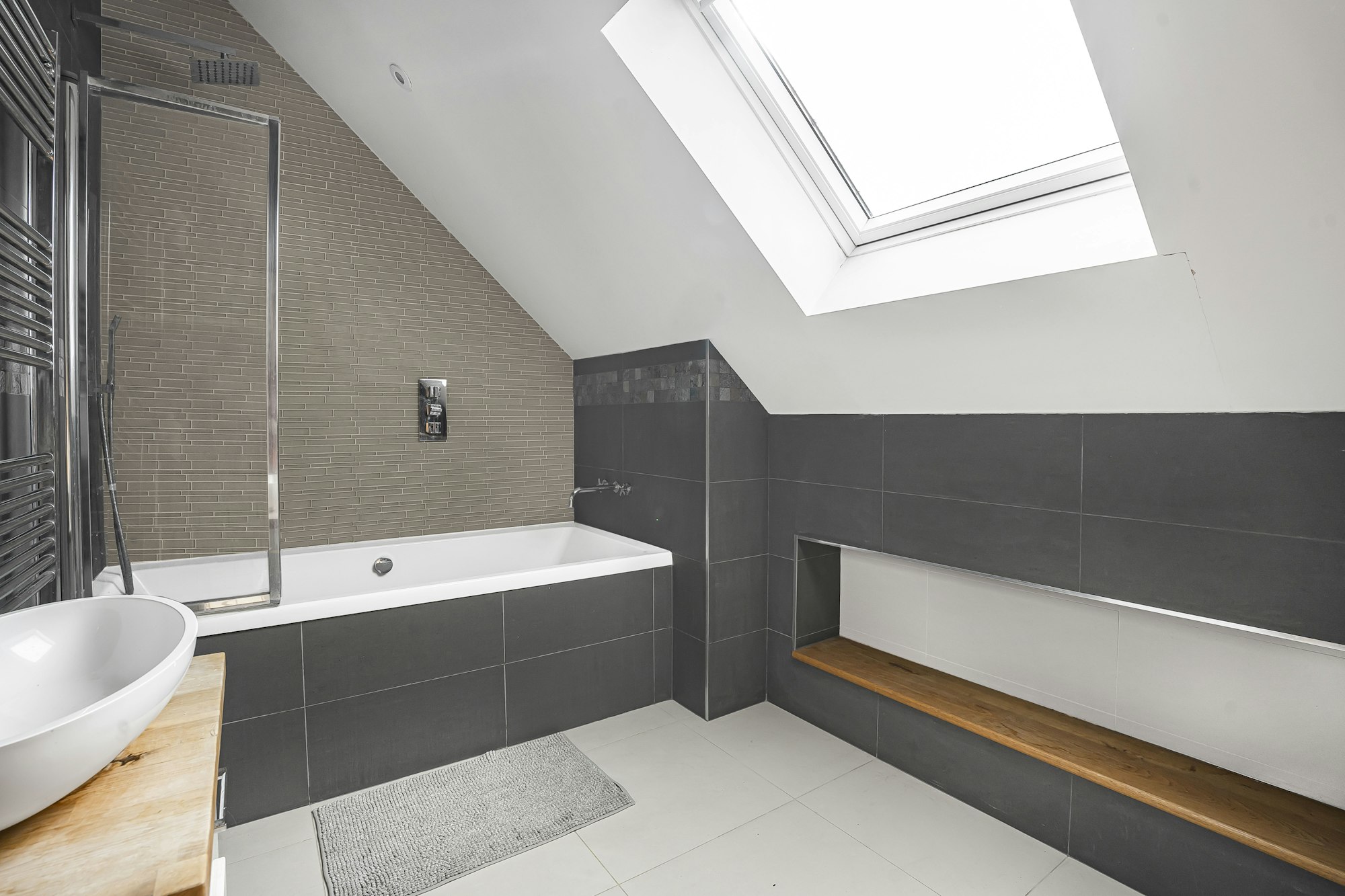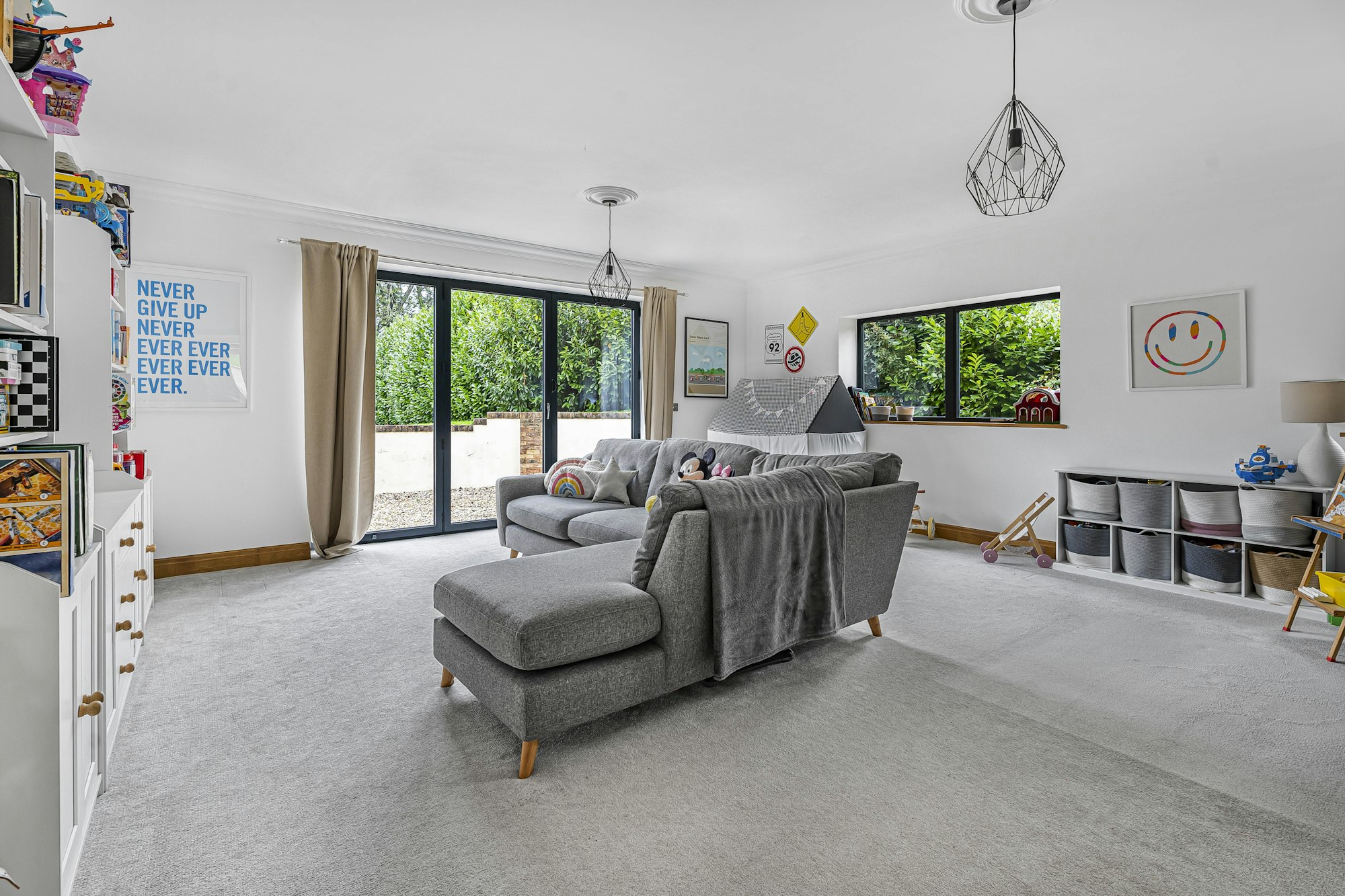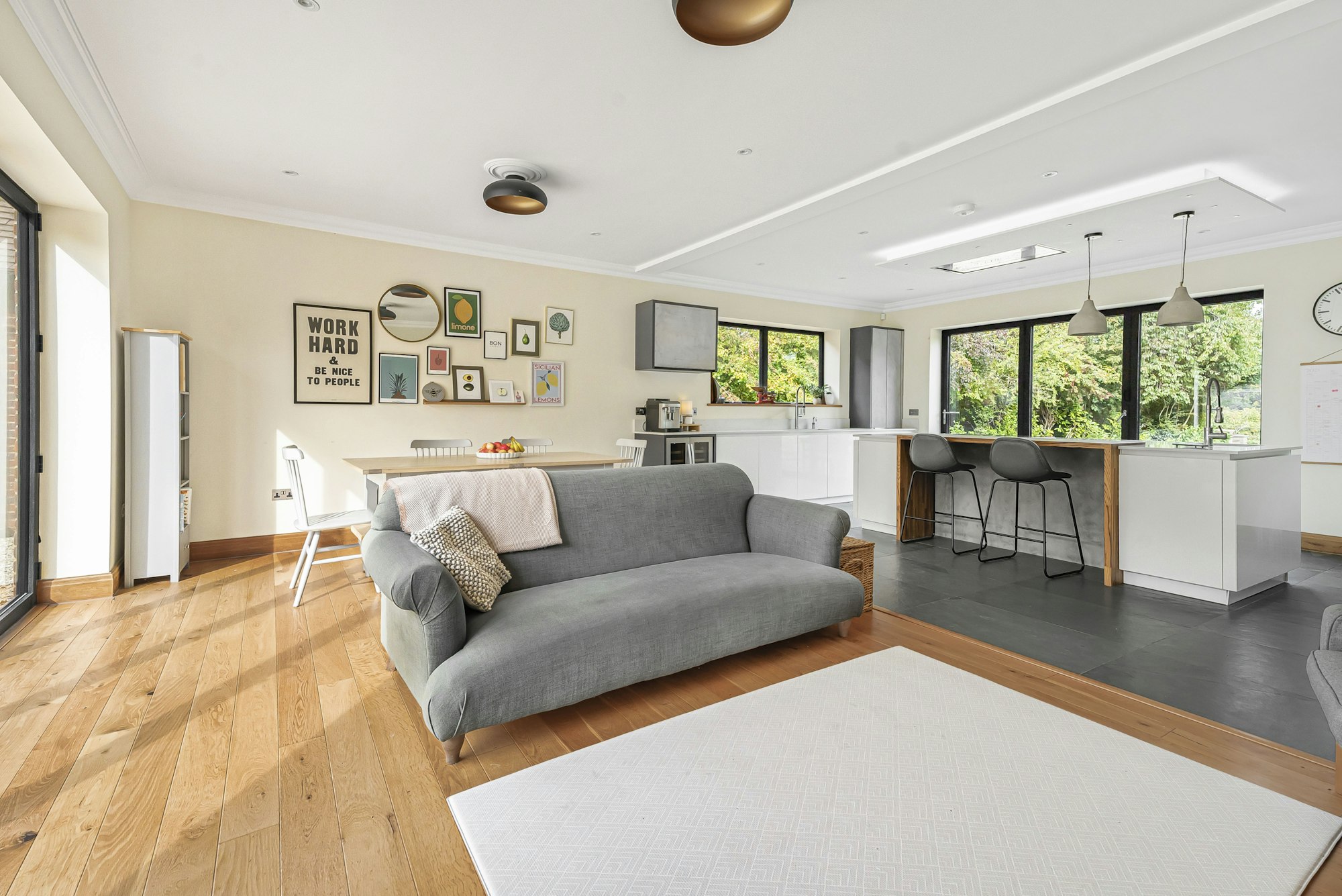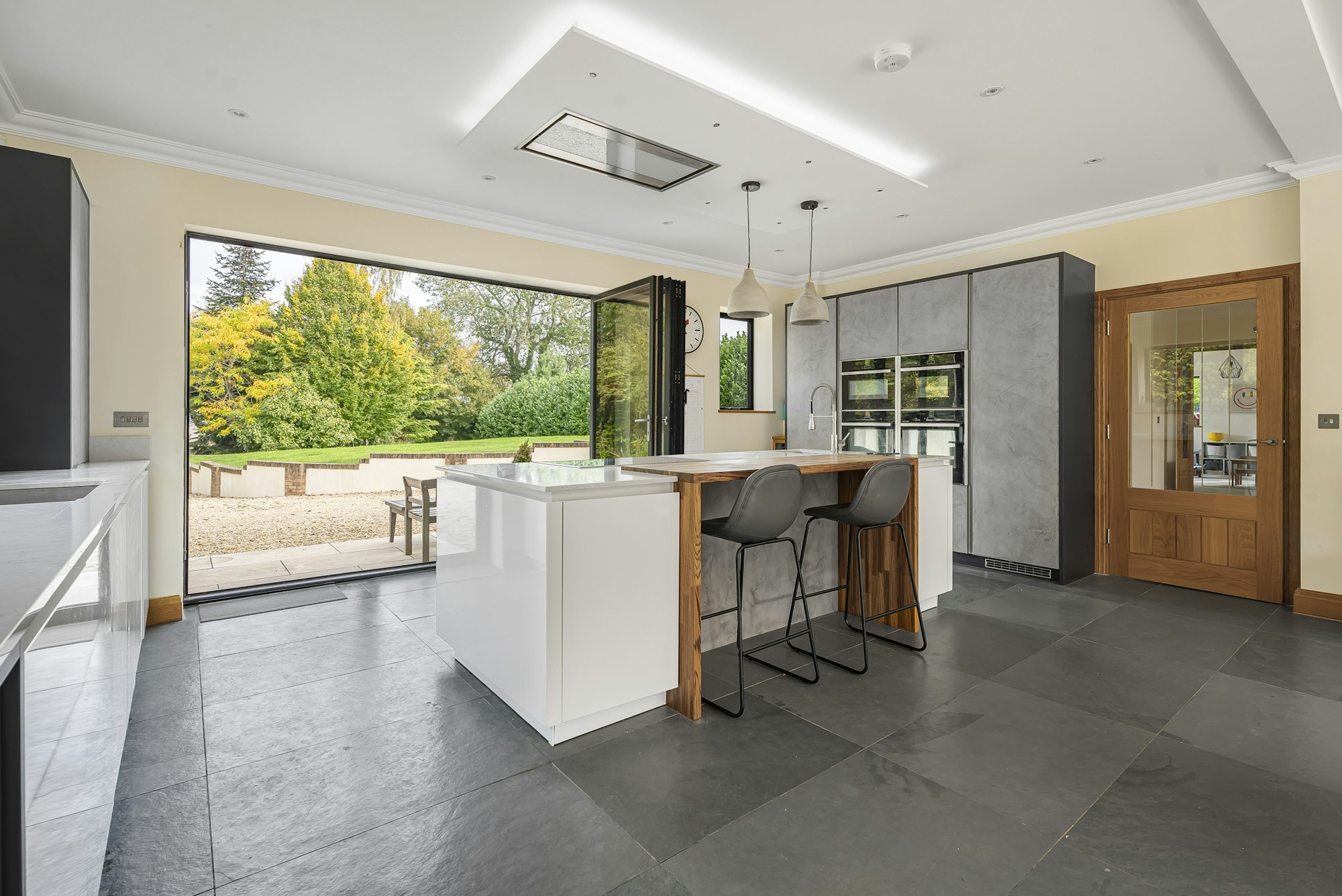 The stunning kitchen/dining room is a real highlight — a contemporary and sociable space with high-end appliances, ample storage, and two sets of bi-folding doors leading out to the gardens. There is also a separate utility room and a convenient downstairs cloakroom.