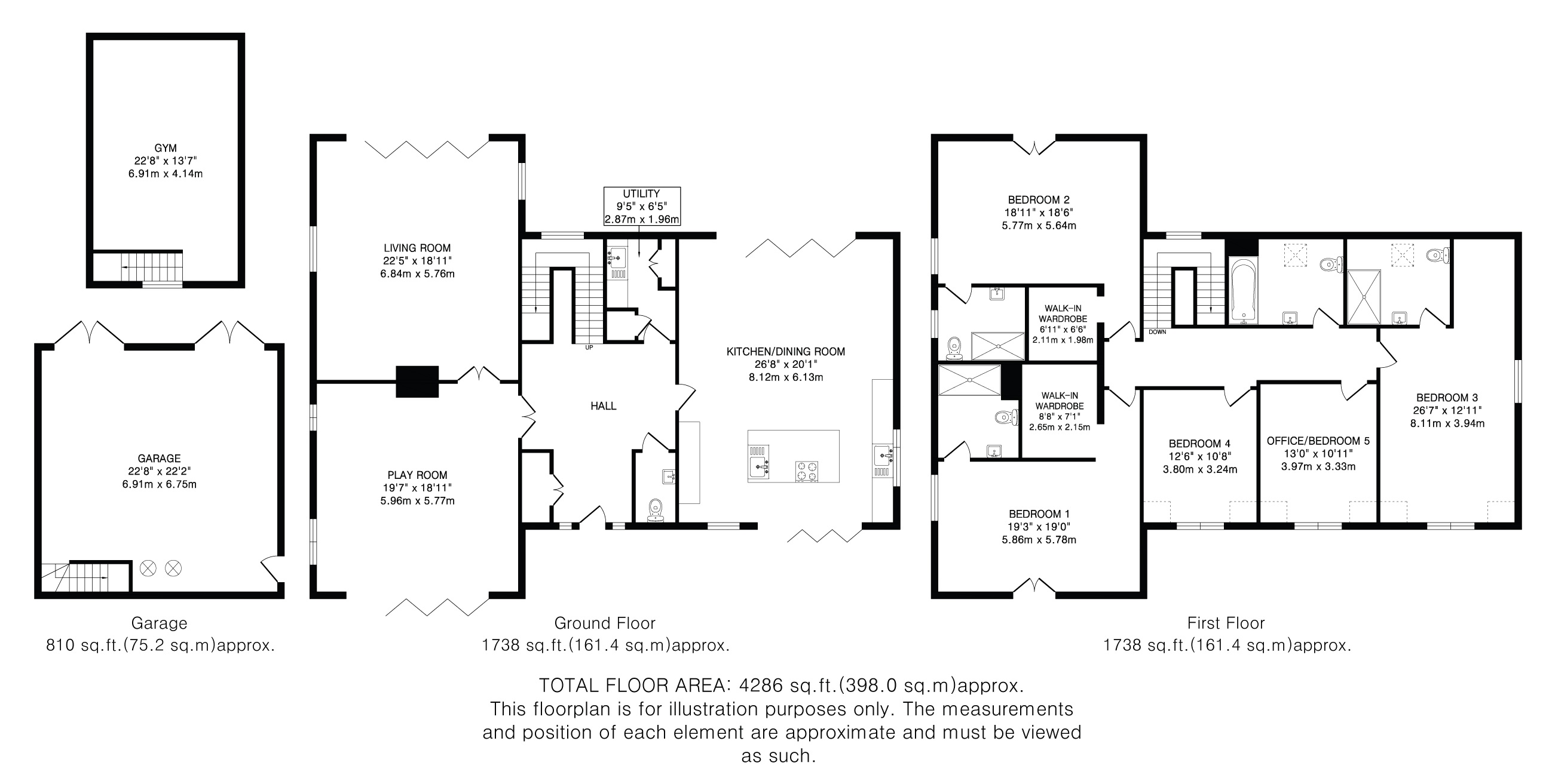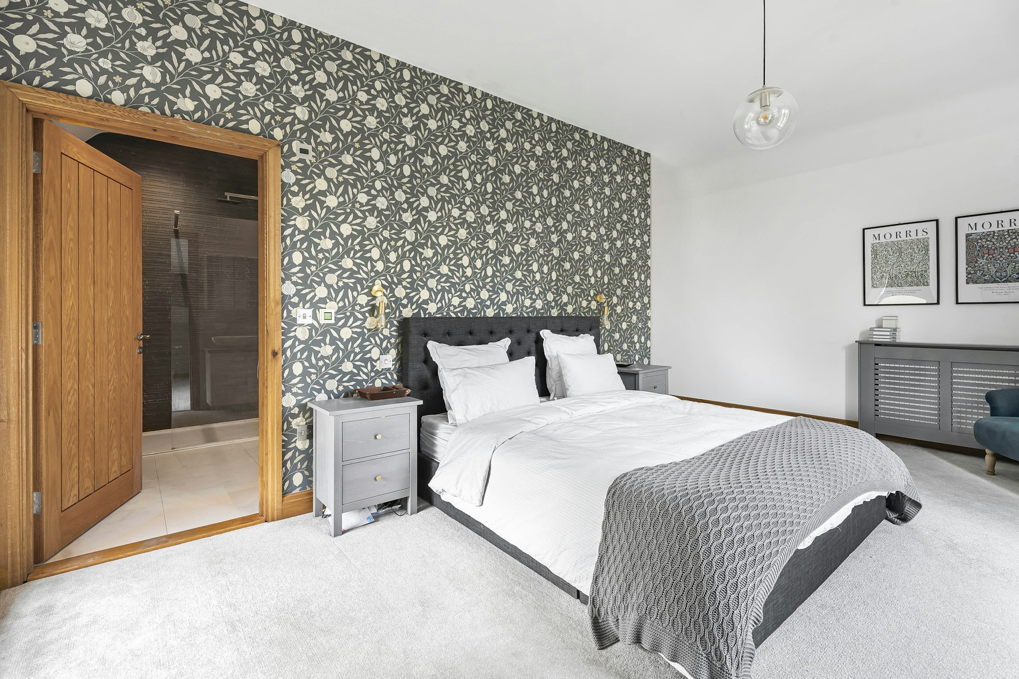Upstairs, there are five generous double bedrooms, including three with en-suite bathrooms and two featuring walk-in wardrobes. A stylish family bathroom completes the accommodation.