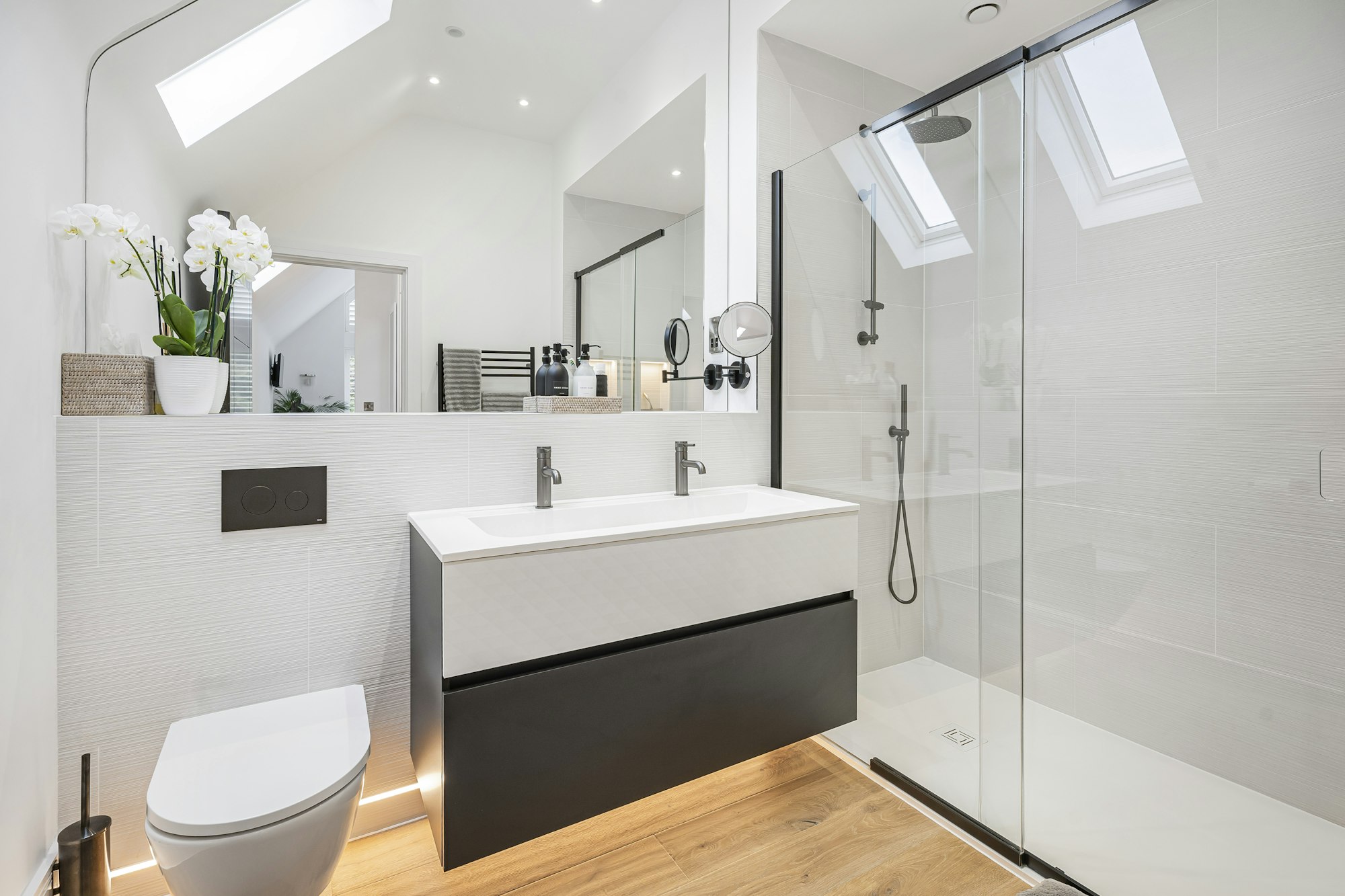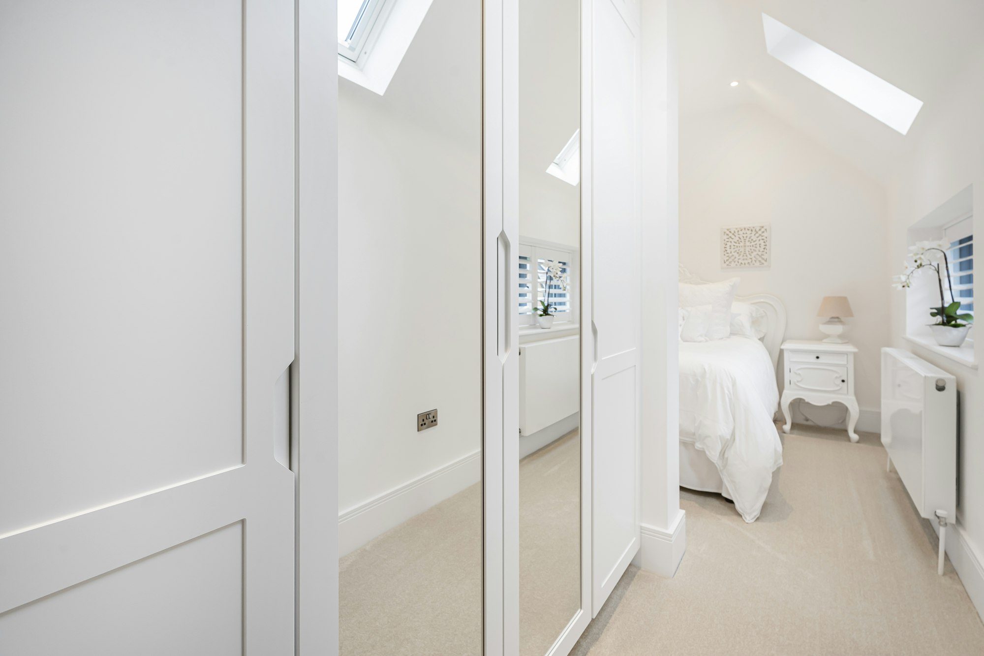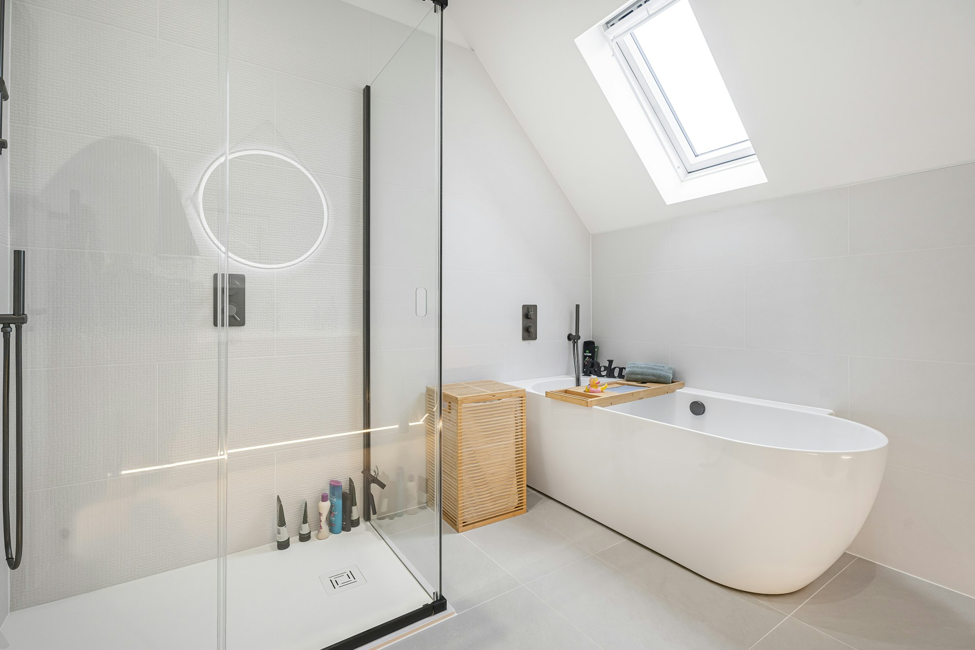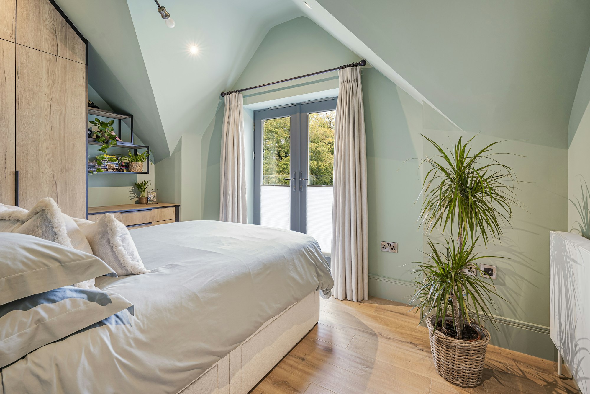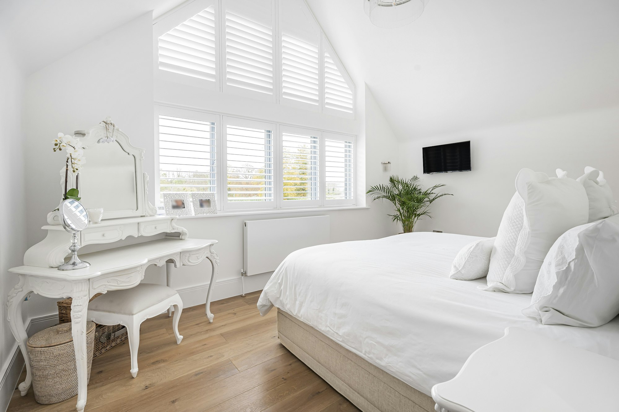 Upstairs, the property has a total of four double bedrooms. The guest bedroom boasts its own en suite shower room, and the stunning principal bedroom suite, complete with vaulted ceiling, has both a dressing room and a luxuriously fitted en suite bathroom. A similarly stylish family bathroom serves the remaining two bedrooms.