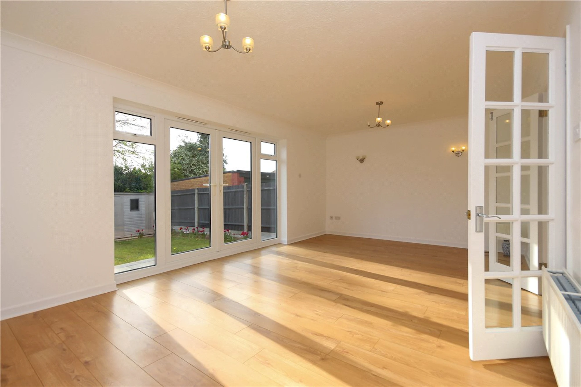 The accommodation briefly comprises: entrance hall, two bedrooms, modern fitted kitchen, bathroom with bath and walk in shower and an open plan living/dining room, with patio doors leading to the rear garden.
