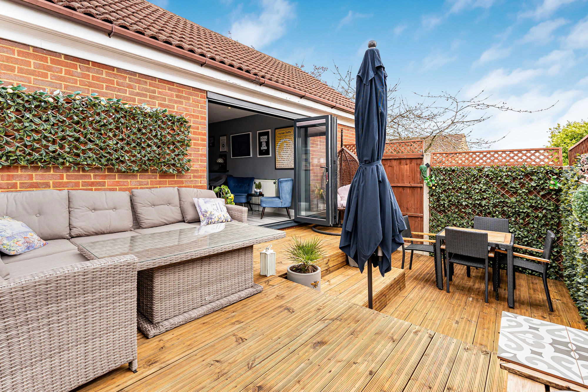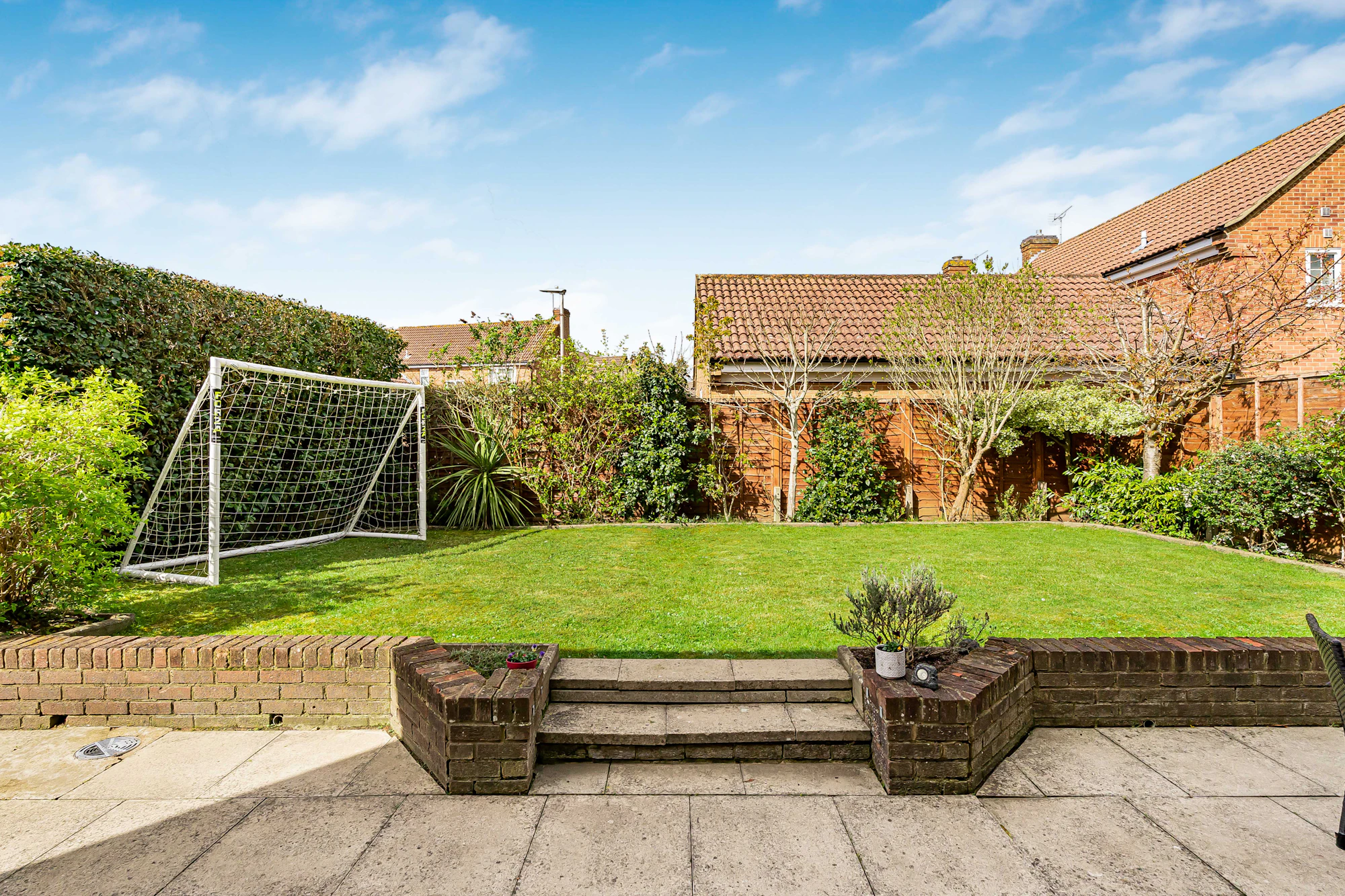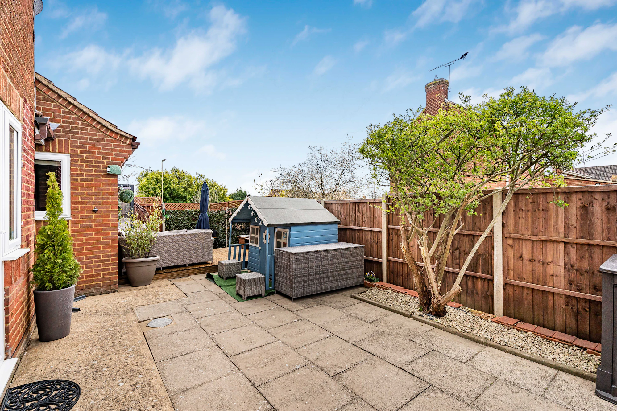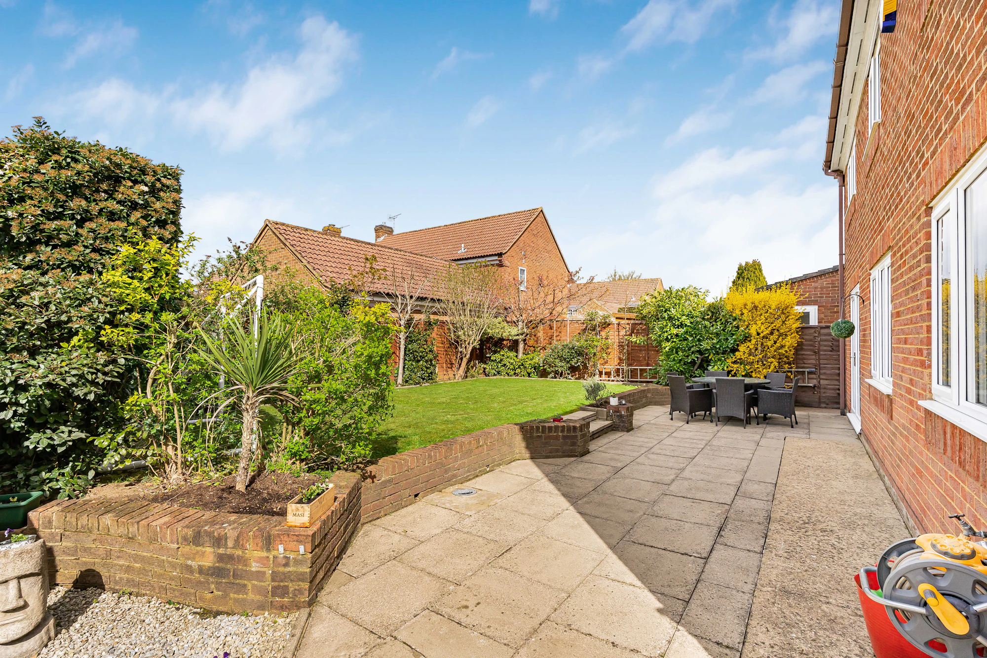 Externally, the property offers a garage and off-road parking to the front. The rear garden is attractively maintained, featuring a paved terrace extending across the width of the property and around the side, with steps leading to a raised lawn.