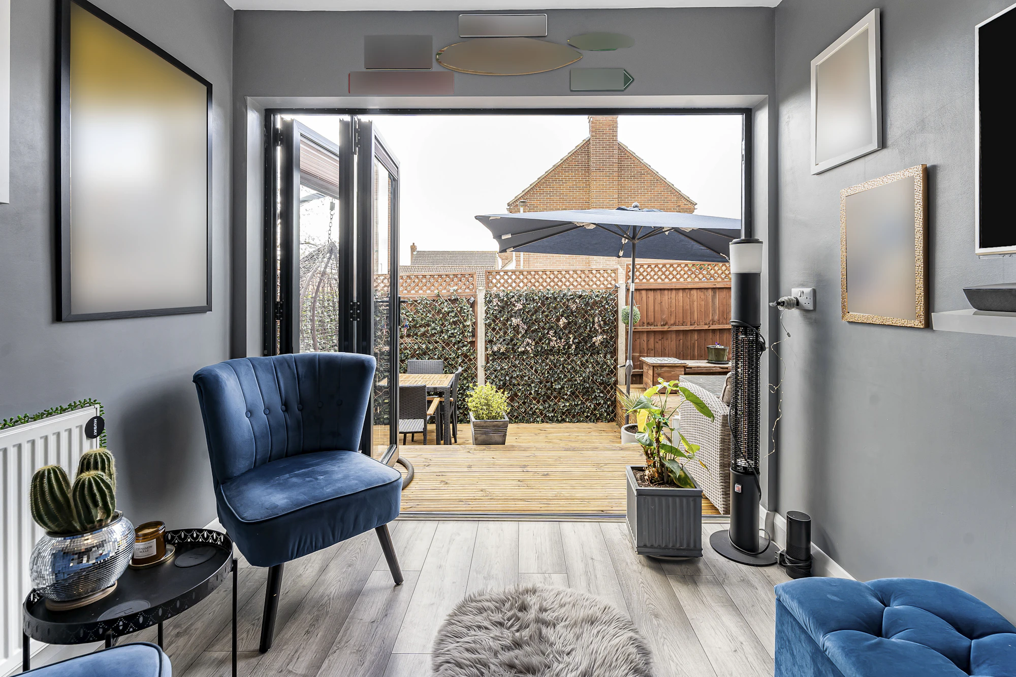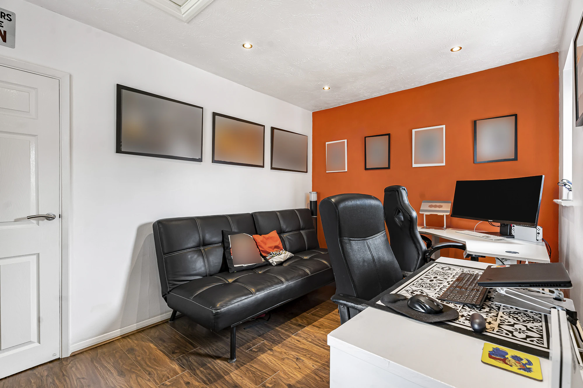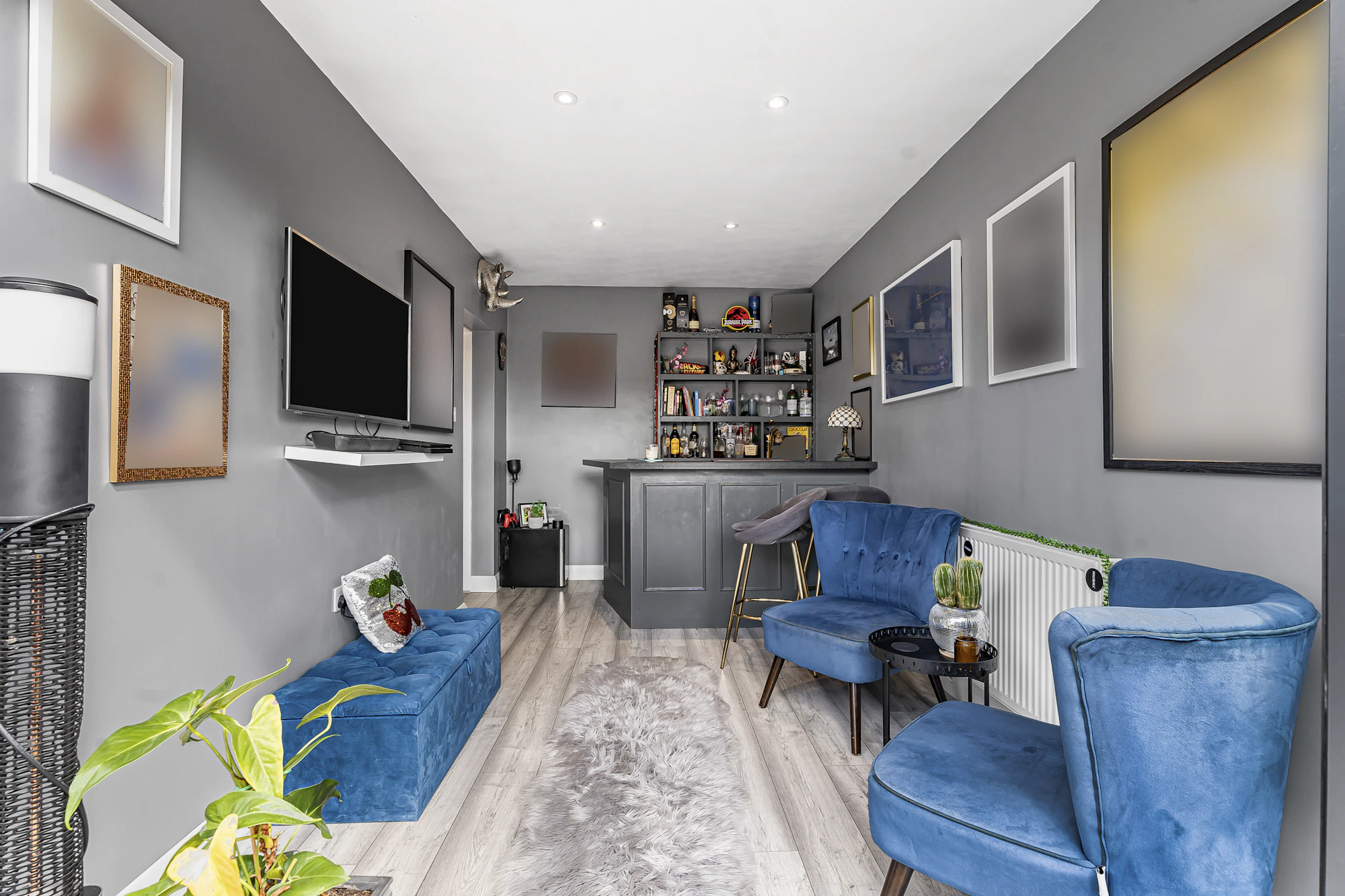 The accommodation comprises a spacious entrance hall with stairs to the first floor and access to all principal ground floor rooms. The dual-aspect living room is generously proportioned and features a contemporary fireplace along with sliding patio doors opening onto the rear garden. There is a separate dining room with a serving hatch to the kitchen, which is fitted with a comprehensive range of modern wall and base units, contrasting work surfaces, integrated oven and gas hob, and access to a useful utility room. Two further reception rooms provide further flexible spaces, one which is ideal for use as a study, playroom or family room and the other currently set up as a bar/entertaining room. A cloakroom/WC completes the ground floor.