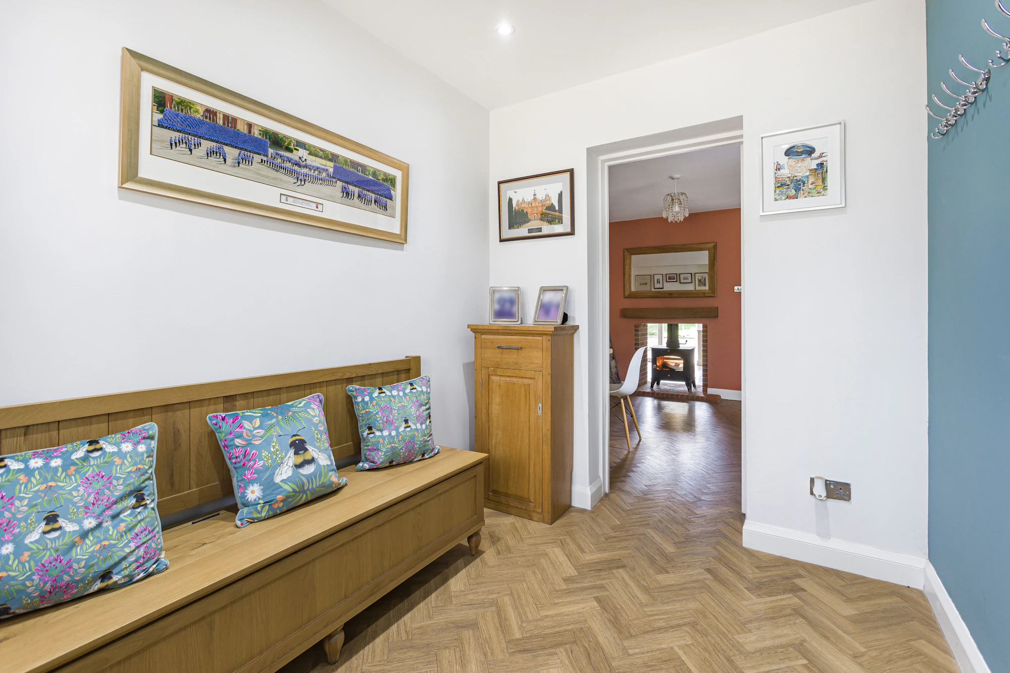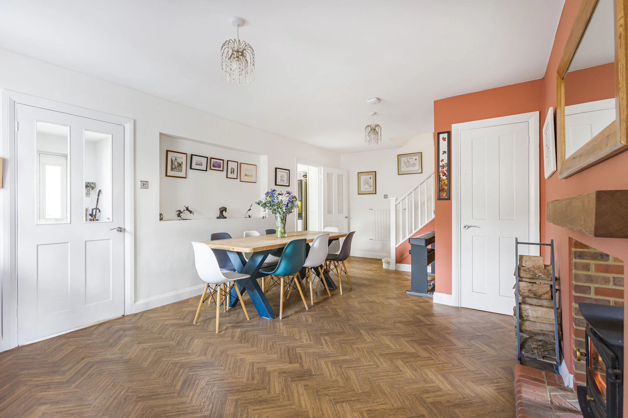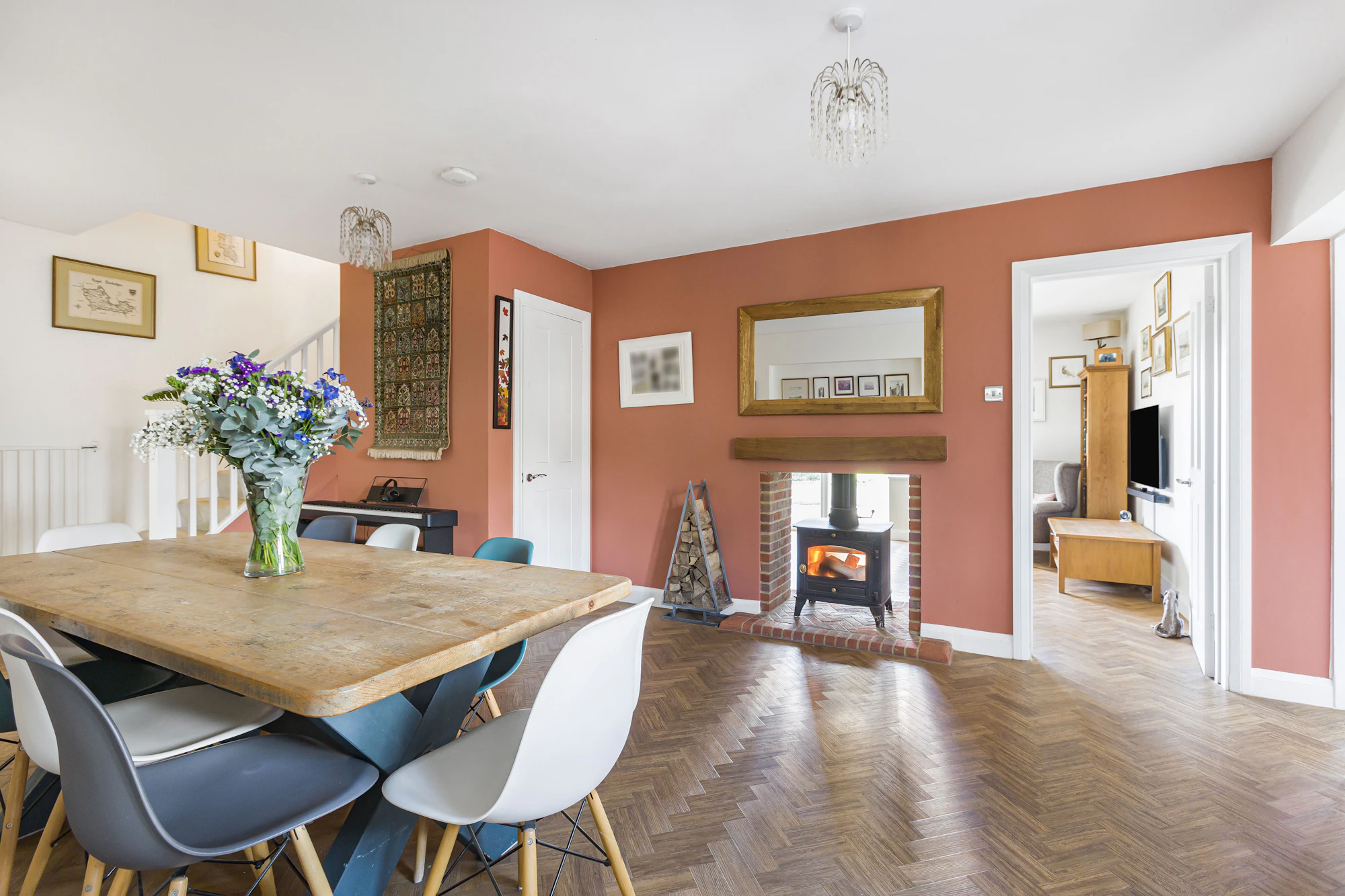 Internally, the house is in excellent decorative order and benefits from a welcoming hallway, a contemporary and modern kitchen/breakfast room and two spacious reception rooms, with a front to back wood burner between them, that are currently used as a dining room and sitting room, the latter of which has French doors out to the rear garden. There is also a separate utility room with external access to the side of the house and a w/c completing the downstairs accommodation