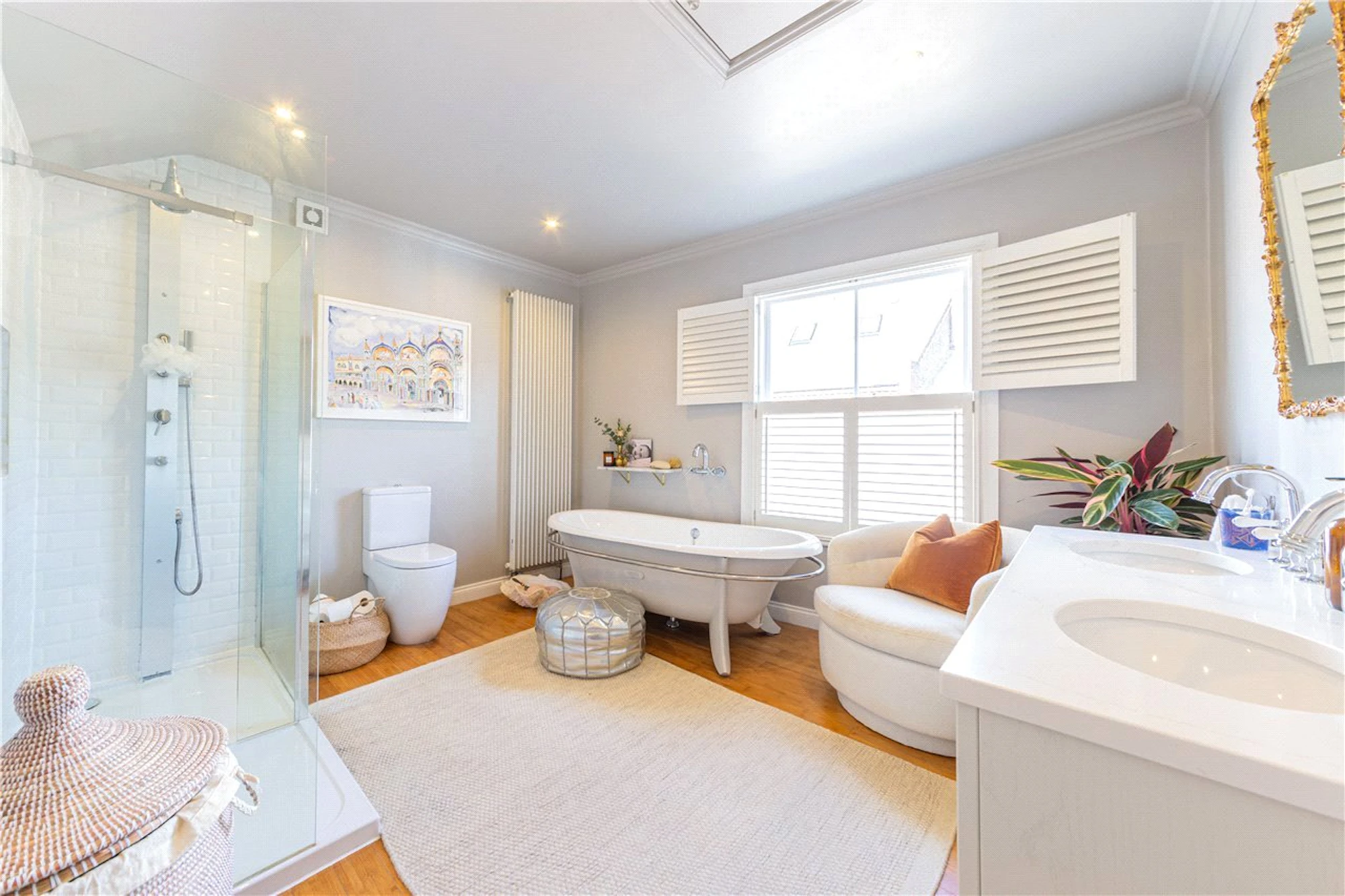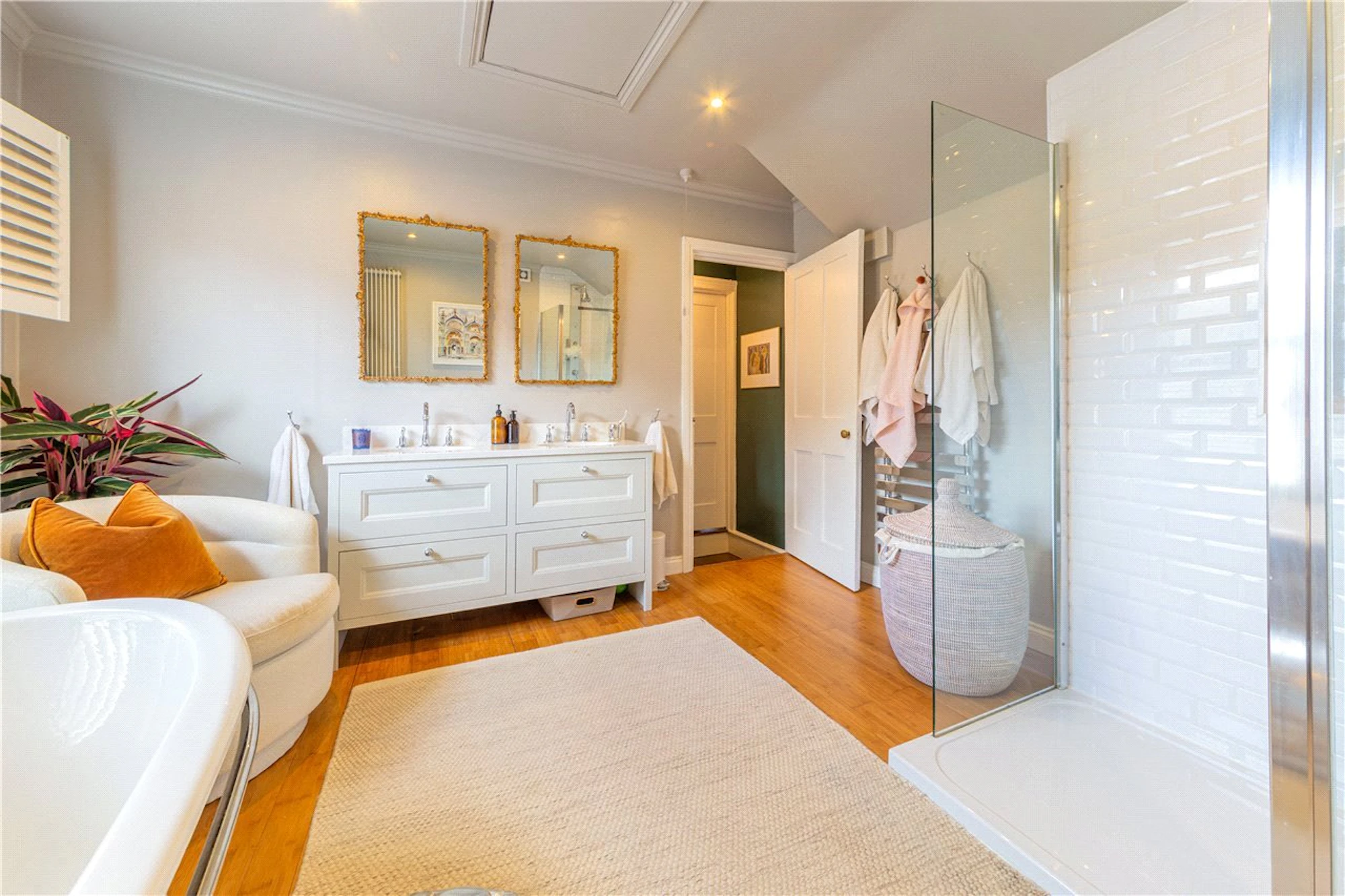 On the first floor, the principal bedroom is of an excellent size with built in storage, a window and a high specification generous size bathroom suite just across the landing and boasts twin wash hand basins, a freestanding bath & bespoke corner shower.