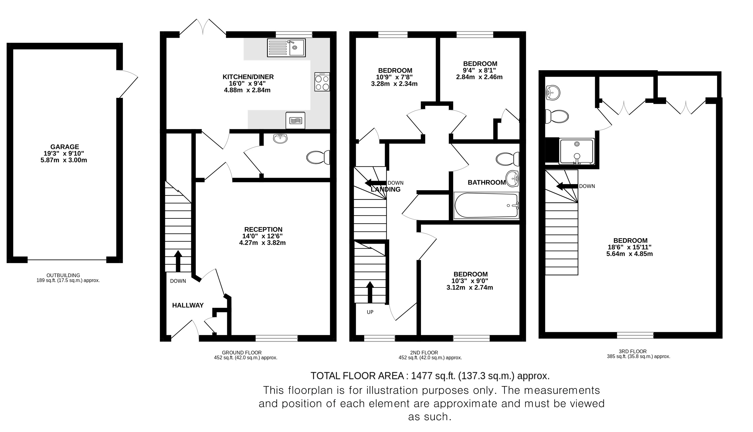The ground floor features an entrance lobby leading into a bright and spacious living room. There is an open-plan kitchen/diner with integrated appliances including a dishwasher, washing machine, double oven, and induction hob. French doors provide direct access to the rear garden. On the first floor, three generously sized bedrooms are accompanied by the family bathroom. The second floor is dedicated entirely to the impressive principal bedroom with Hammonds fitted wardrobes and a modern ensuite bathroom.