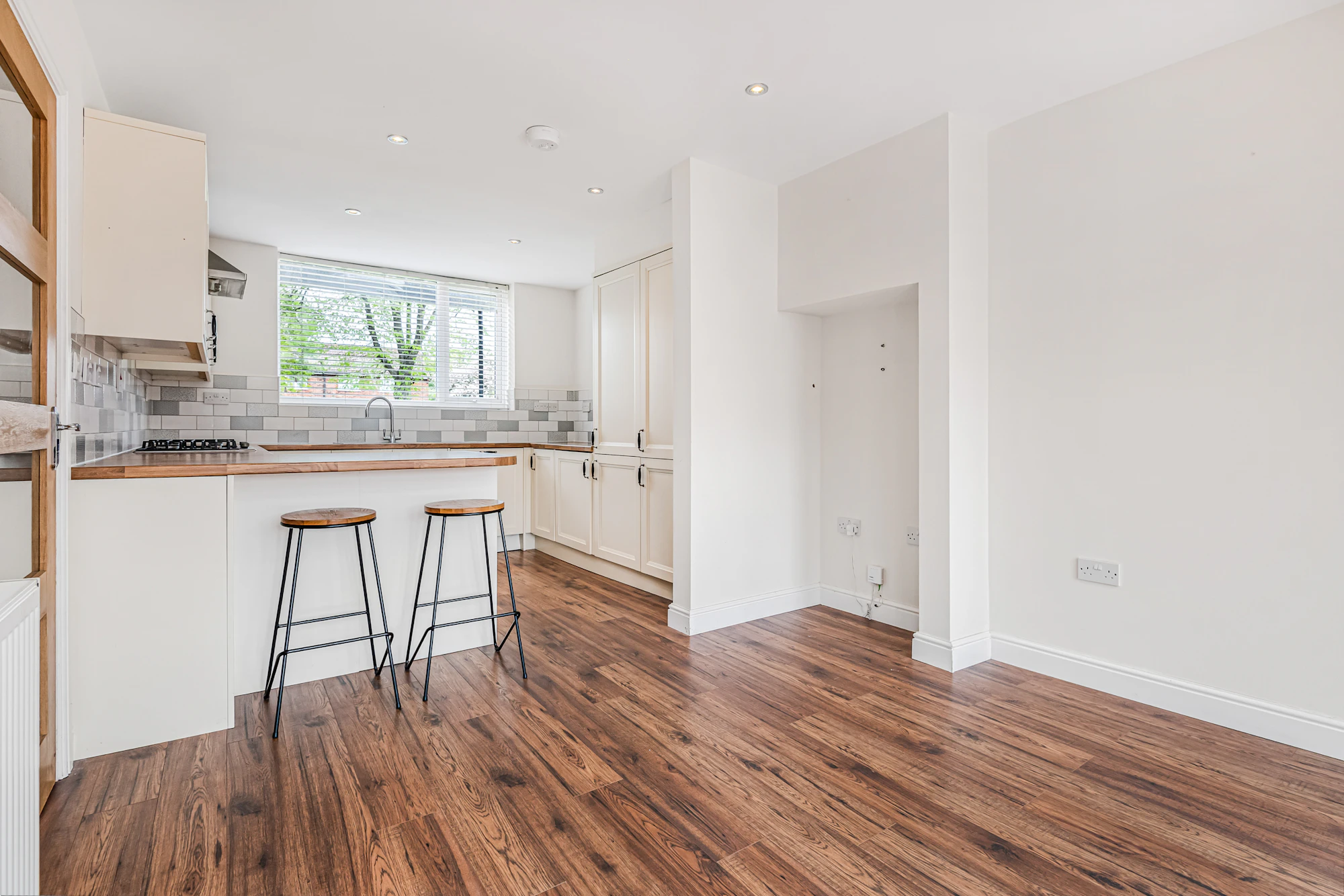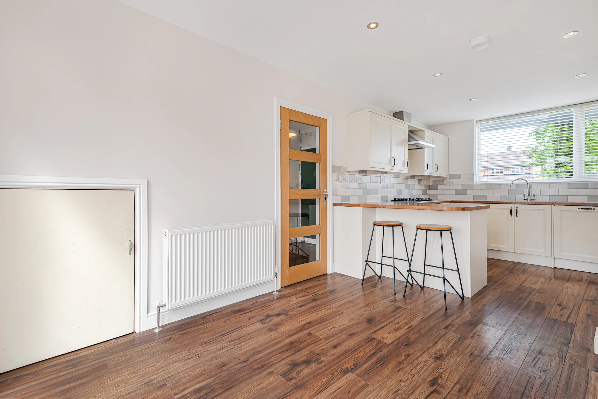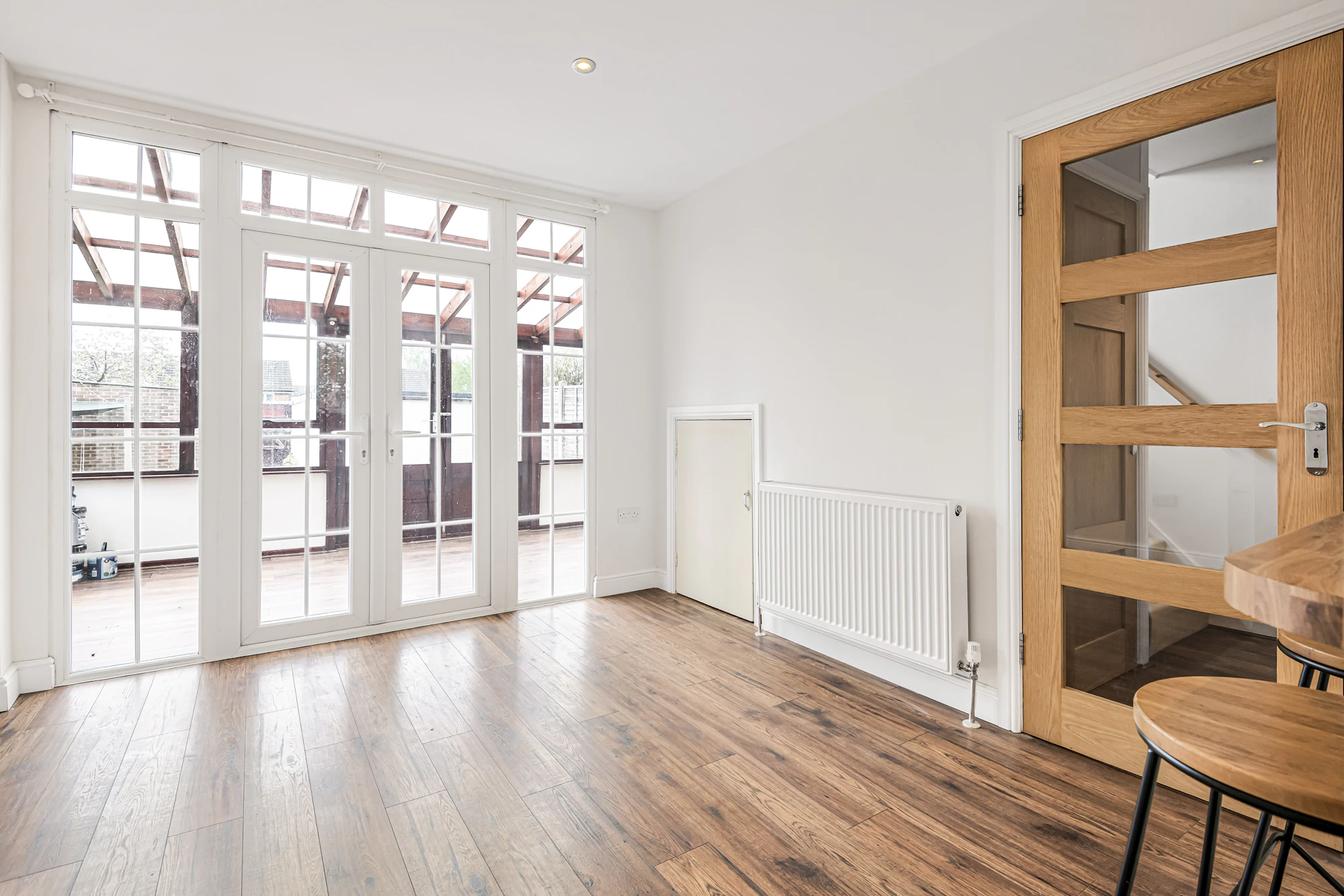 The ground floor accommodates a large dual aspect kitchen/dining room where natural light streams in through large windows and there are French doors to the rear which connect to a conservatory with views of the garden. The modern and fully equipped kitchen offers an abundance of storage options, high-quality appliances, and plenty of countertop space with a breakfast bar for informal dining.