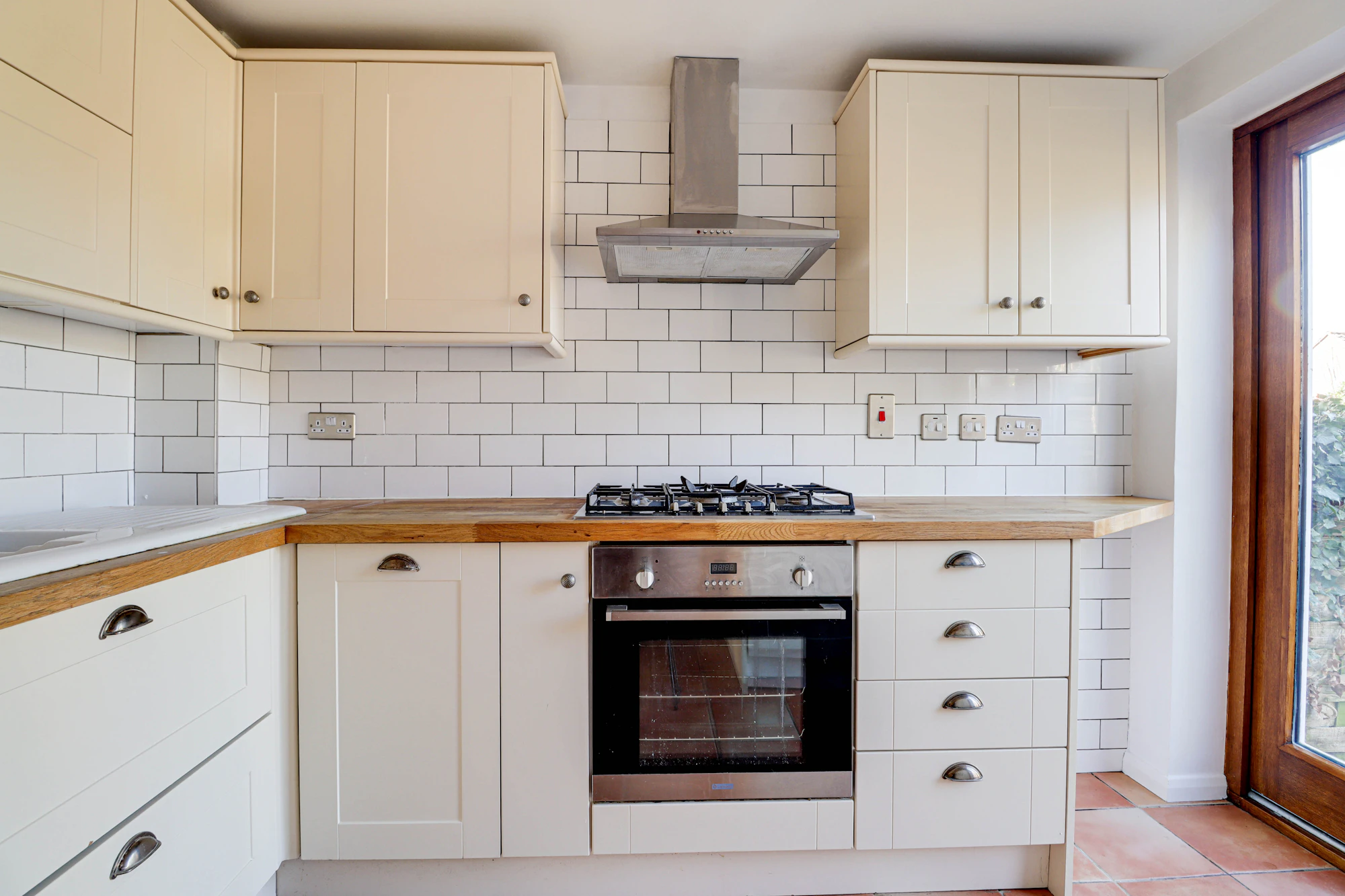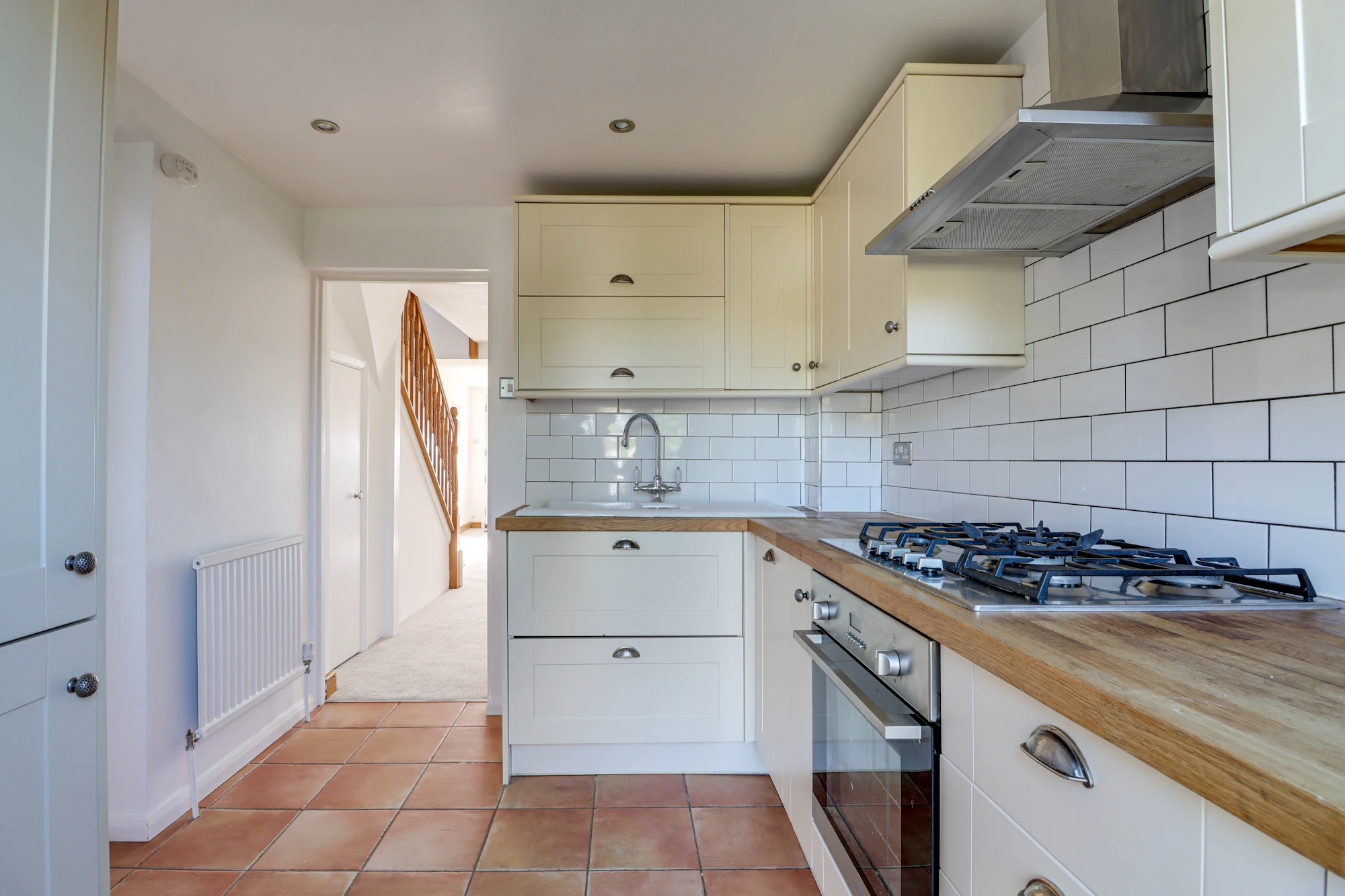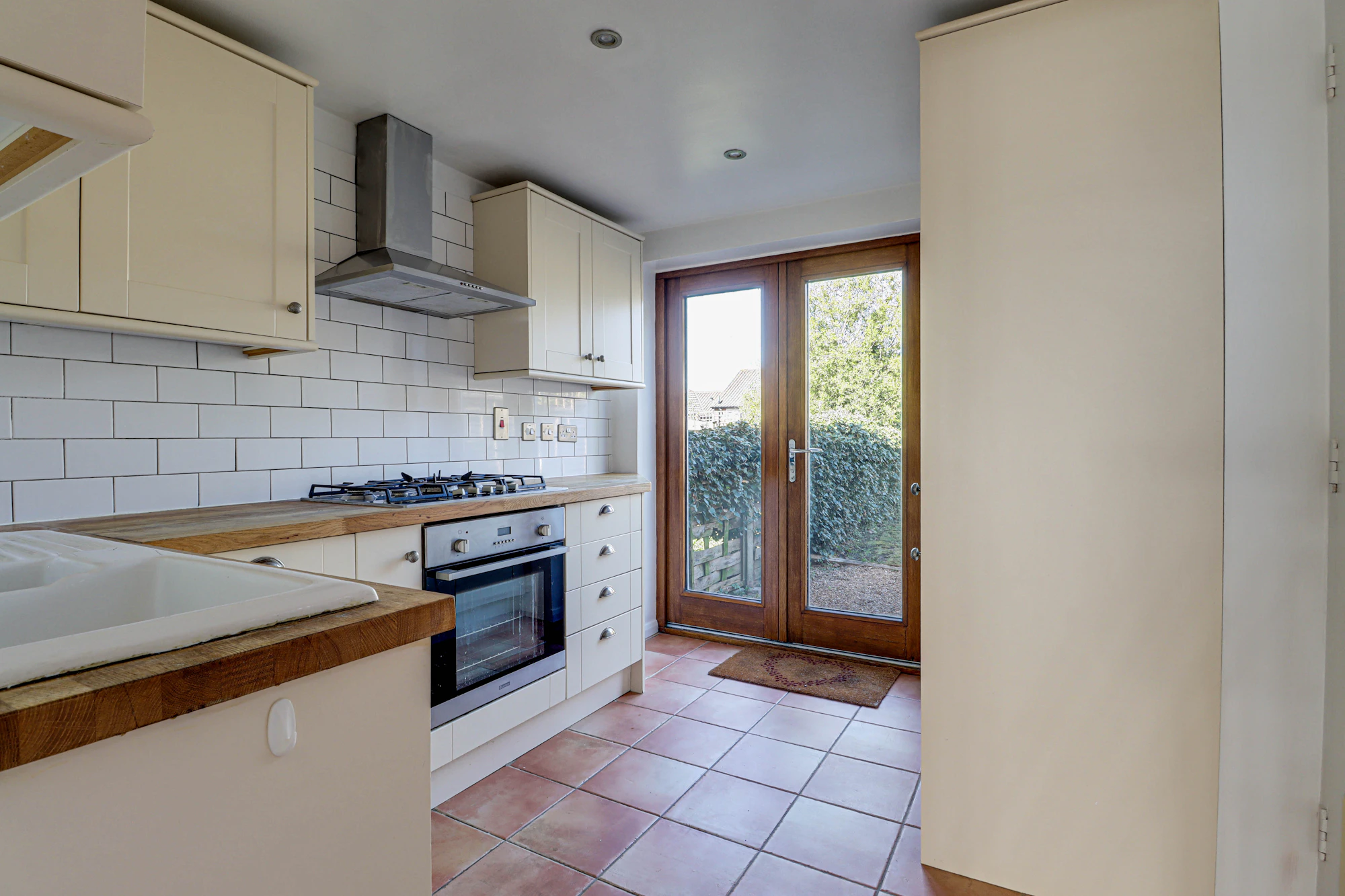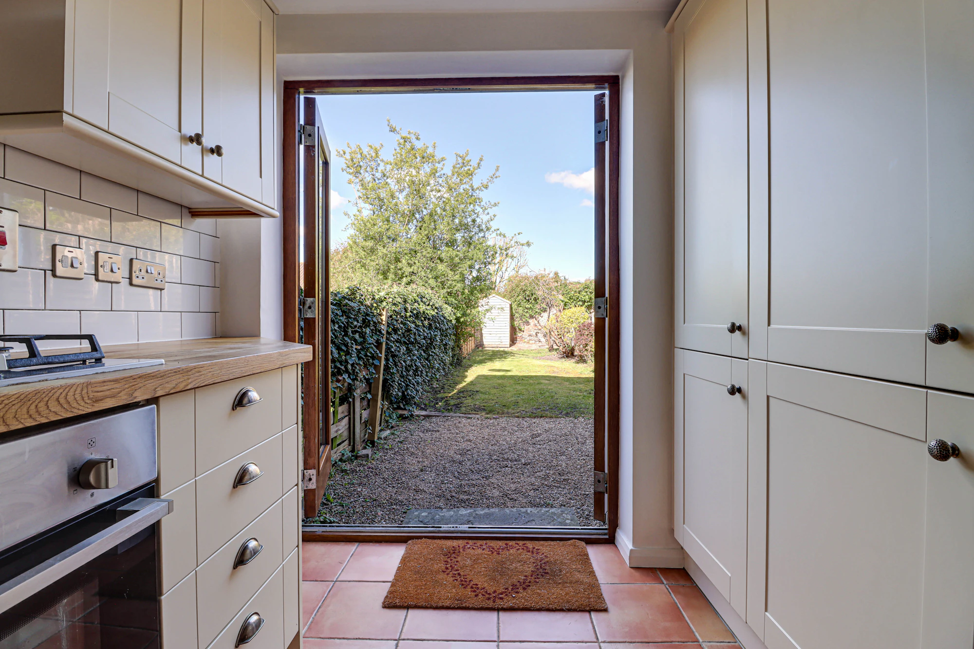 To the rear of the property, the kitchen is fully tiled and designed to offer good storage and workspace. Double doors open directly onto the garden and there is a separate adjoining utility room adjacent.