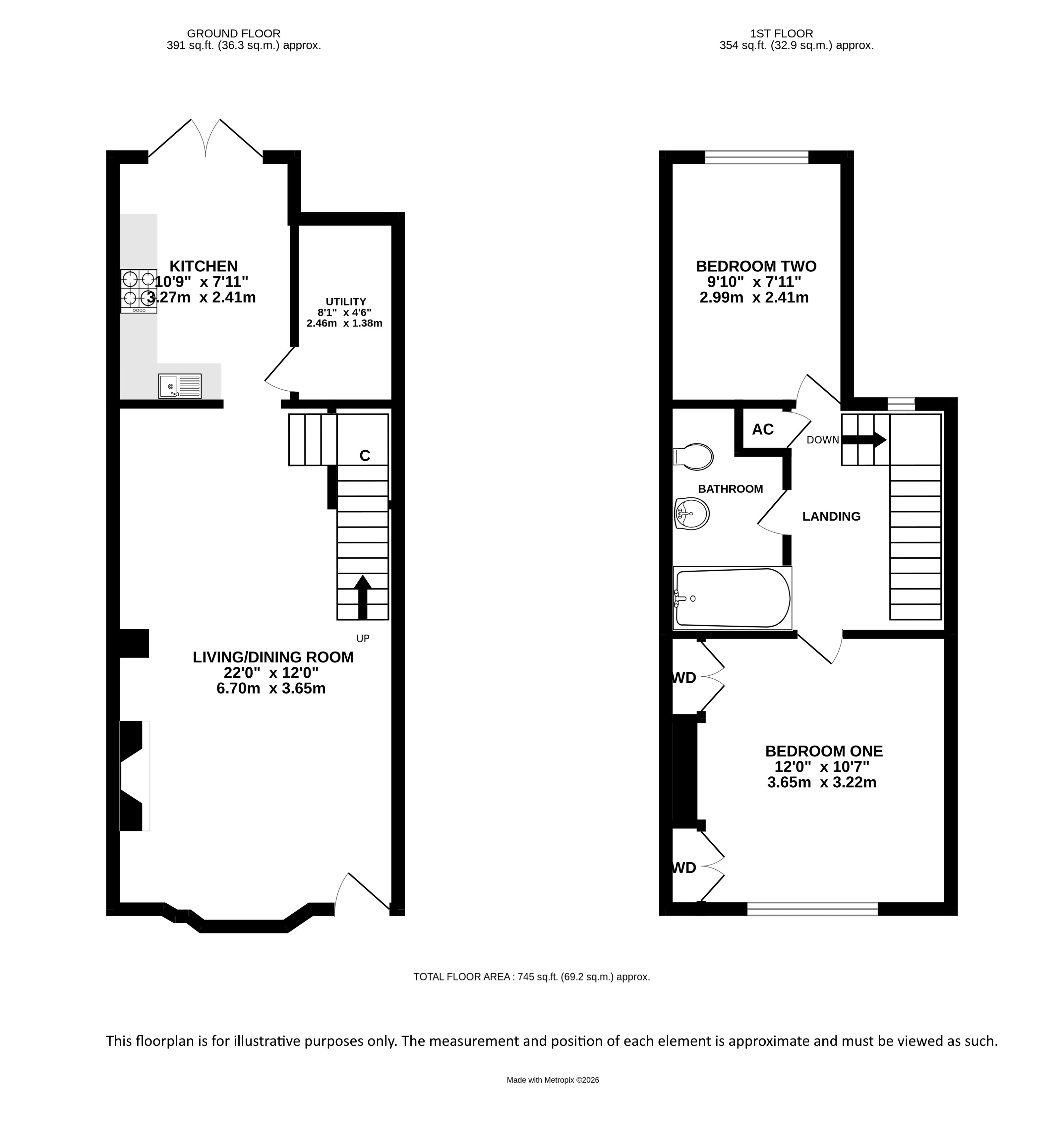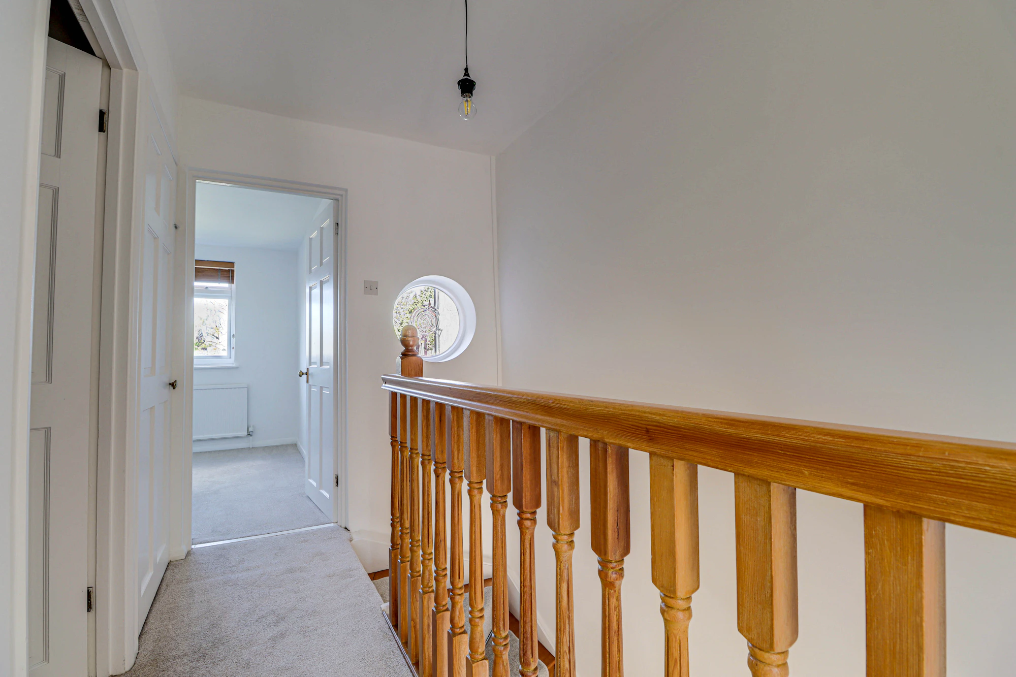 Upstairs, the first floor accommodates two well-proportioned bedrooms, both comfortable and light-filled, with the principal bedroom benefiting from fitted storage. A spacious bathroom is accessed from the landing.