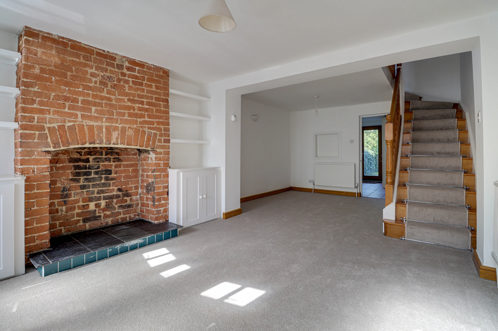 The front door opens into an airy open-plan reception room with plenty of space for living and dining furniture, featuring an attractive exposed brick fireplace and a delightful curved bay window to the front.