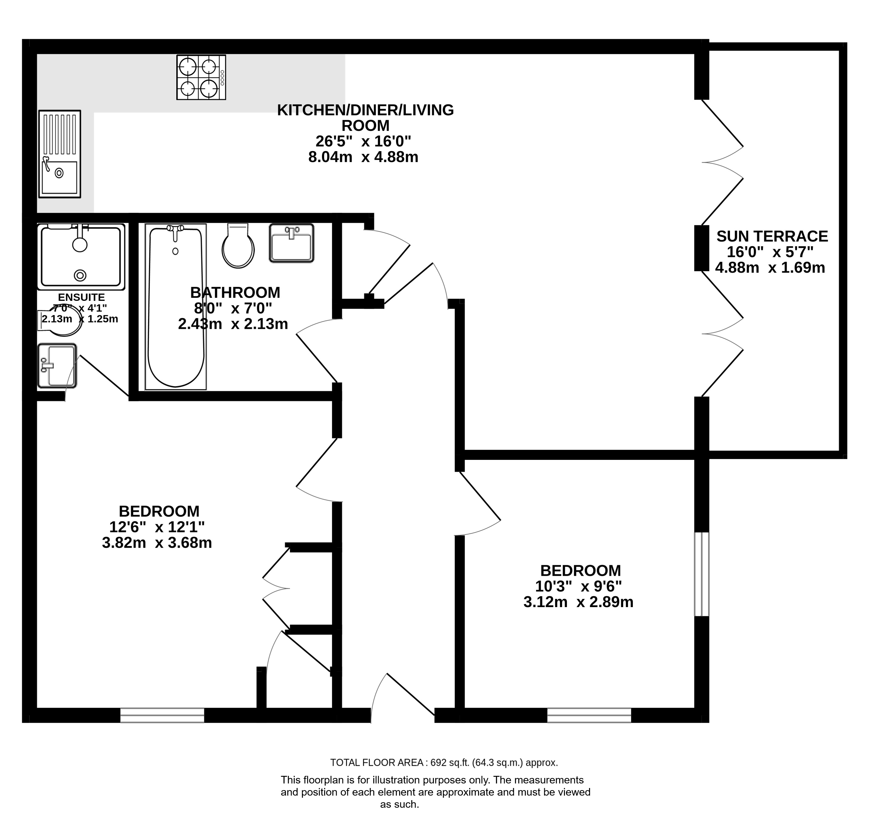 The apartment benefits from its own private front door, opening into a spacious open-plan kitchen and living area. The kitchen is fully fitted with integrated appliances, including an oven, fridge/freezer, dishwasher, and washer/dryer. The master bedroom features an en-suite bathroom, while the second double bedroom is served by a separate family bathroom.