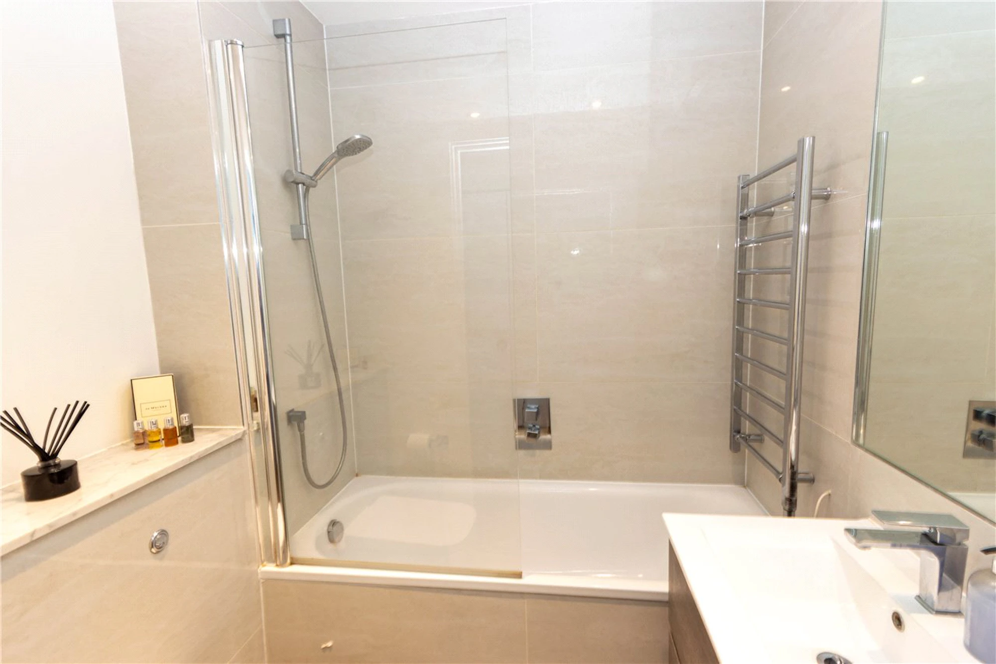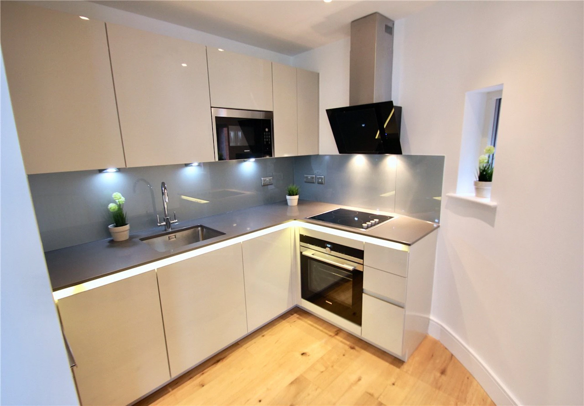 The high gloss fitted kitchen has soft close units, fully fitted with Siemens integrated electric oven, hob, dishwasher, washer/dryer and fridge/freezer. Both double bedrooms have fitted wardrobes offering great storage space and the luxury bathroom suite has a shower fitting over the bath.