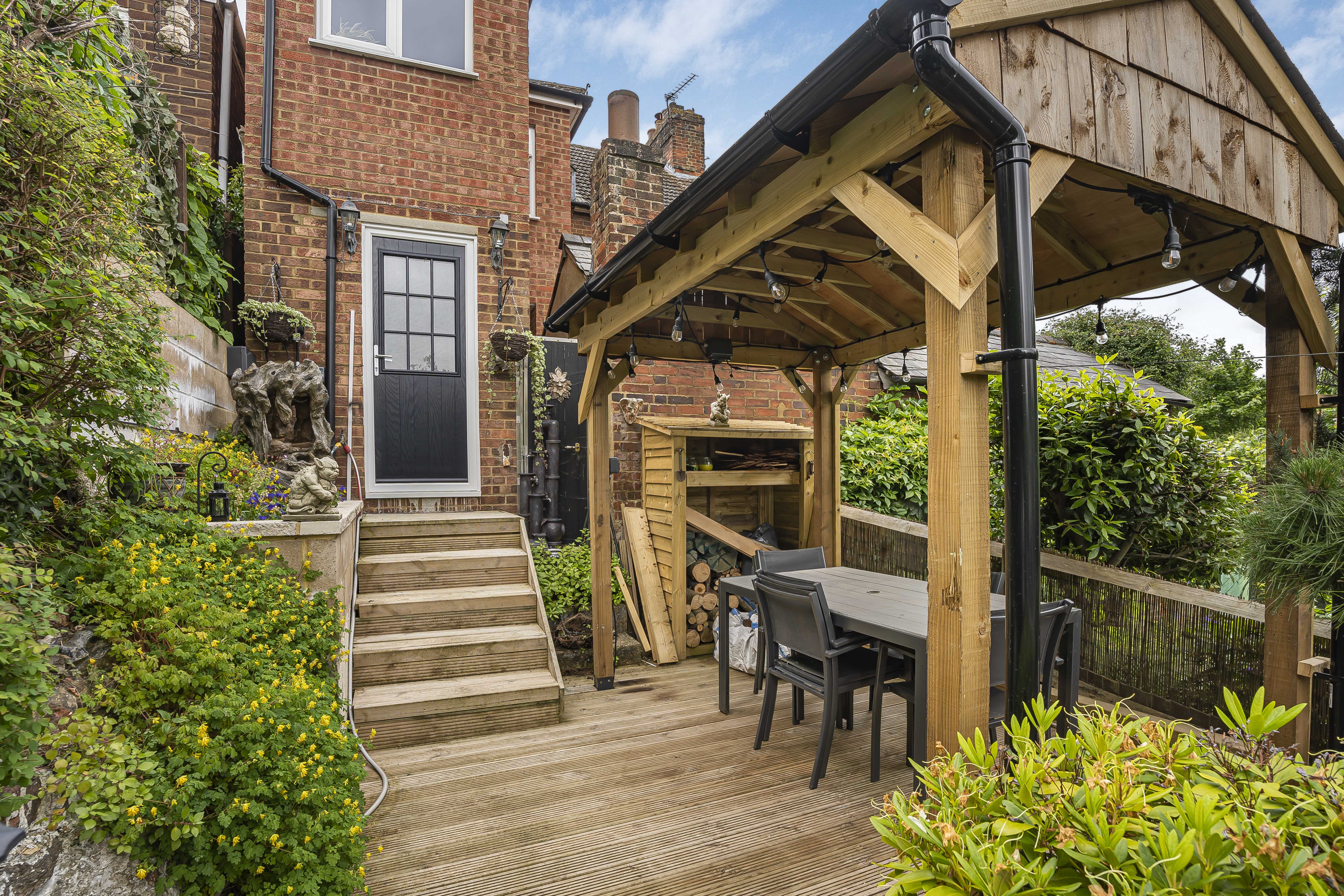 Outside, the front garden is enclosed by a decorative brick and iron fence, with a paved pathway leading to the front door and a patio area surrounded by a variety of plants, shrubs, and trees' perfect for potted plants and seasonal colour. The landscaped rear garden is tiered, featuring a raised decked seating area with power and lighting, which leads down to a low-maintenance shingled section. There are well-established borders with mature trees and shrubs, along with an additional decked seating area at the rear, complete with a wooden shed. The garden also enjoys far-reaching views over Windmill Hill, providing a lovely backdrop for outdoor living.
