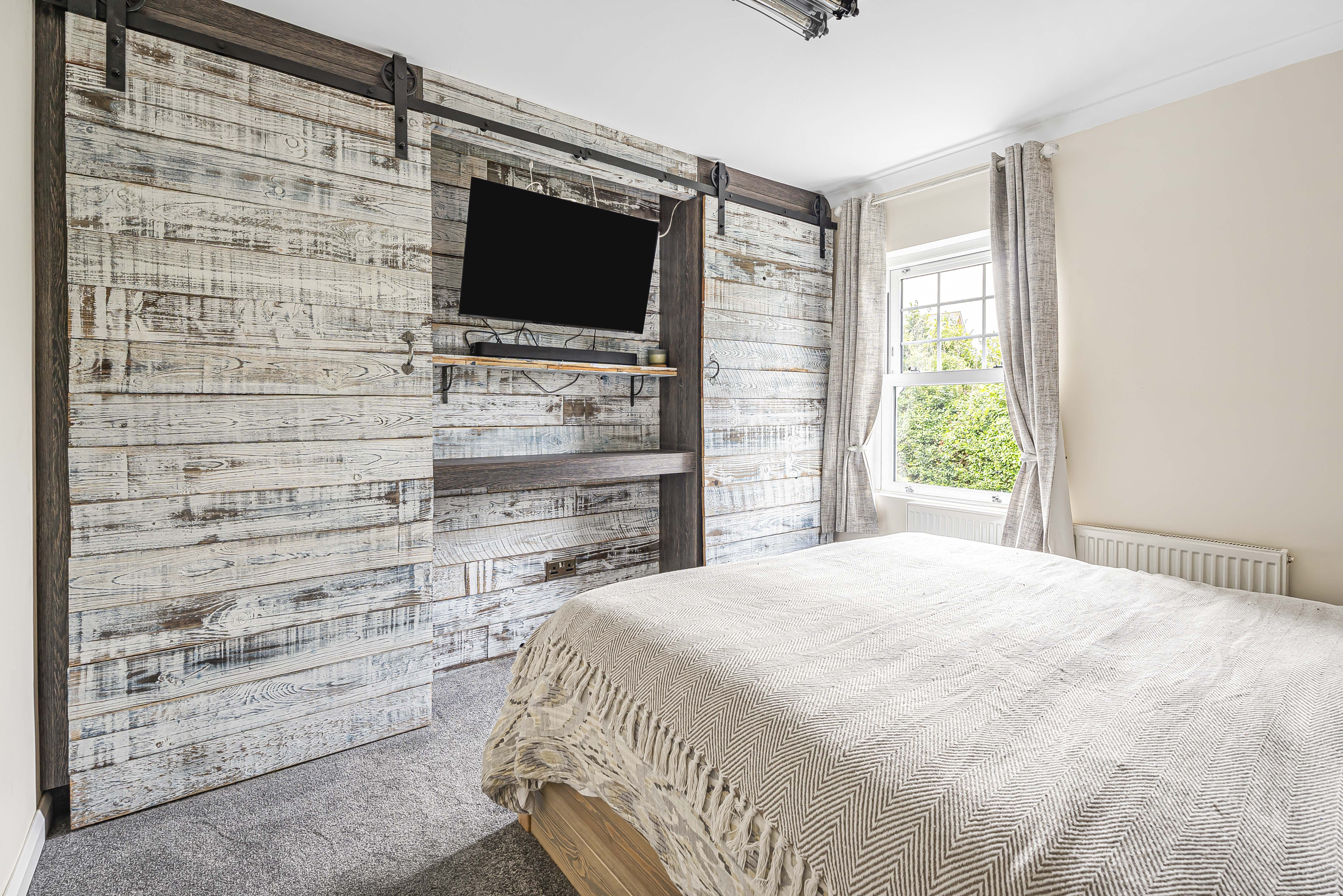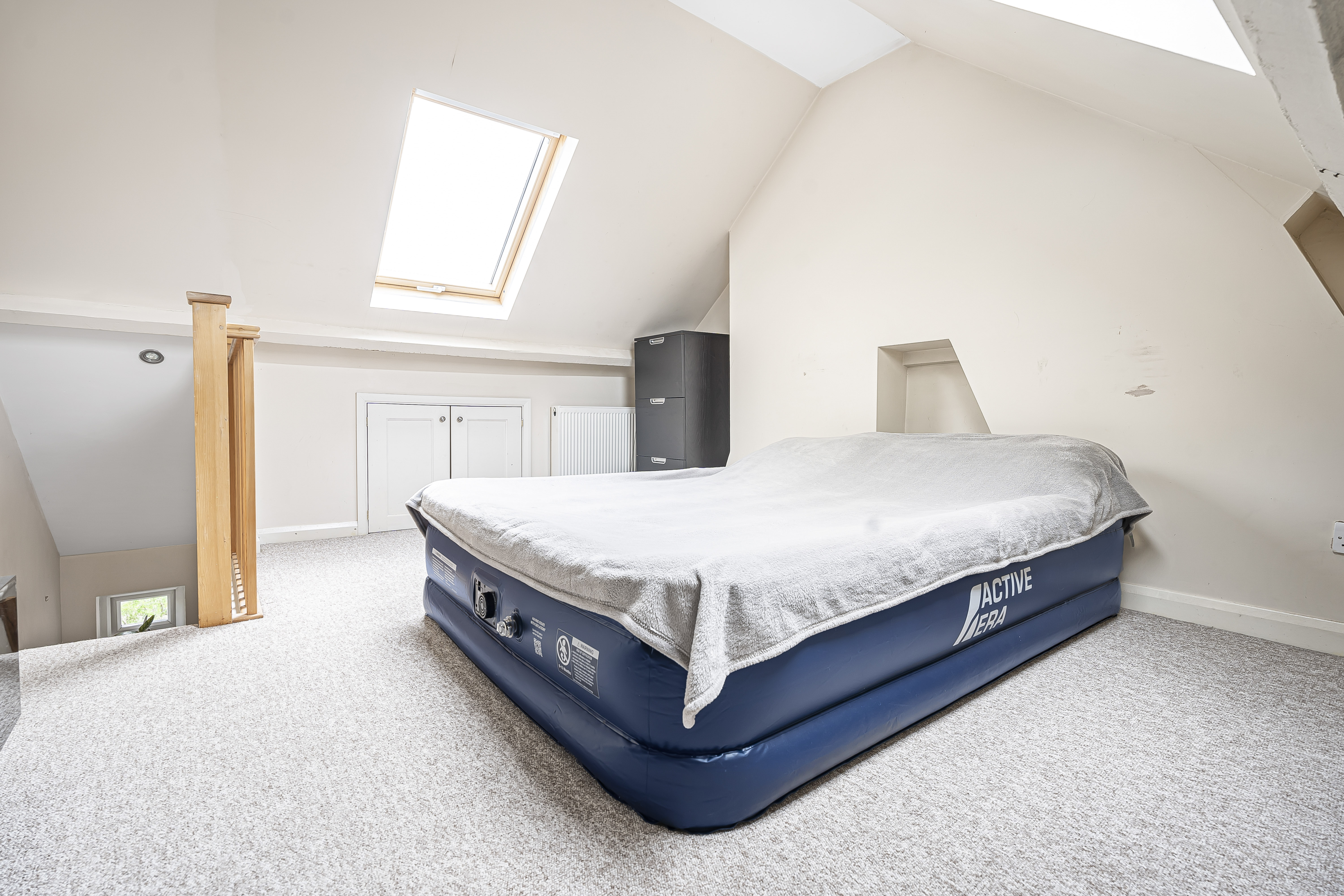 On the first floor, there are two double bedrooms, including the principal bedroom which benefits from fitted wardrobes. Both are served by a modern family bathroom. The second floor offers a further bedroom with Velux windows, providing a flexible space that could be used as a guest room, office, or playroom.