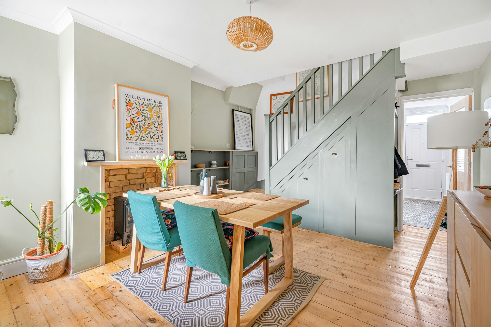 You enter into a bright and inviting living room featuring wooden flooring and a bay fronted window that floods the space with natural light. This leads through to a separate dining room, also with wooden flooring, where you’ll find stairs leading to the first floor and useful built-in storage.