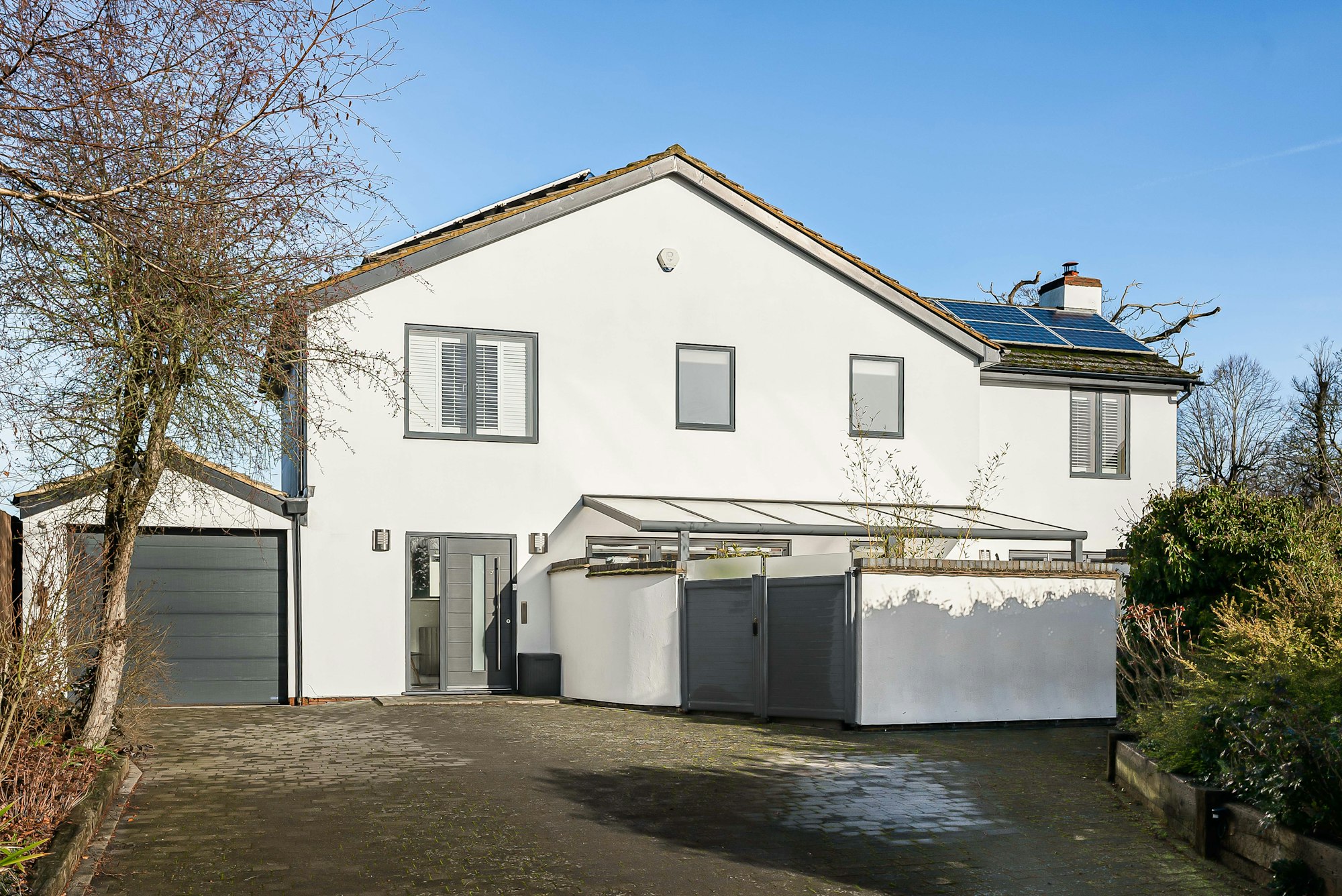 Outside, the front of the property offers a generous driveway, partly shingled and partly block paved, providing off-road parking for several vehicles. Established borders of plants, shrubs, and trees lead to a garage with an electric up-and-over door and electric vehicle charging facilities.