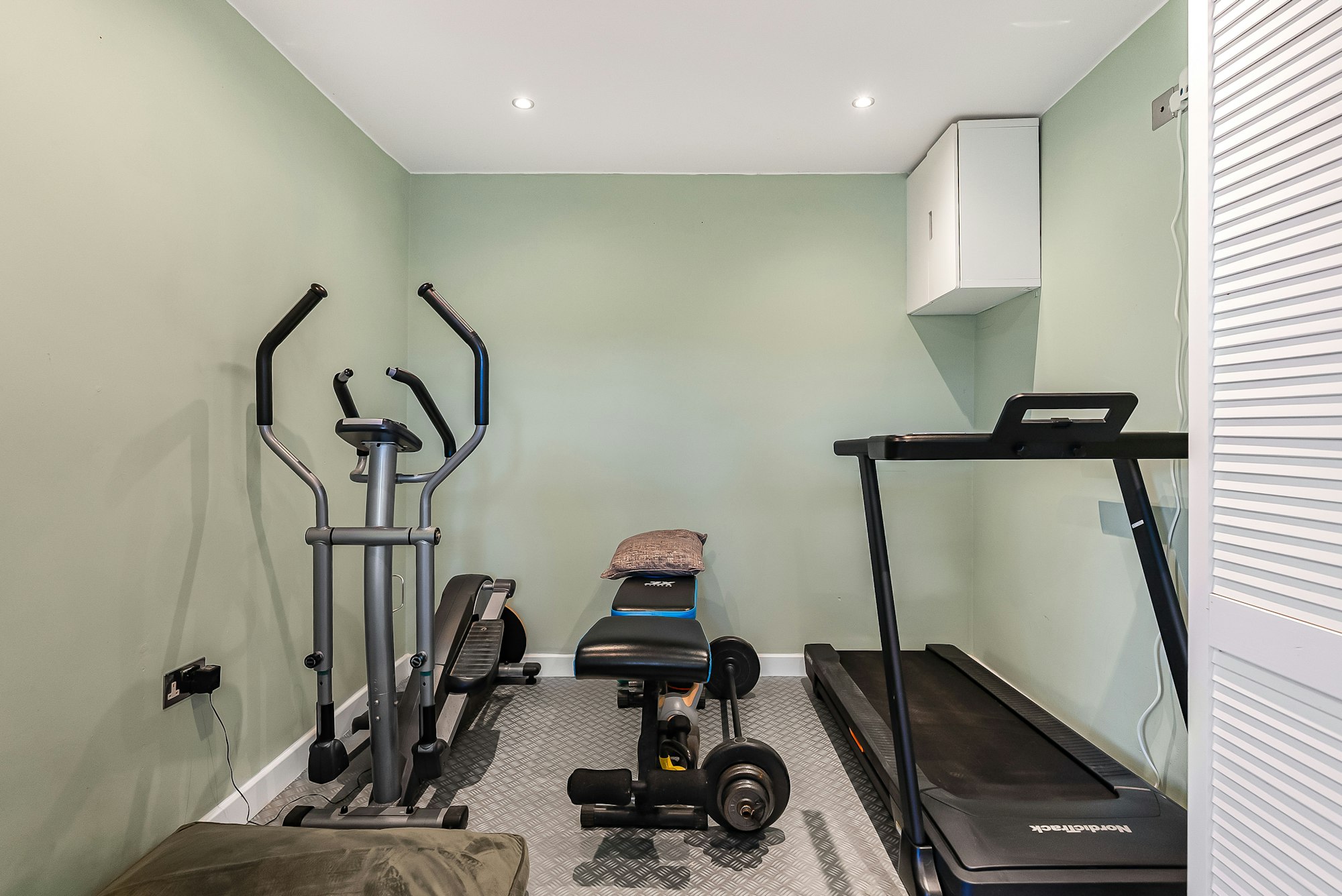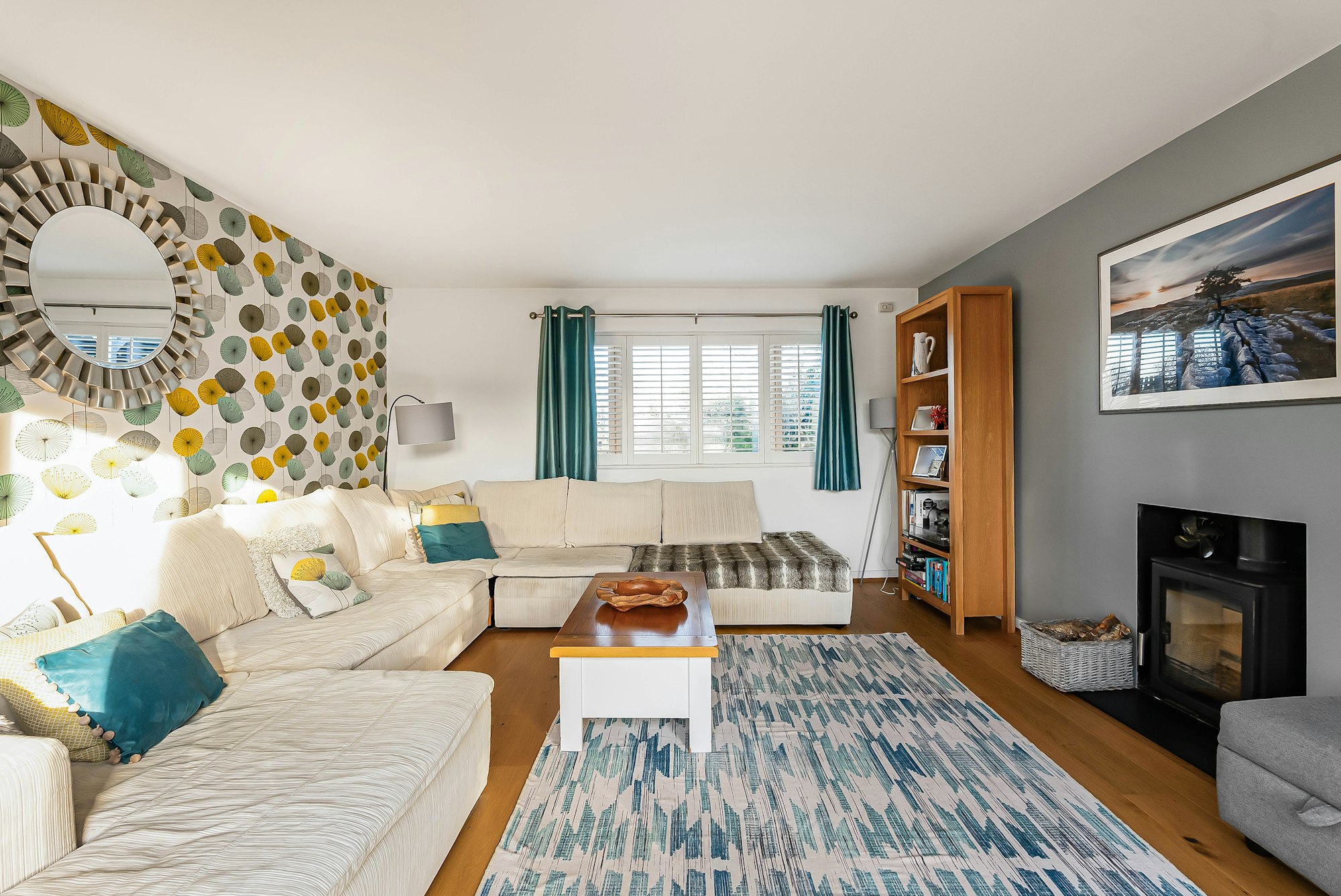 Adjoining the kitchen is a useful utility room, along with a further reception room currently used as a gym, offering excellent versatility. Subject to the relevant approvals, this room could be opened into the kitchen and dining space to create an even larger area for entertaining. A generous sitting room features a wood-burning stove and additional bi-folding doors opening onto the front decked area, allowing indoor and outdoor living to blend seamlessly during the warmer months. A convenient downstairs WC completes the ground floor.