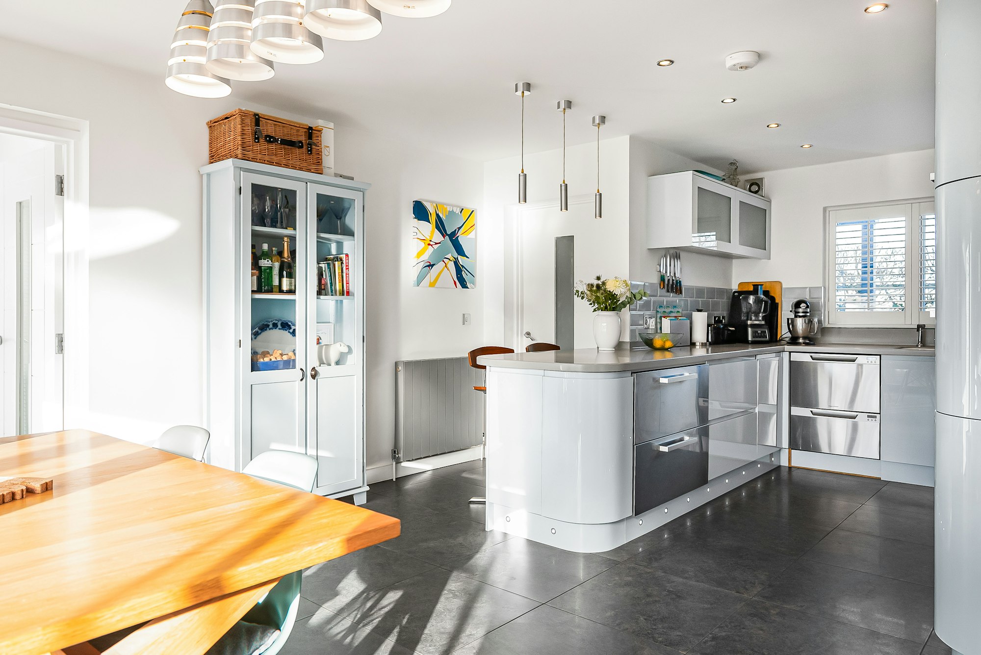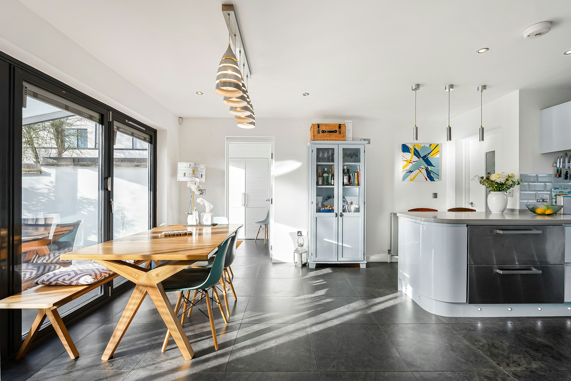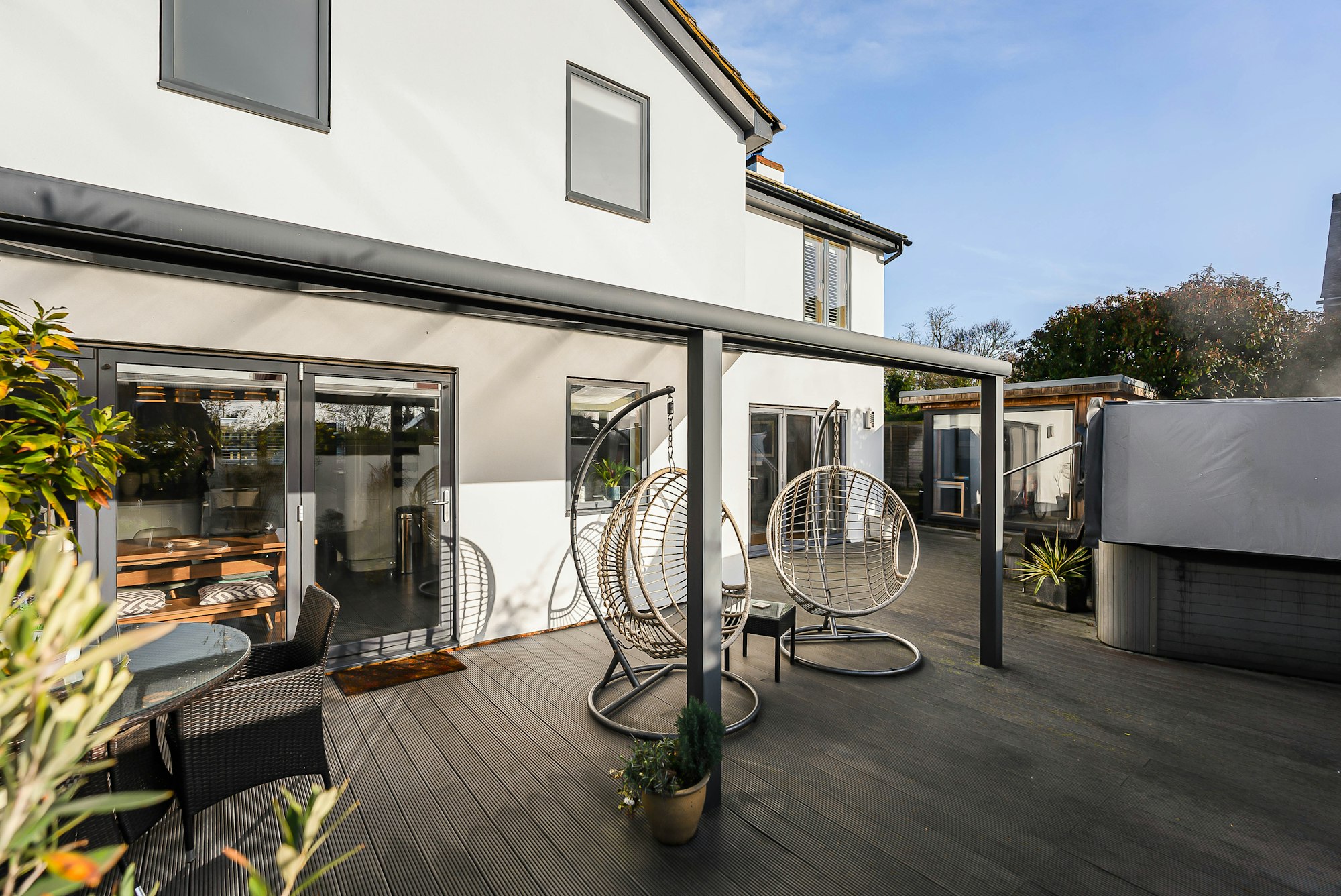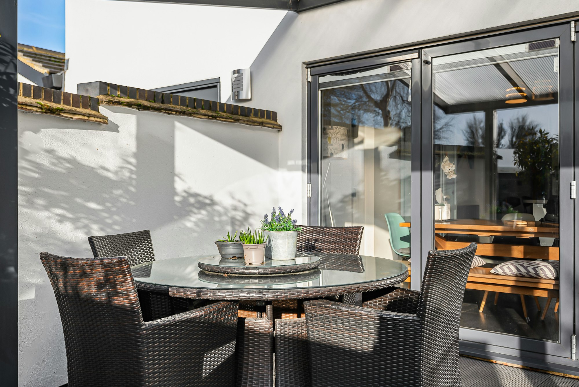 The ground floor begins with a welcoming porch leading into a contemporary open-plan kitchen and dining room. The bespoke Silkwood kitchen provides ample storage, integrated appliances, and Corian worktops, flowing seamlessly into the dining area. Bi-folding doors open onto a private, decked garden to the front of the property, which is sheltered by a veranda and benefits from a desirable south-facing aspect.