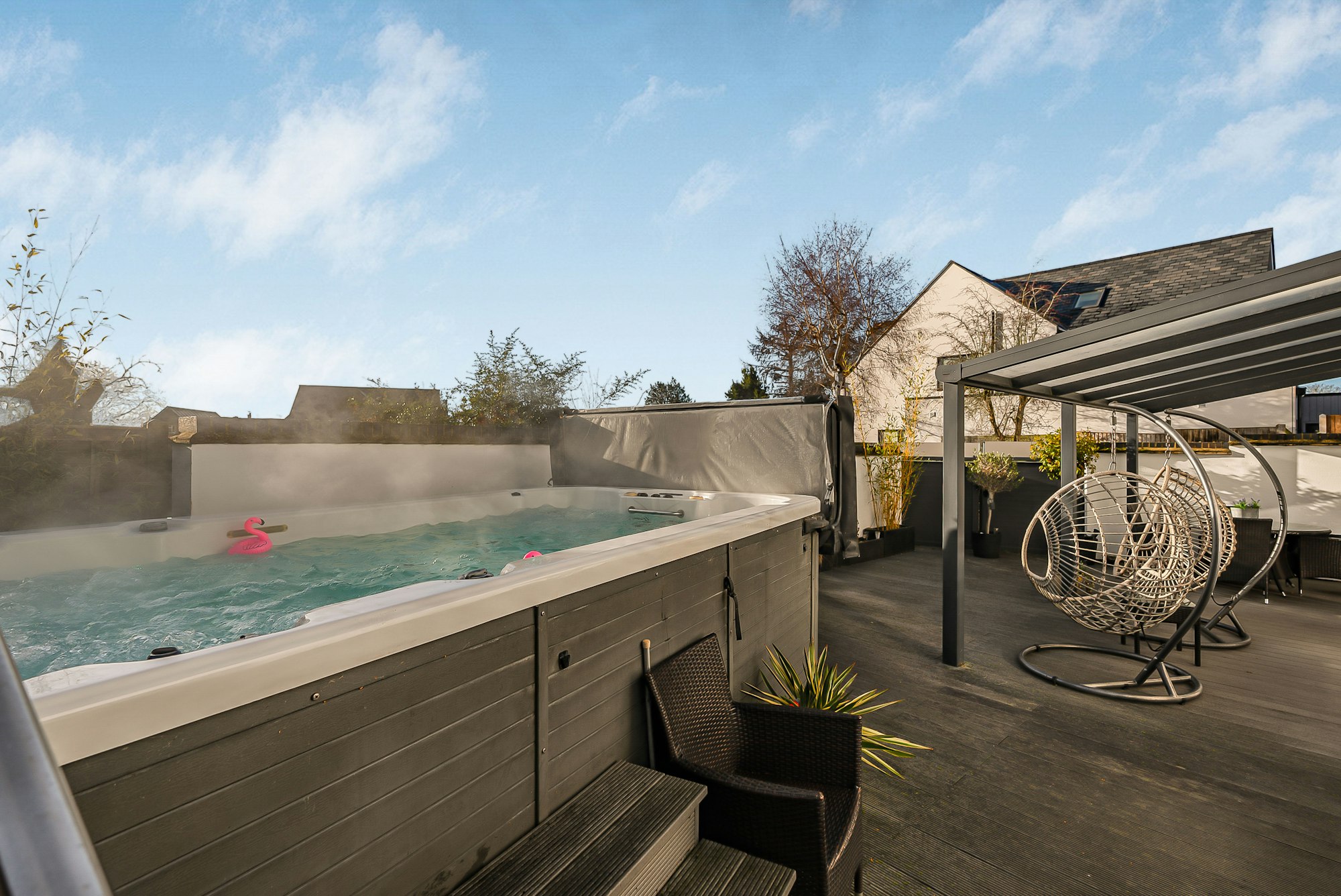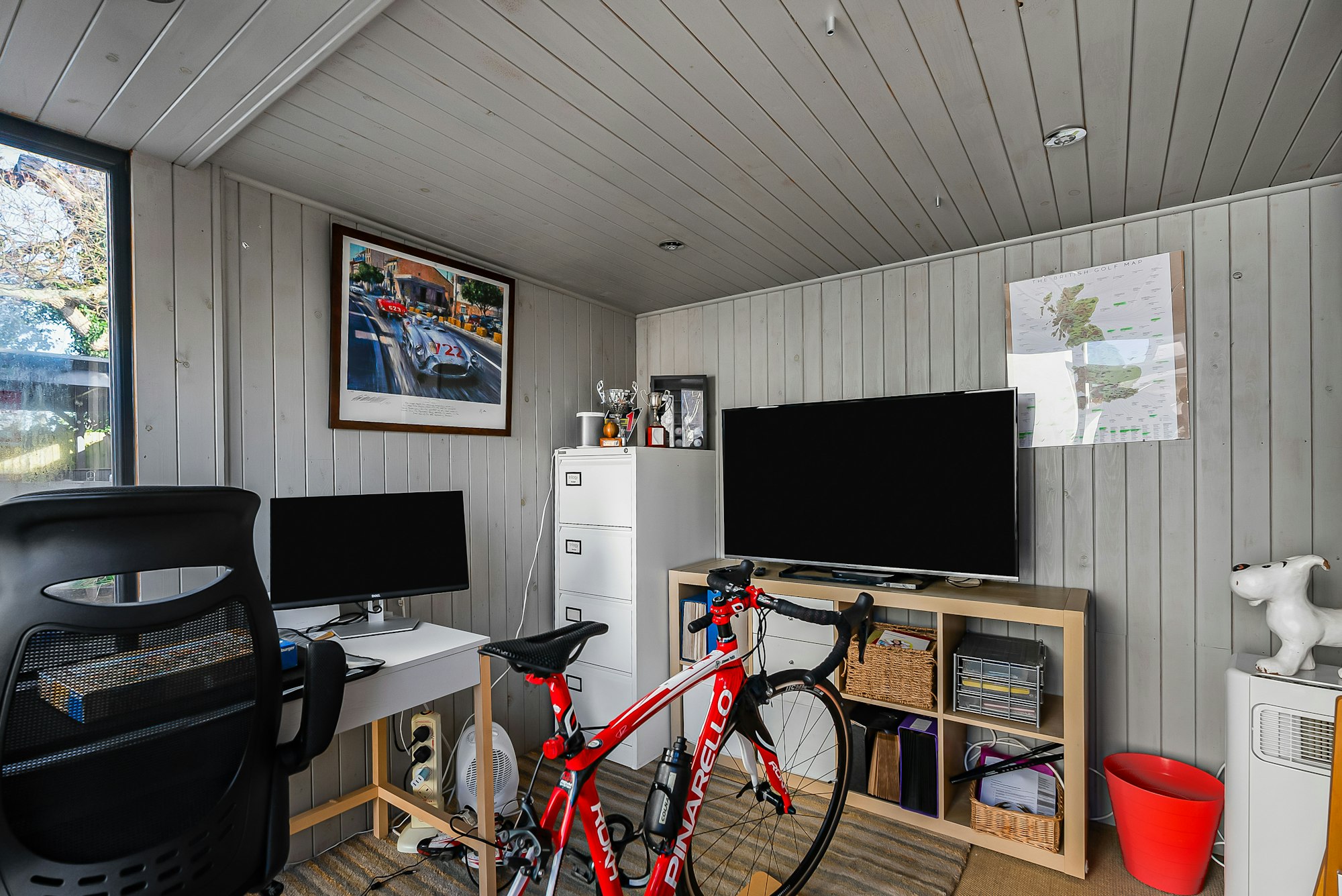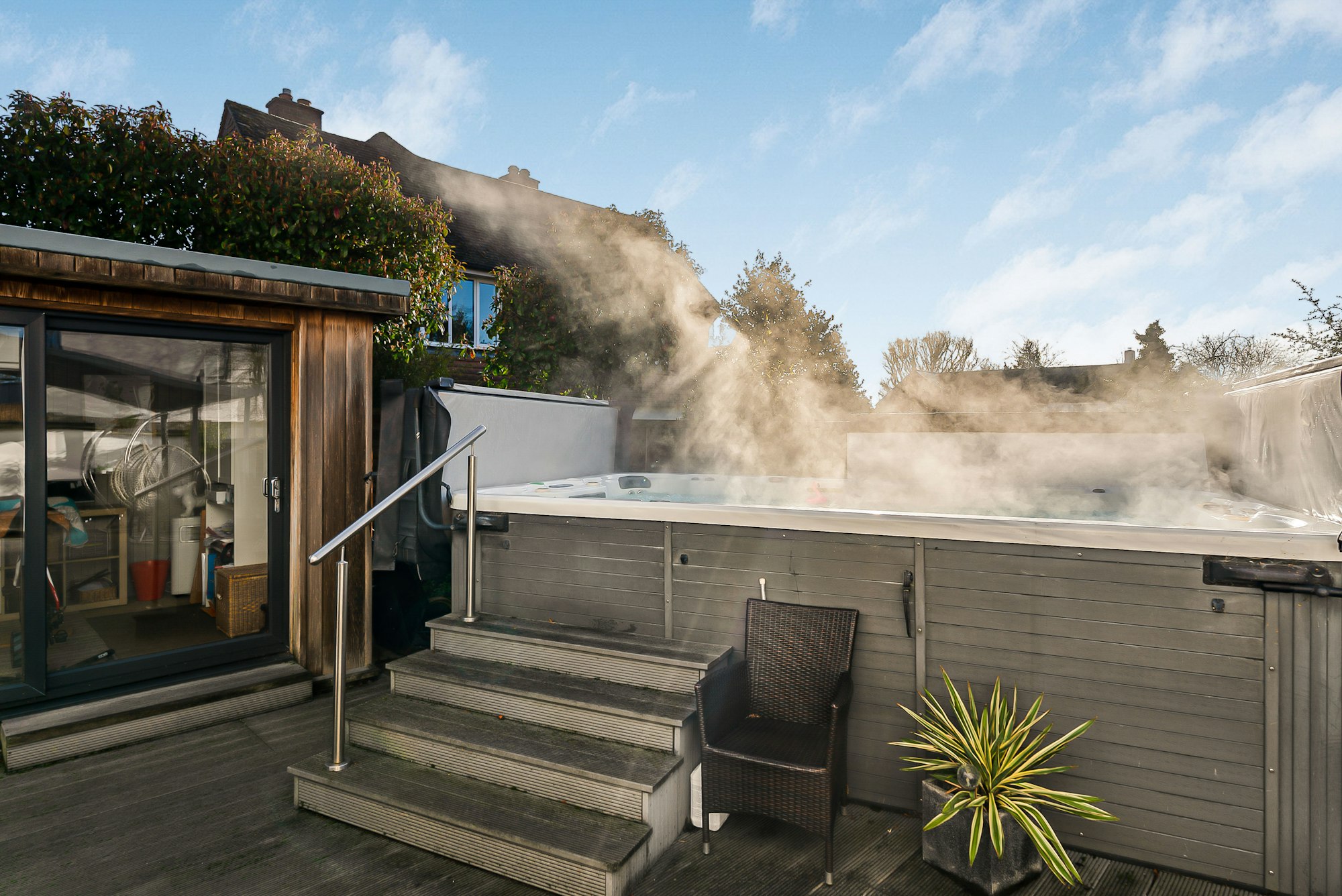 The property enjoys two separate gardens. To the front is a private, enclosed garden with a decked area accessed via bi-folding doors from both the kitchen and sitting room, complete with a veranda. This area also includes a Riptide Neptune swimming (hot) tub and a home office with power and lighting. To the side, there is a generous patio area, ideal for entertaining. The rear garden is mainly laid to lawn and features a raised decked area sheltered by a pergola, along with large sheds, both of which benefit from power and lighting.