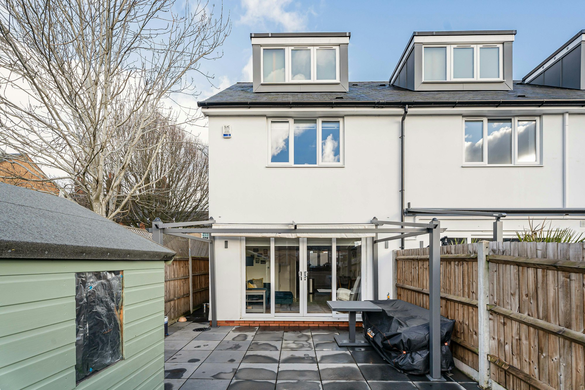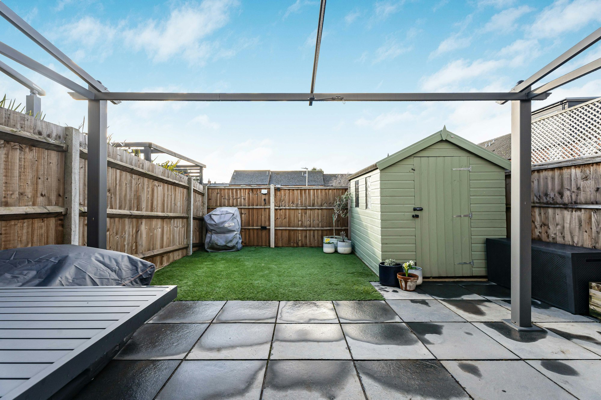 Externally, the property features low-maintenance front and rear gardens. The west facing rear garden includes a generous patio area, perfect for outdoor seating and dining, a small lawned area, an awning for shade, and a wooden shed for additional storage.