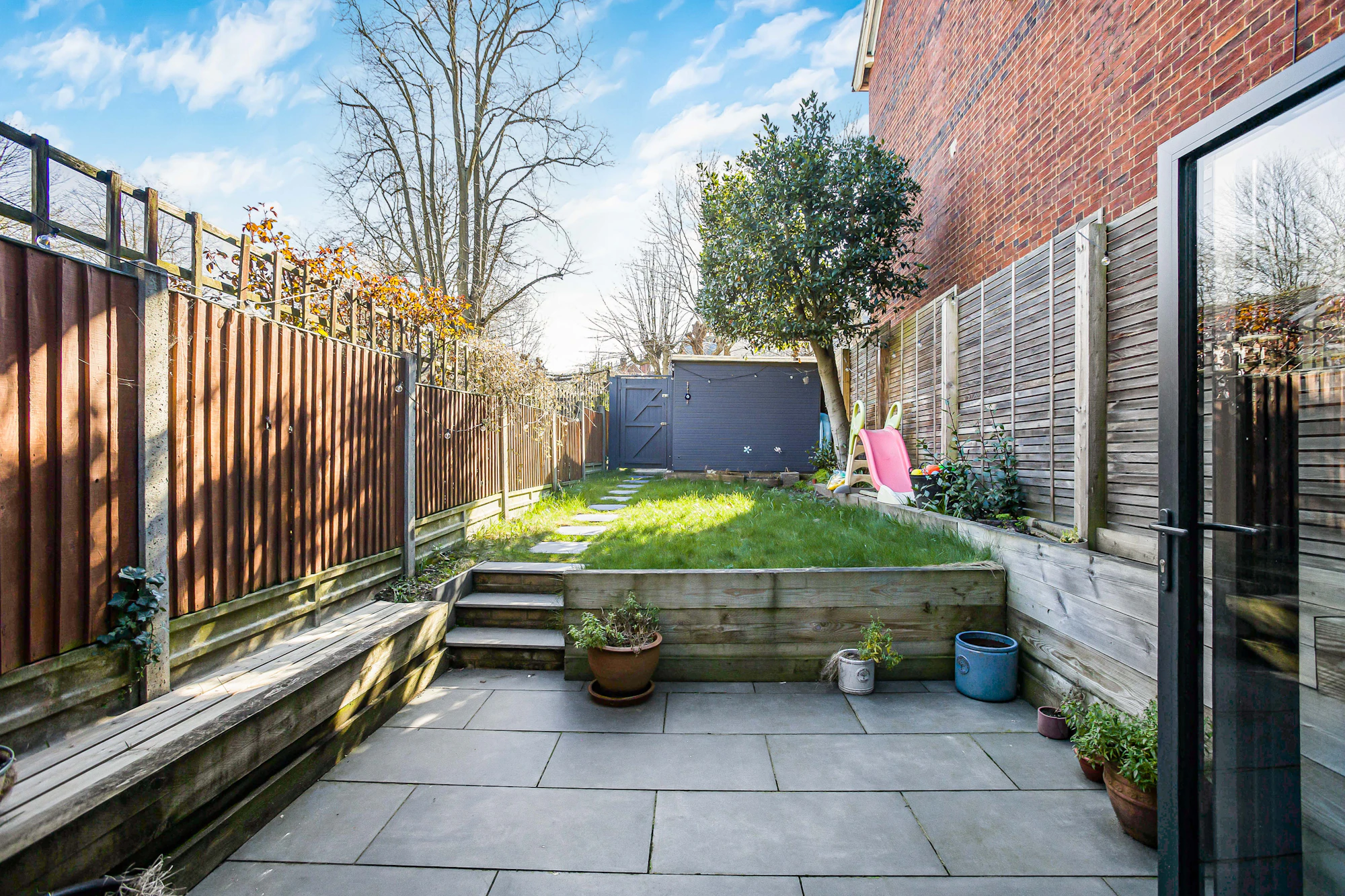 Outside, the front of the property features a quarry-tiled pathway leading to the entrance, with a further tiled garden area and soft planting, enclosed by a brick wall. The private rear garden has been thoughtfully landscaped, offering a patio area ideal for entertaining, a well-maintained lawn, and established plant, shrub, and tree borders, all enjoying a sunny south-facing position. A pathway leads to the rear of the garden, where there is a wooden shed.