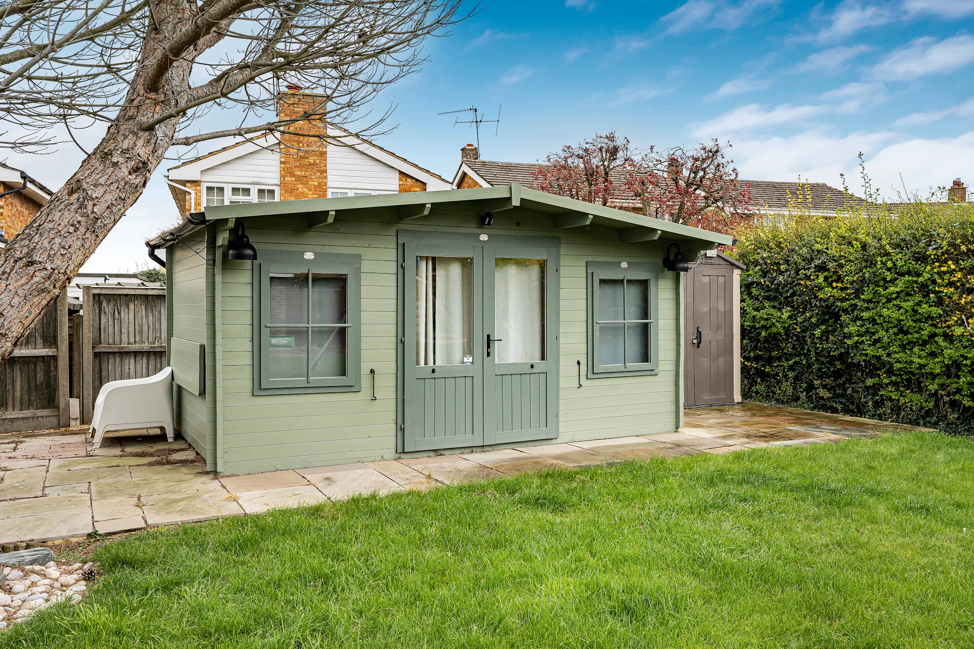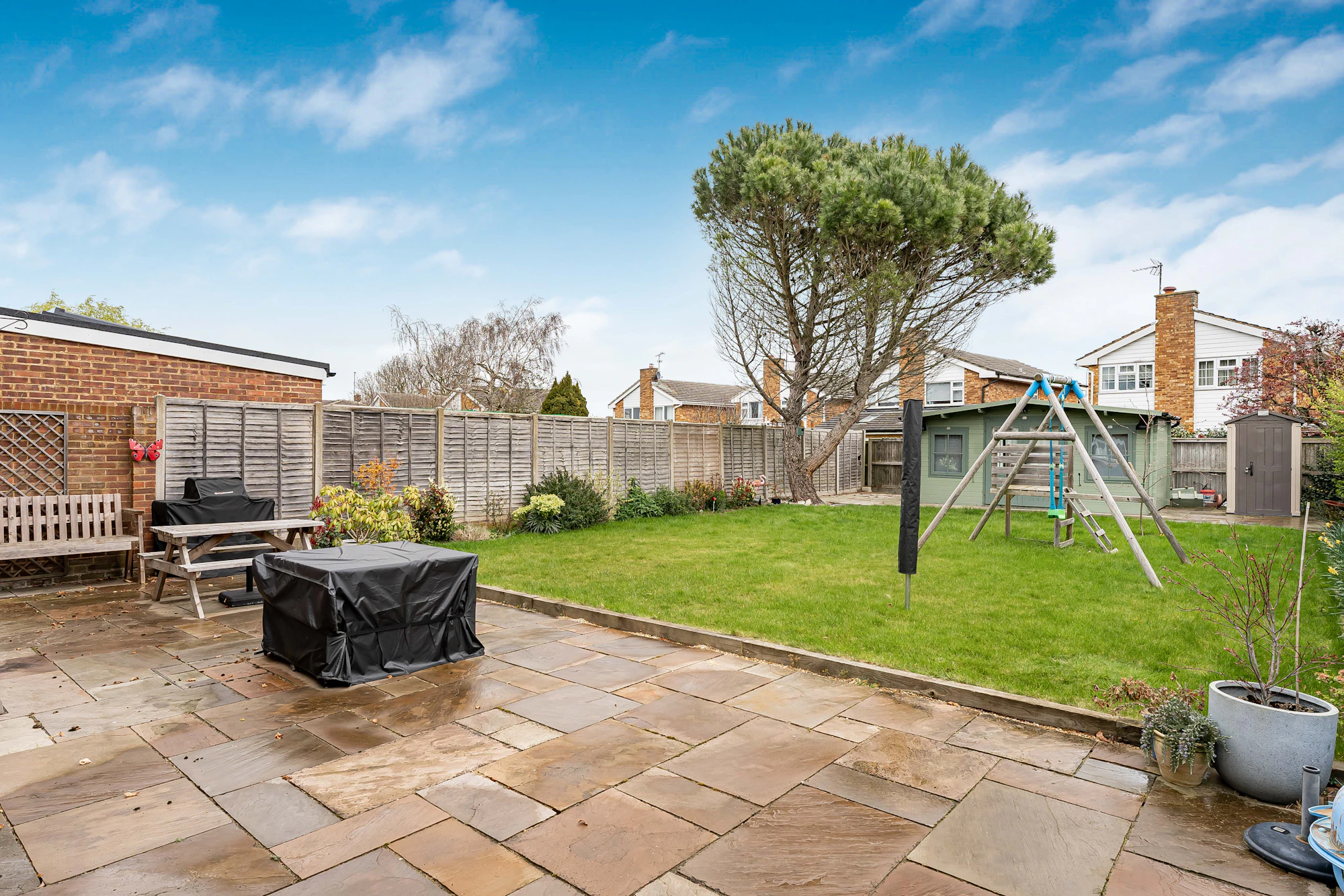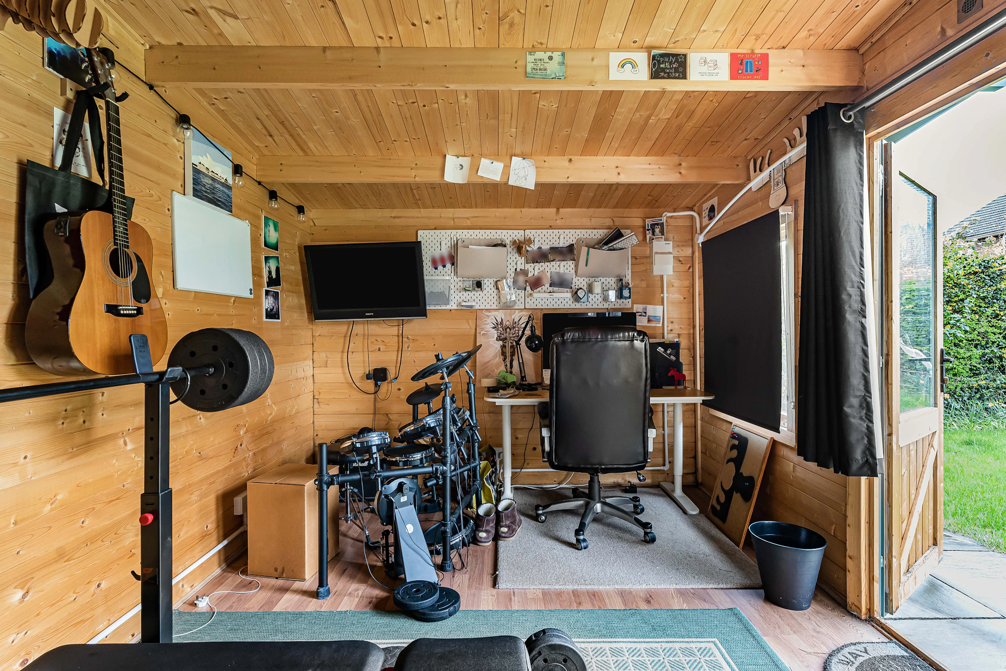 The rear garden has been thoughtfully landscaped and offers two large patio areas, perfect for outdoor dining and entertaining. The remainder is mainly laid to lawn, complemented by well-stocked and established plant, shrub and tree borders. There is also the added benefit of a garage. A particularly useful outbuilding, currently set up as a gym and home office, benefits from power.