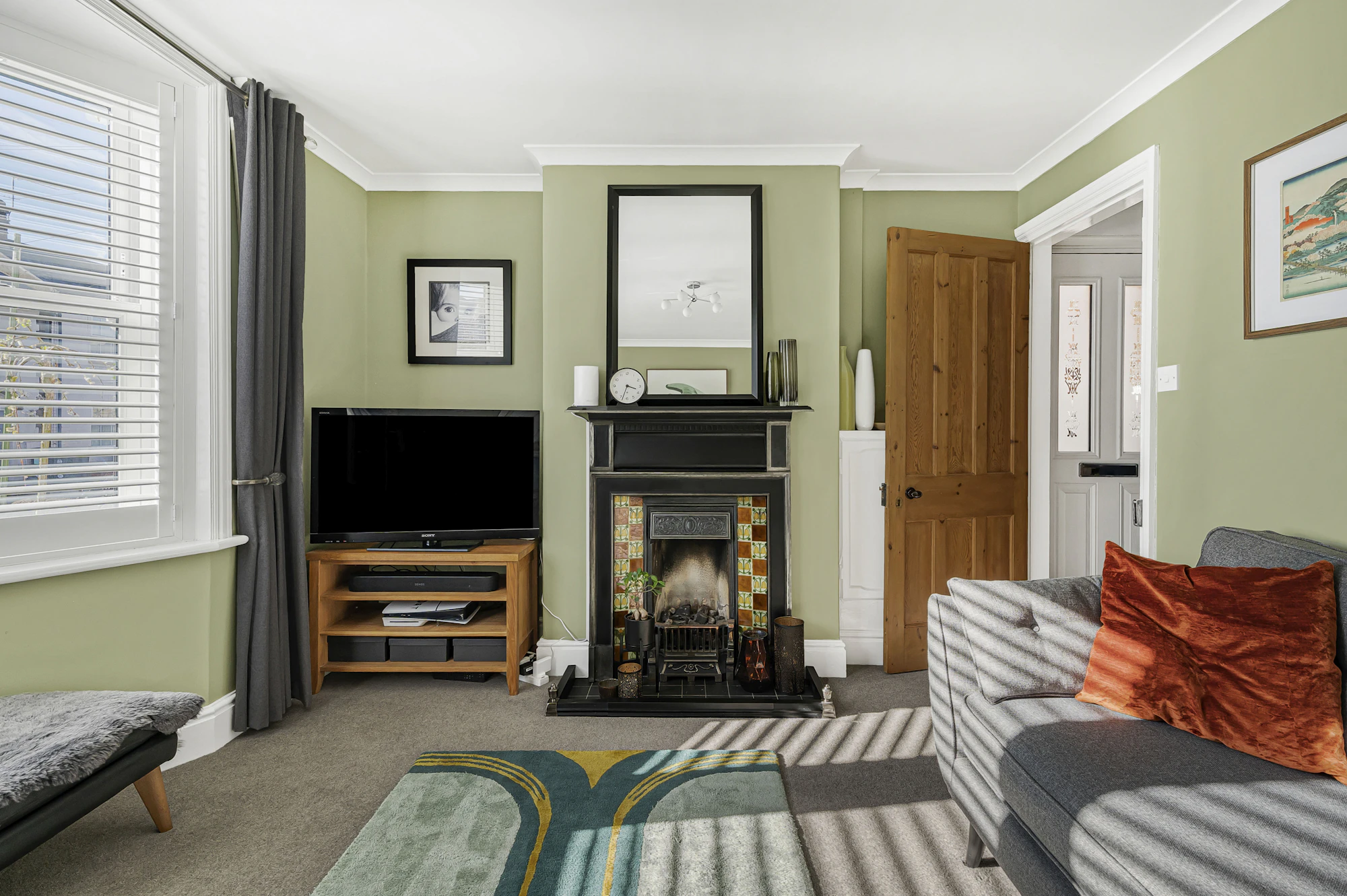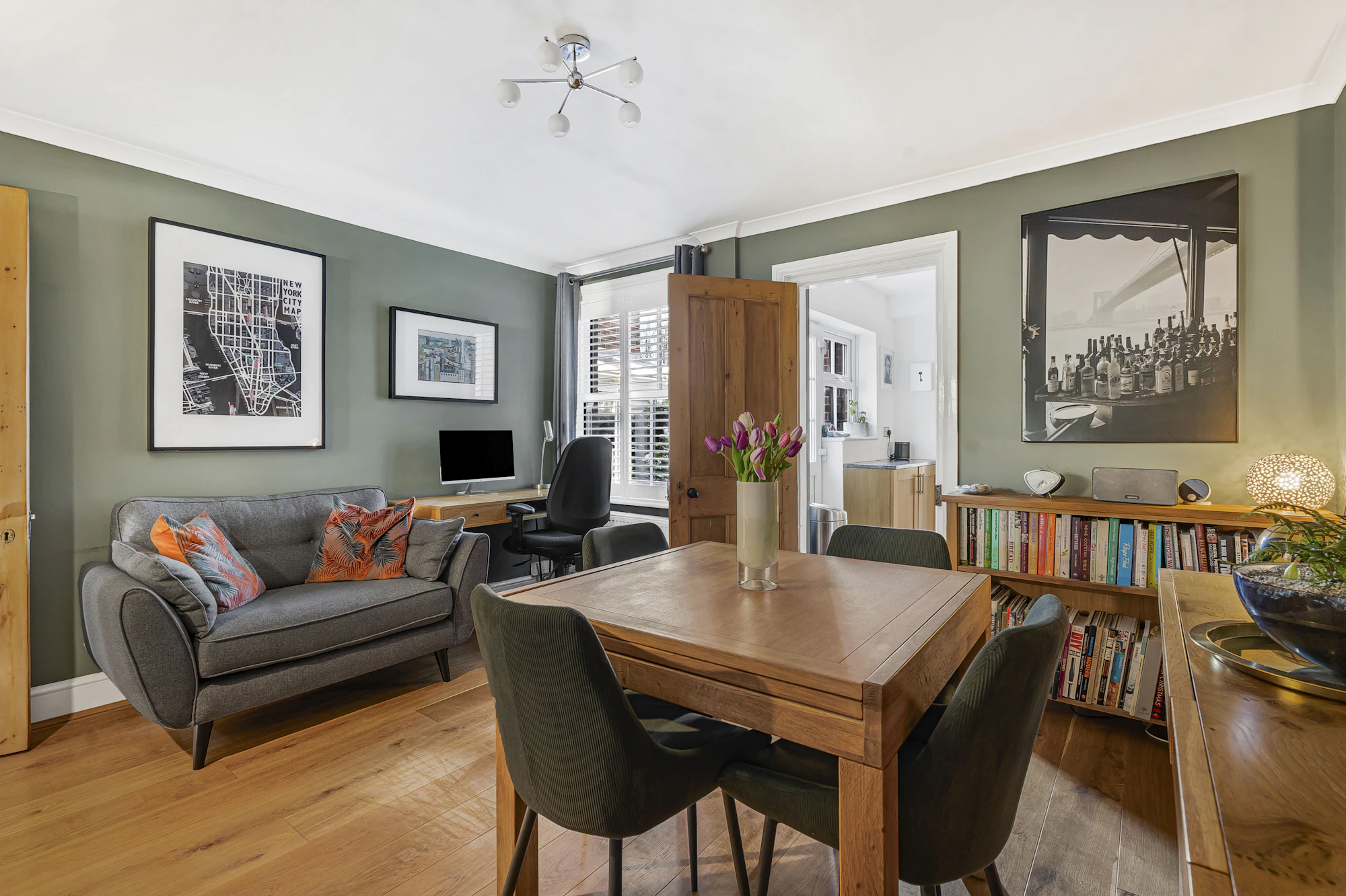You enter into a welcoming entrance area that flows seamlessly into the living room, where a feature fireplace and a bay window with bespoke shutters create a cosy yet elegant setting. Beyond this is a formal dining room, currently used as a versatile family space, ideal for entertaining, relaxing or working from home.