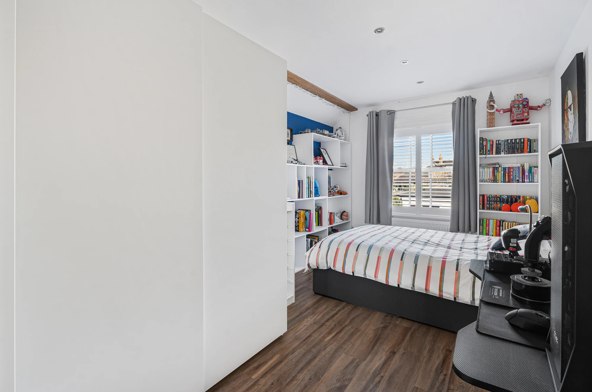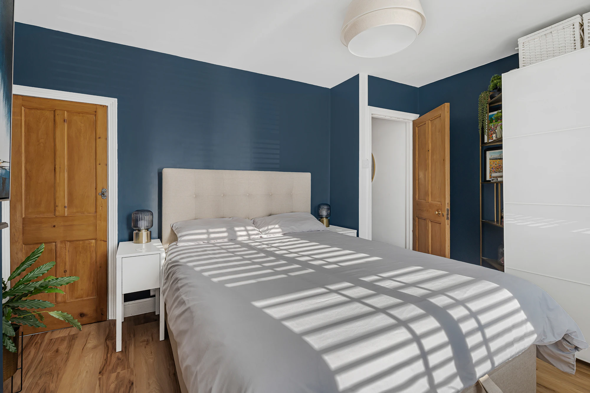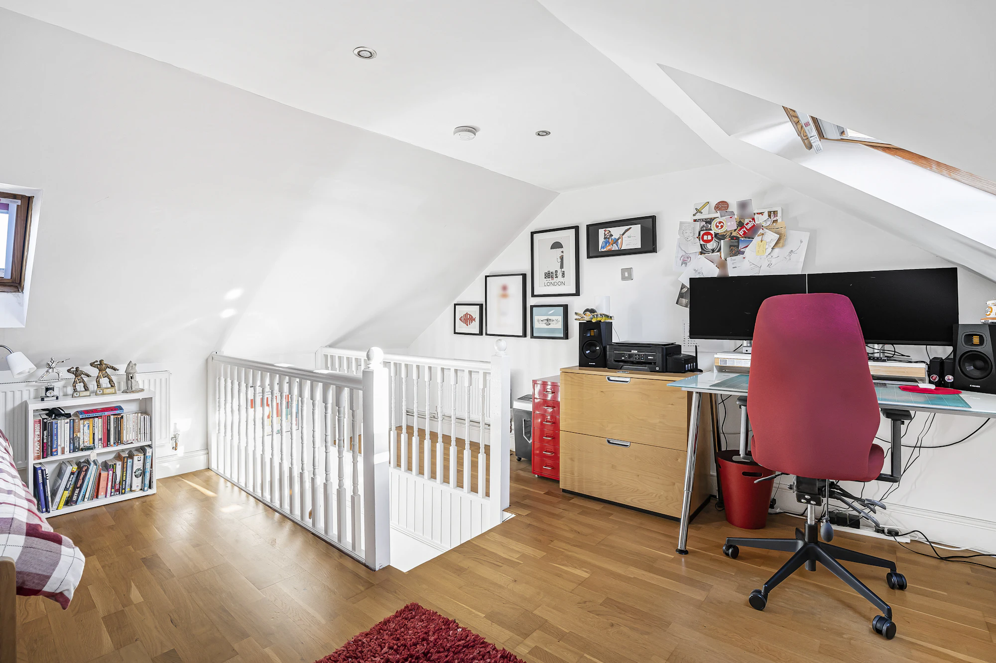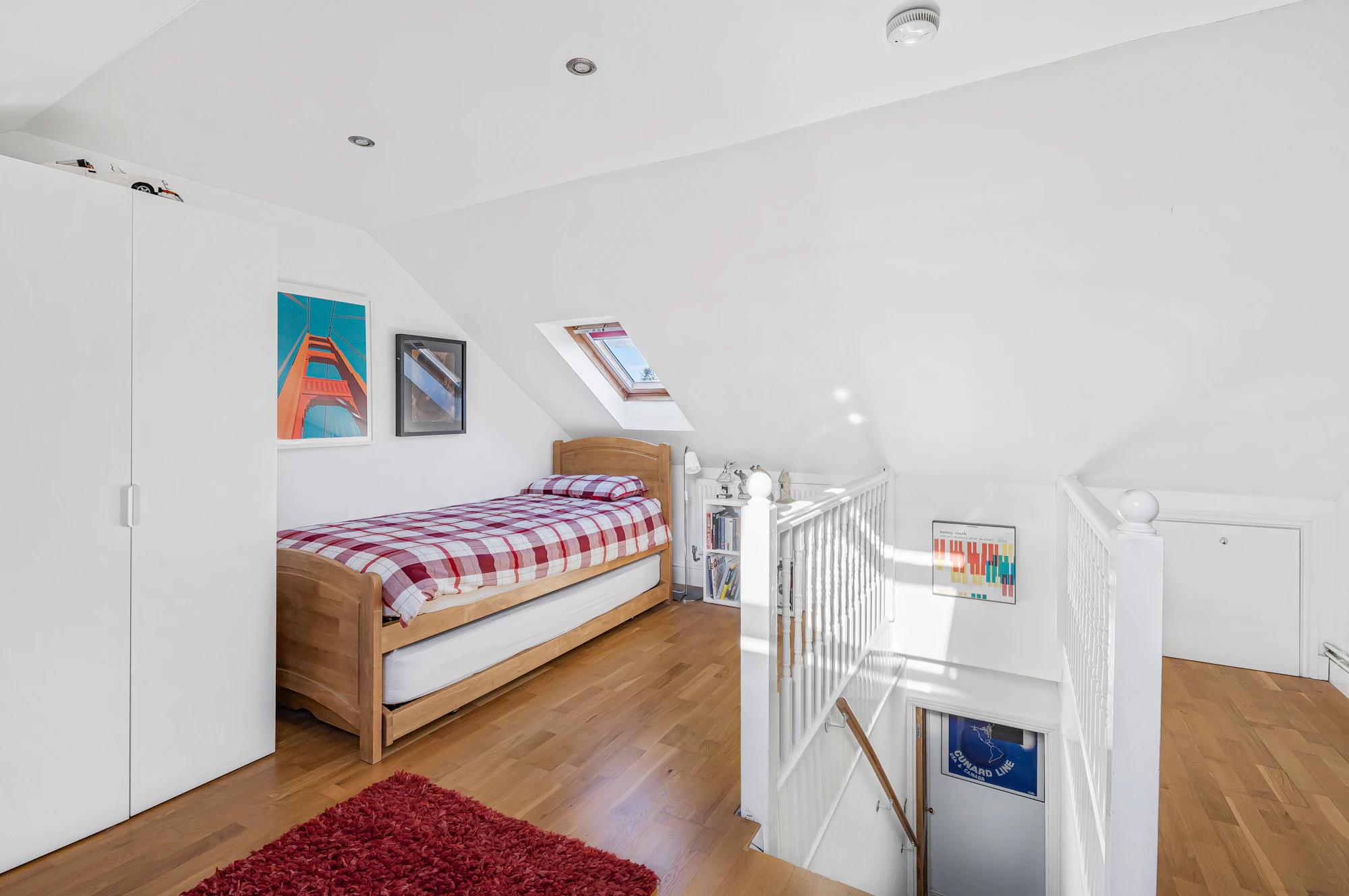The second floor is dedicated to a further double bedroom, complete with two Velux windows and useful eaves storage.