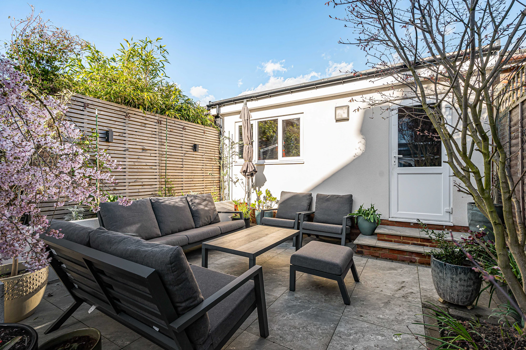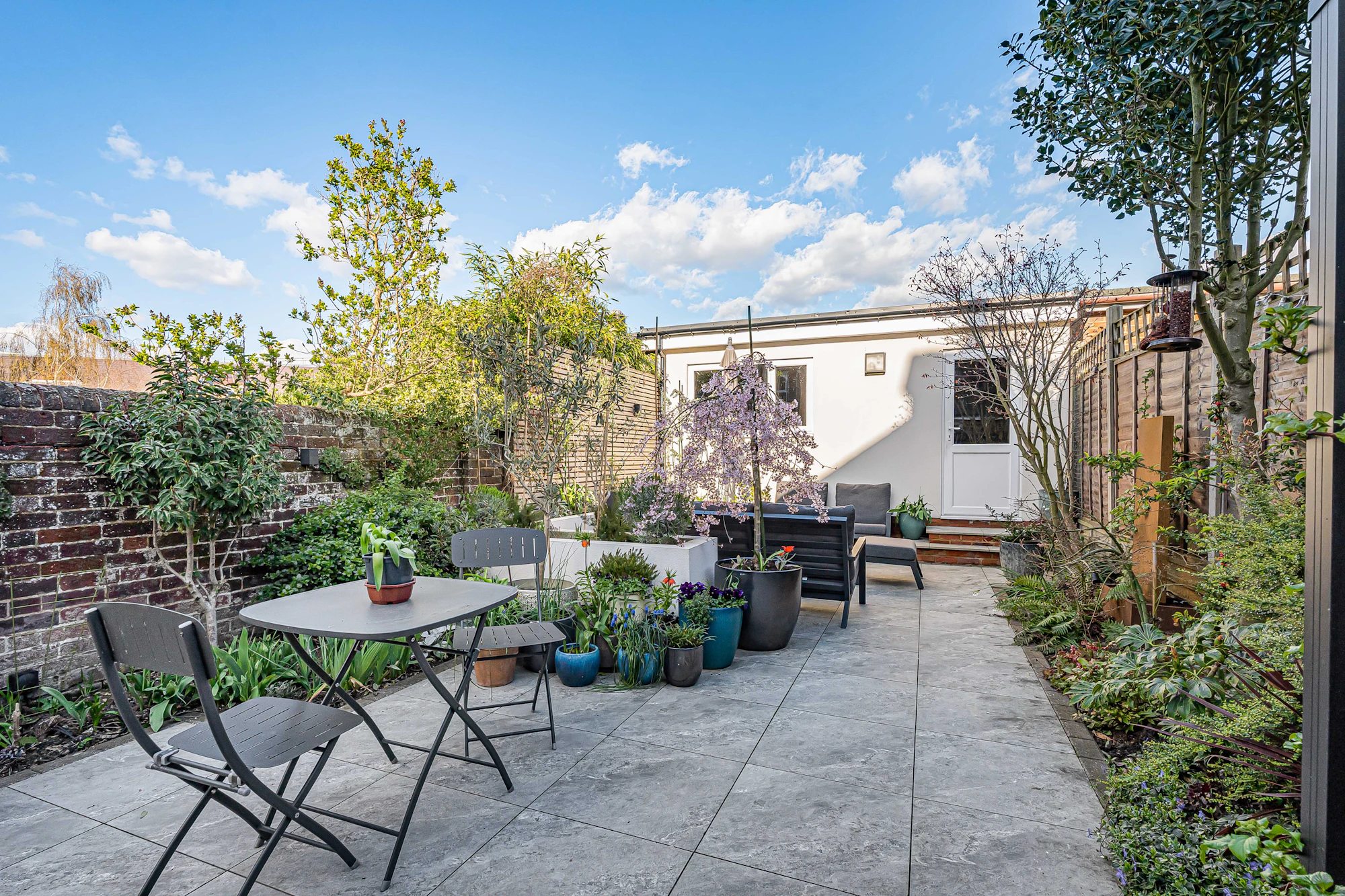 The rear garden has been thoughtfully landscaped with both ease of maintenance and visual appeal in mind. It features established planting, raised borders and an impressive patio area that provides the perfect setting for entertaining. The garden enjoys an easterly aspect and leads to a rebuilt double garage with power, lighting and an electric up-and-over door. In addition to space for several vehicles inside the garage, there is further parking directly in front, accessed via the rear of the property.