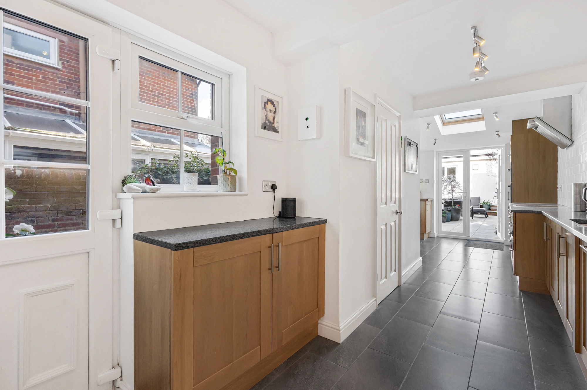 To the rear sits a generous, contemporary kitchen fitted with a range of wall and base units, solid worktops and high-quality integrated appliances. Part-vaulted ceilings, a Velux window and French doors allow natural light to pour in, while providing direct access to the rear patio. A useful ground floor W.C. is also positioned just off this space.
