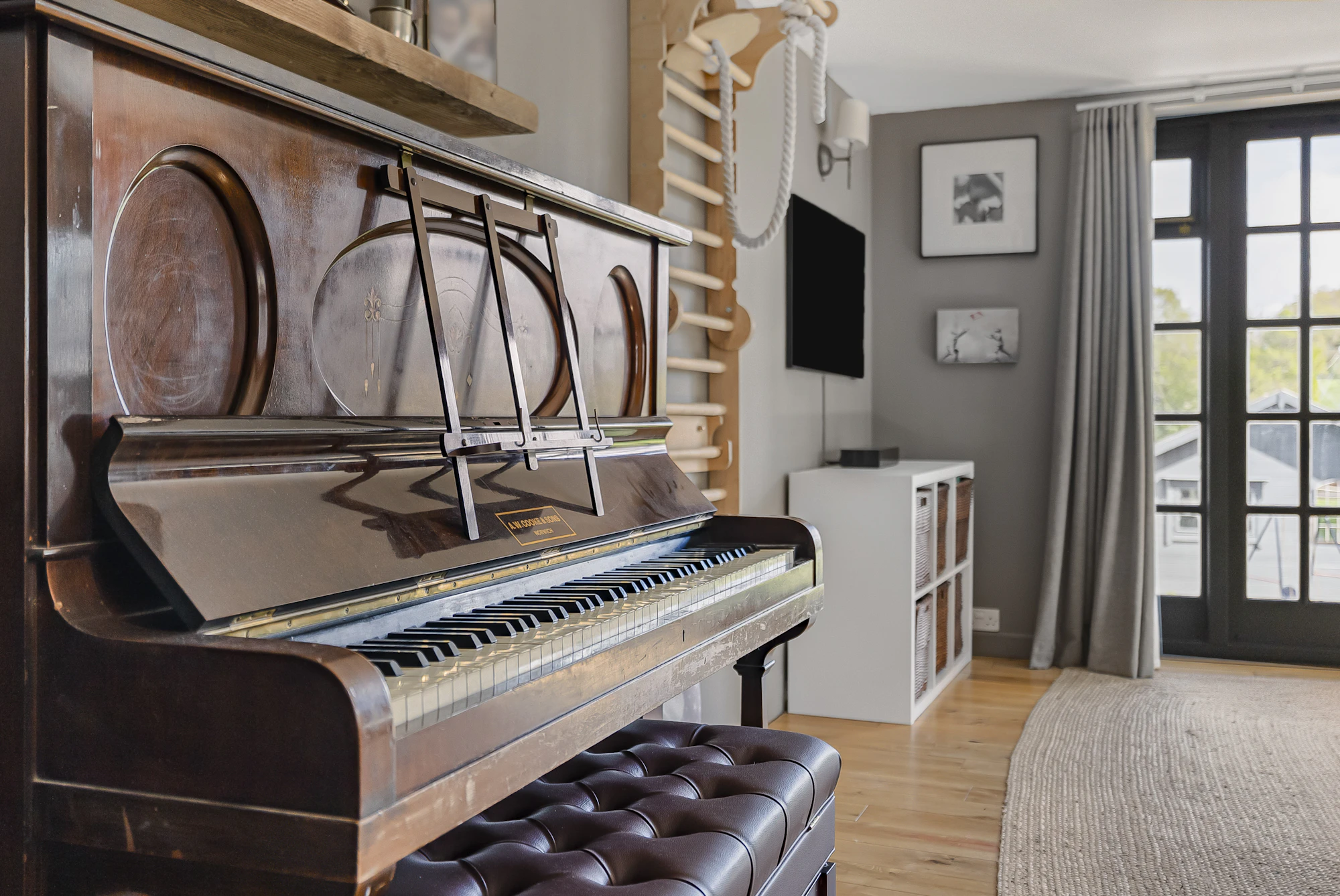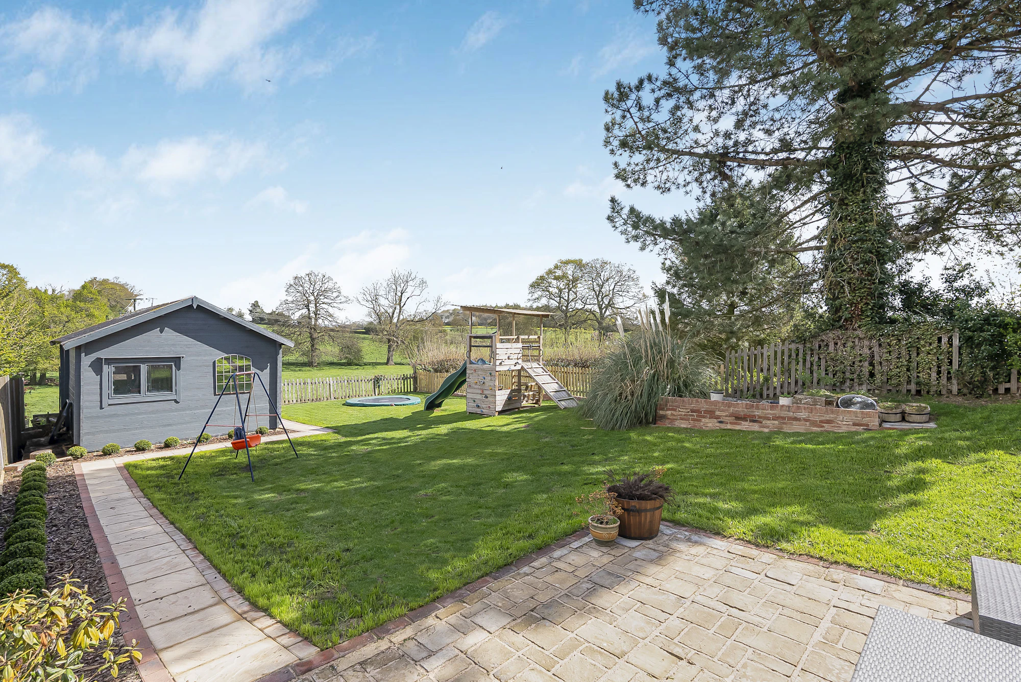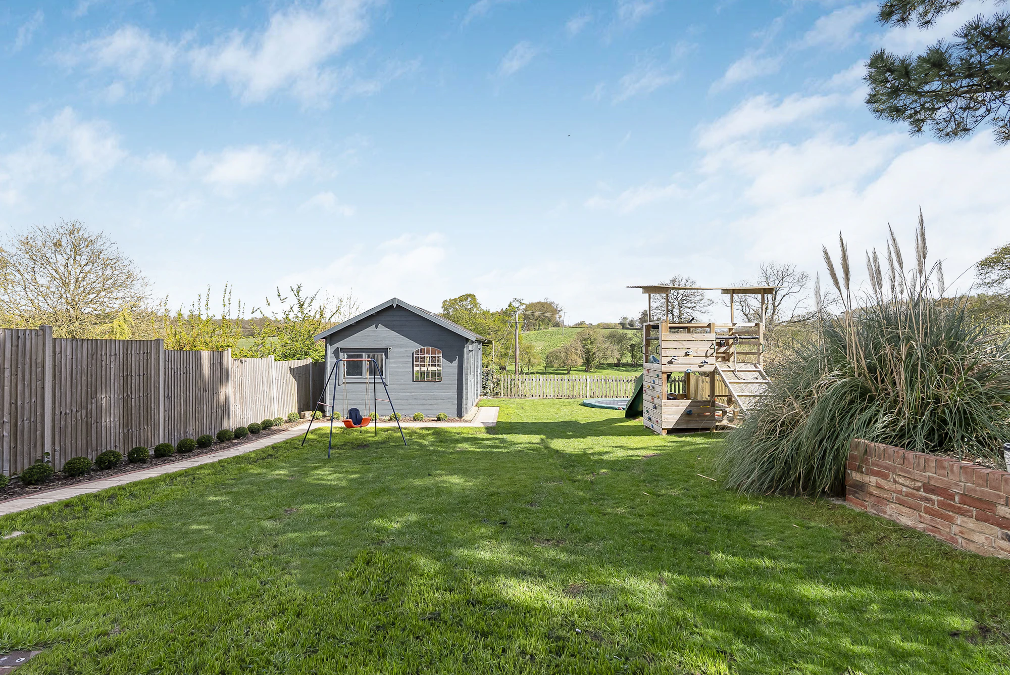There are two highly versatile outbuildings on the property, both benefitting from connected power and lighting. The larger, located at the rear of the garden, is currently used as a gym but offers excellent flexibility for a variety of uses, all while enjoying stunning countryside views.