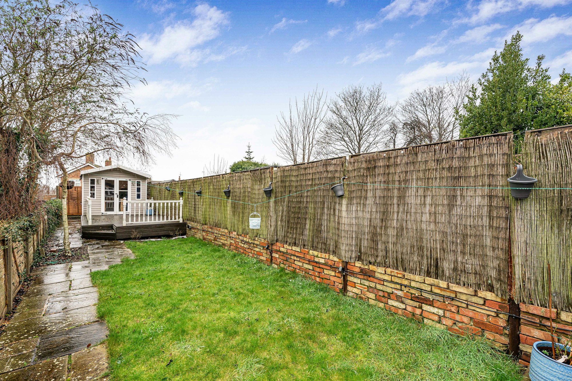 Outside, the property is approached via a pathway leading to a small, enclosed paved front garden. The rear garden offers a combination of lawn and a well-proportioned patio area, with continuous paving extending to the back of the house. To the rear of the garden is a wooden outbuilding with power and lighting, complemented by a raised decked area, making it ideal for use as a home office or additional workspace. Please note that a shared legal right of access exists for this property and neighbouring homes.