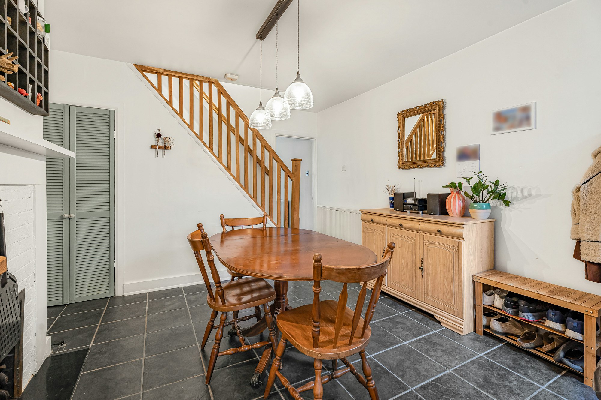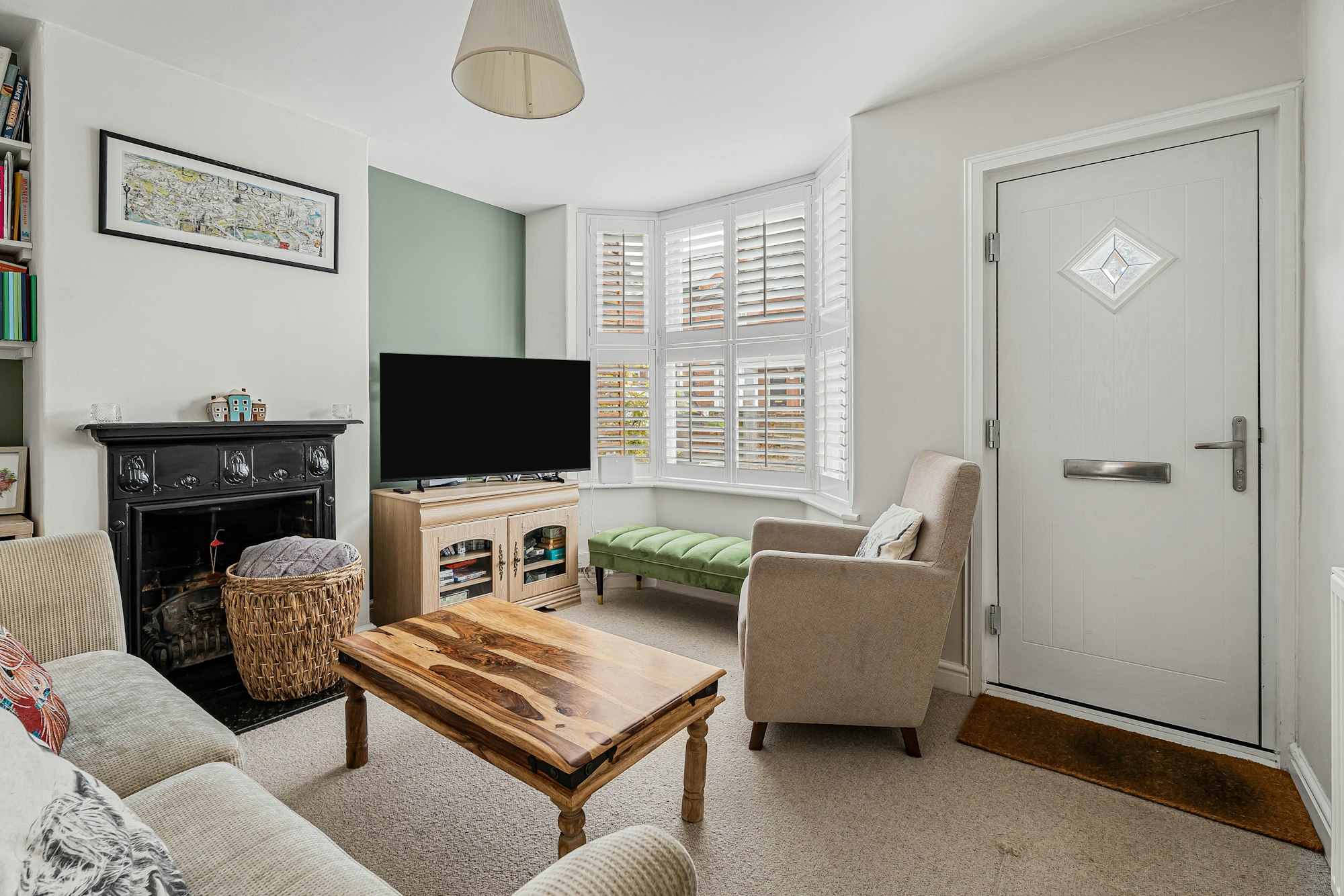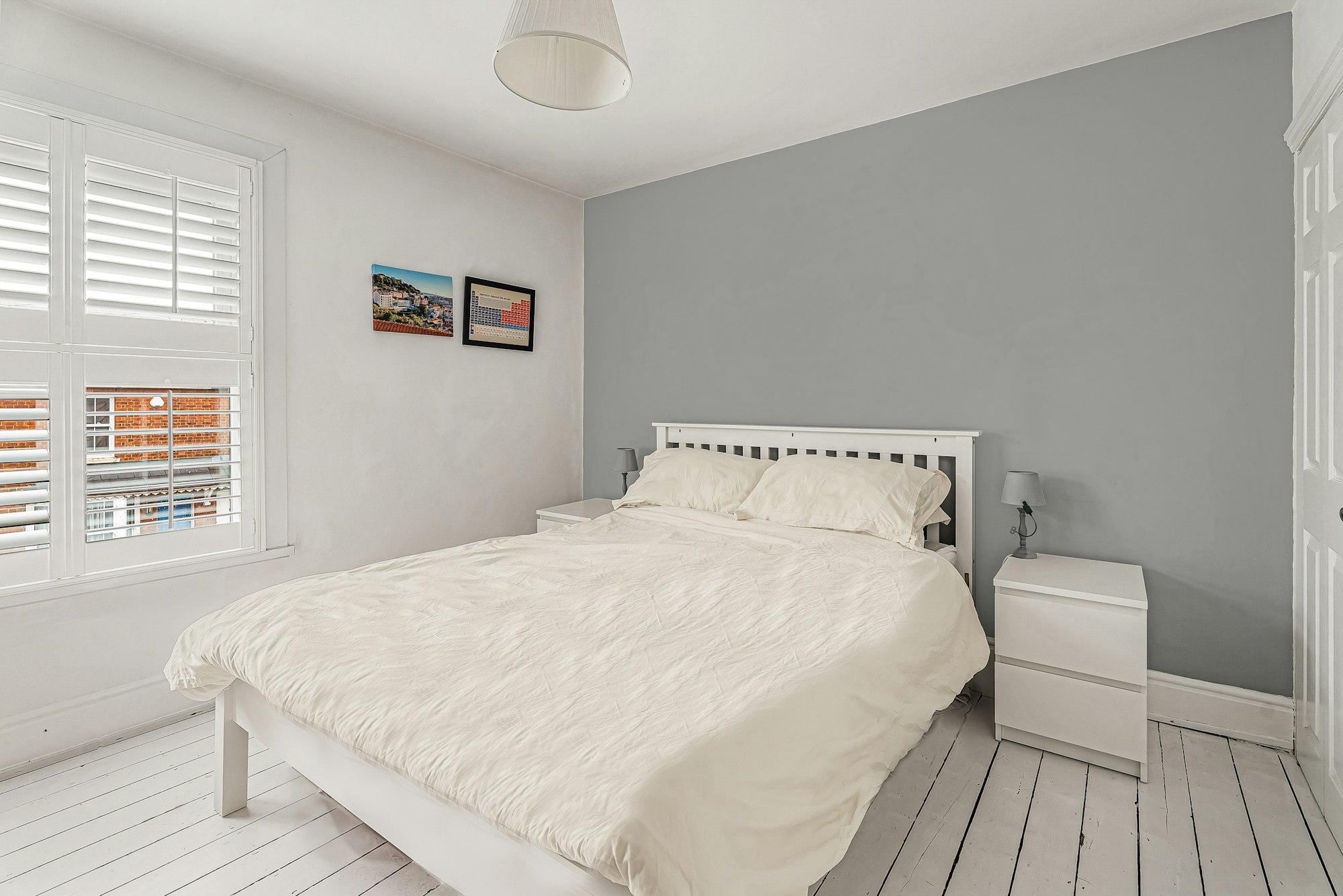 Upstairs, there are two generous double bedrooms, both benefiting from built-in storage cupboards. The principal bedroom also features bespoke wooden shutters, echoing the character of the ground floor.