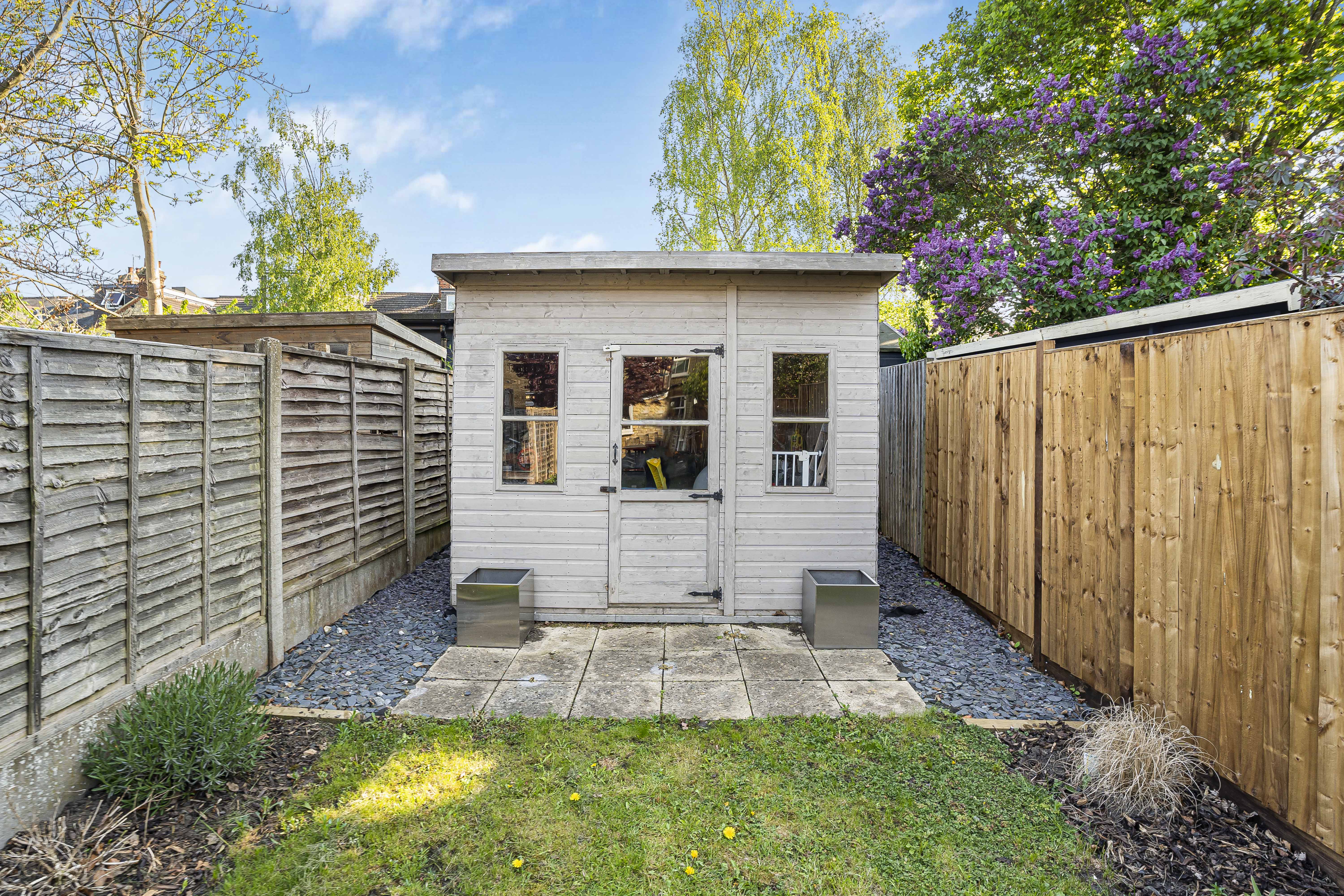 Externally, the property offers kerb appeal with a charming mosaic-tiled pathway and low-maintenance slate frontage. To the rear, the attractive south-facing garden has been thoughtfully designed with a variety of mature plants, shrubs, and trees, alongside a paved patio that provides an ideal setting for entertaining and al fresco dining. At the end of the garden, a useful outbuilding offers excellent potential to be converted into a home office or creative studio.