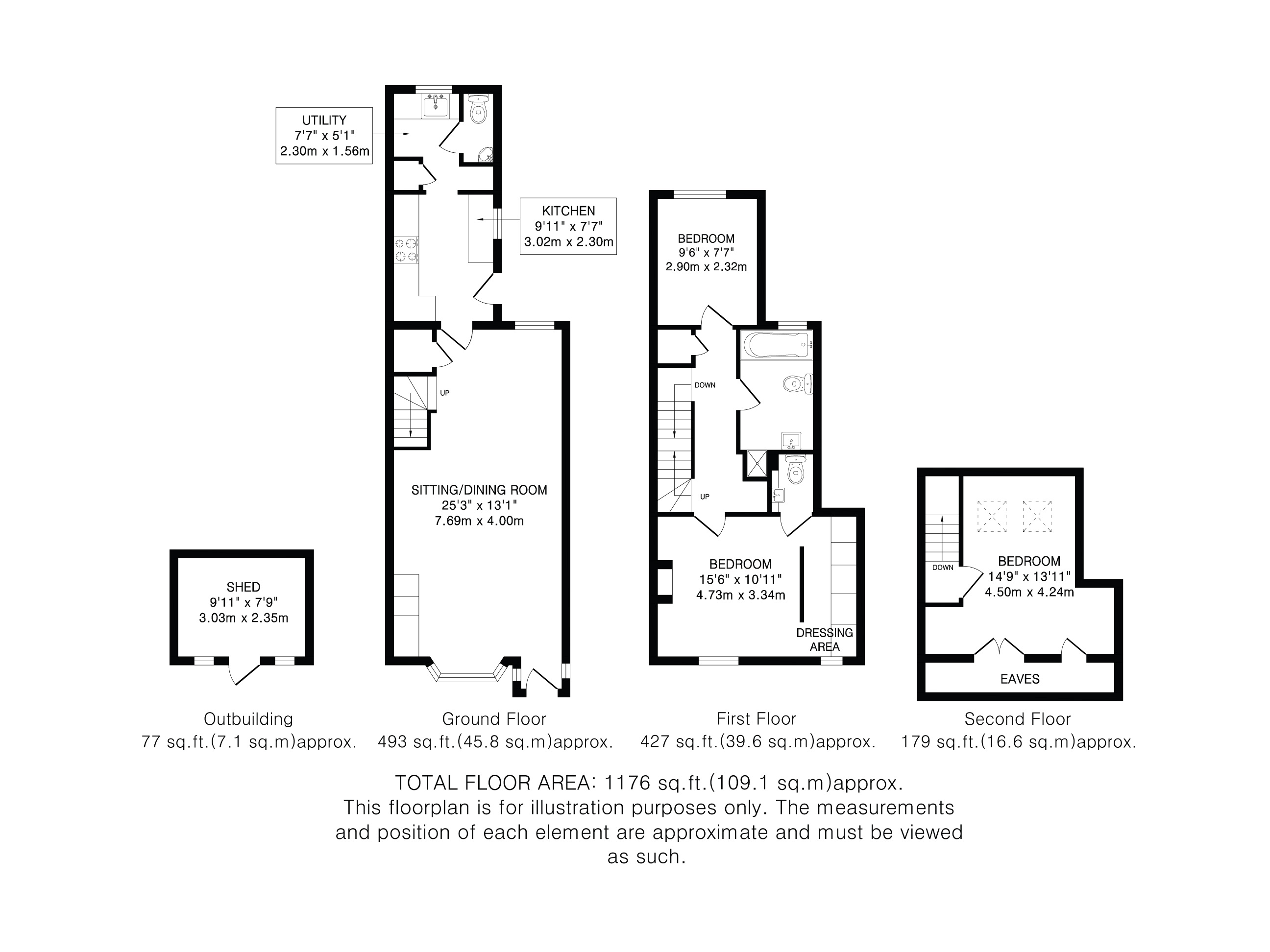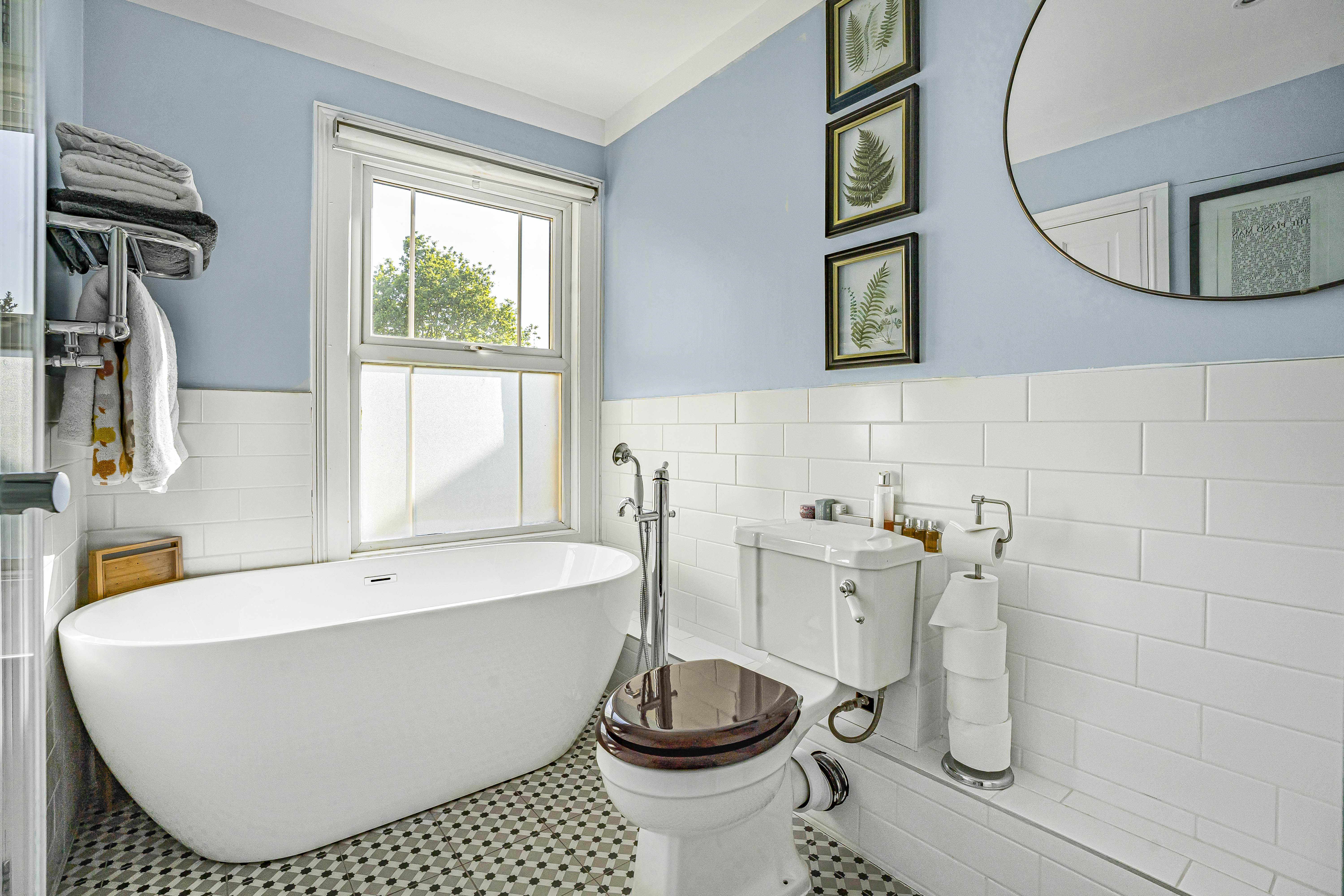 Upstairs, the first floor comprises two generously sized bedrooms, including a principal bedroom that enjoys the added advantage of a walk-in dressing area and en-suite W.C. A beautifully appointed four-piece family bathroom serves this floor. The second floor hosts a further spacious double bedroom, featuring Velux windows and useful eaves storage.
