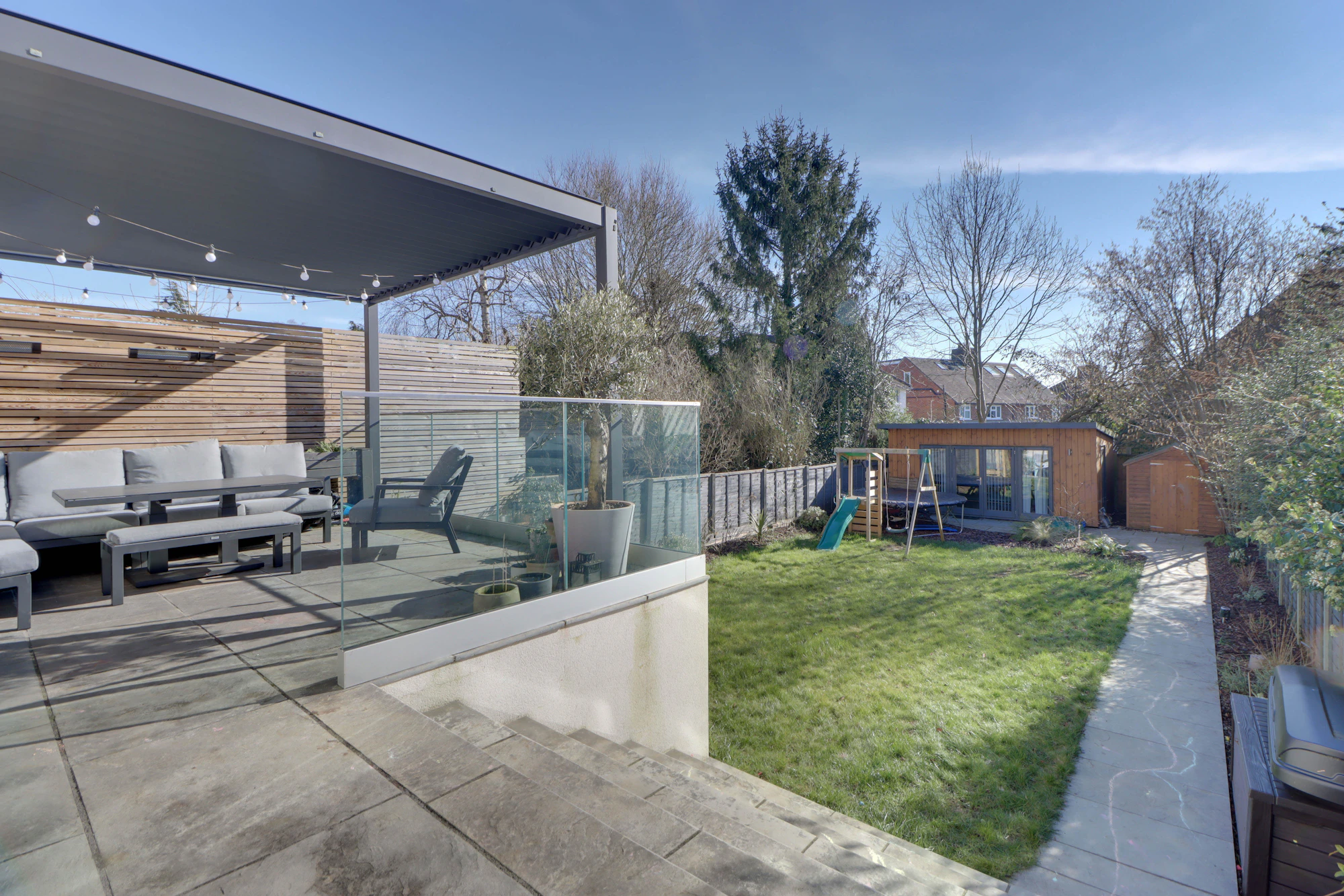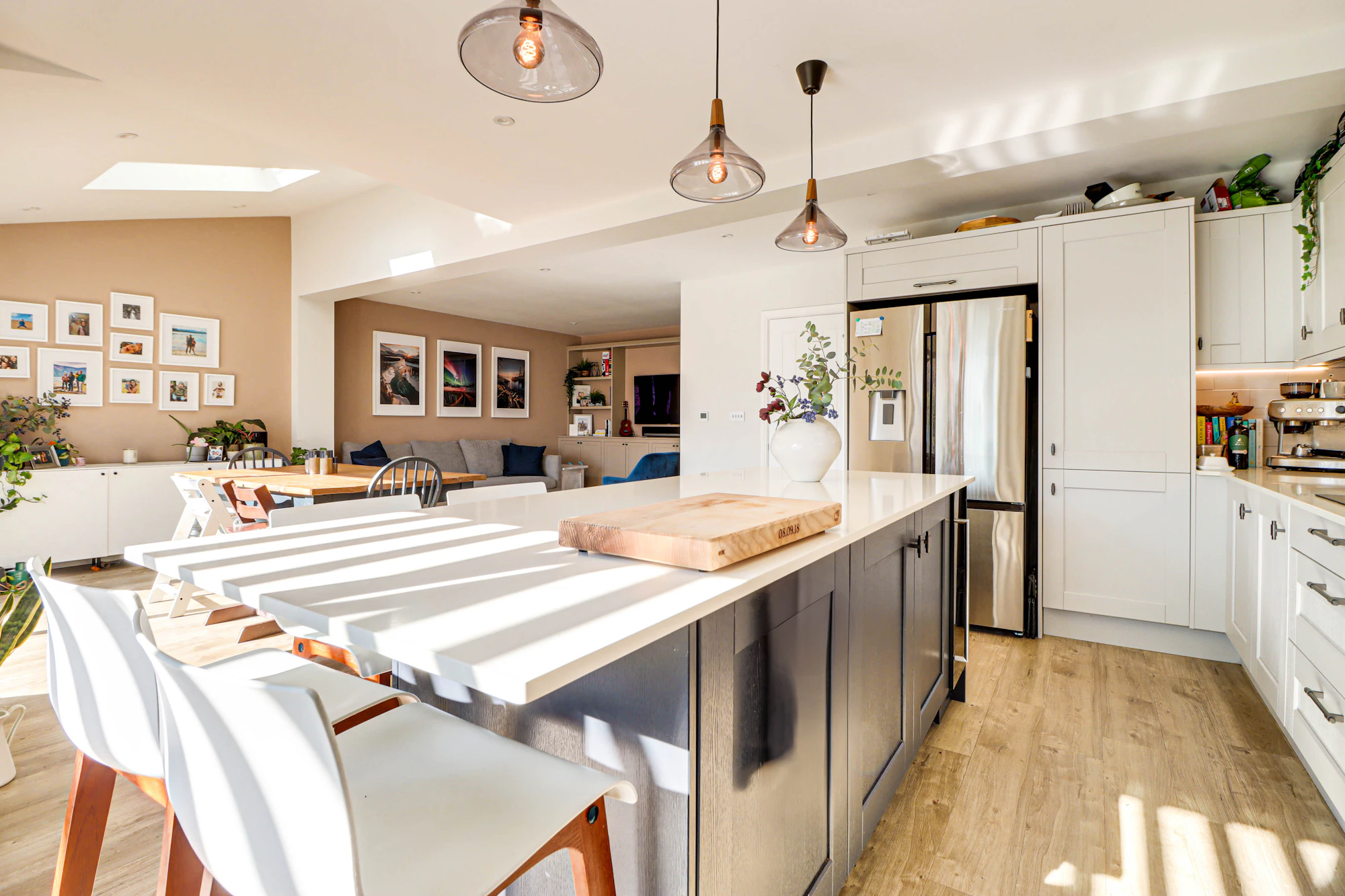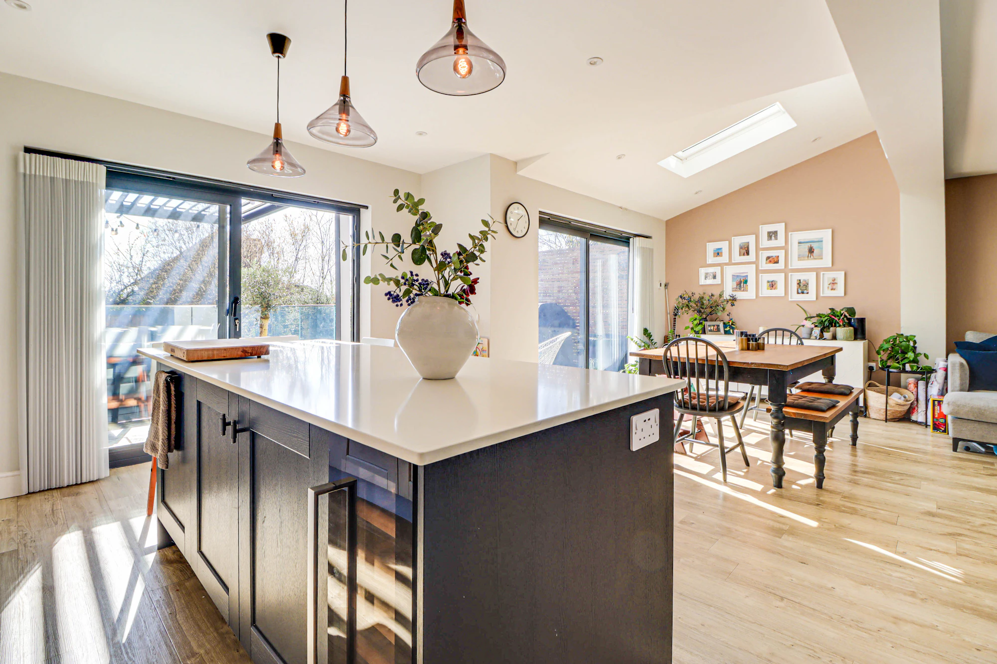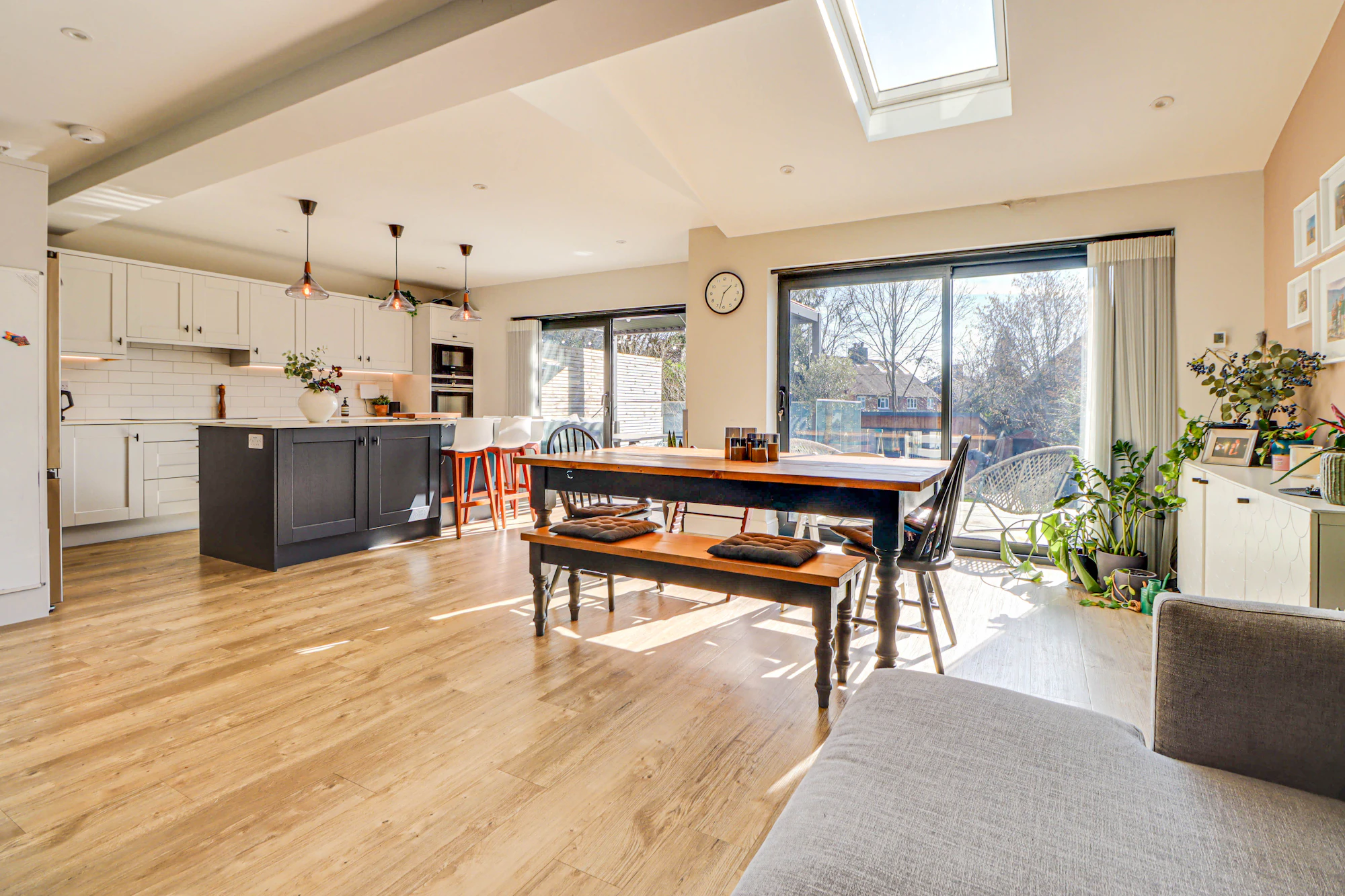 Set back from the street, the property welcomes you with a bright and airy hallway leading into a beautifully designed open-plan kitchen and dining area. The kitchen features premium Siemens integrated appliances, a wine cooler, a double fridge-freezer, generous counter space, and a sleek island. Velux windows and two sets of balcony doors flood the space with natural light, opening onto a paved patio with an overhead pergola, and outdoor heaters, perfect for enjoying the outdoors in all seasons. Steps lead down to the lawn and a versatile airconditioned home office/gym at the rear of the garden.