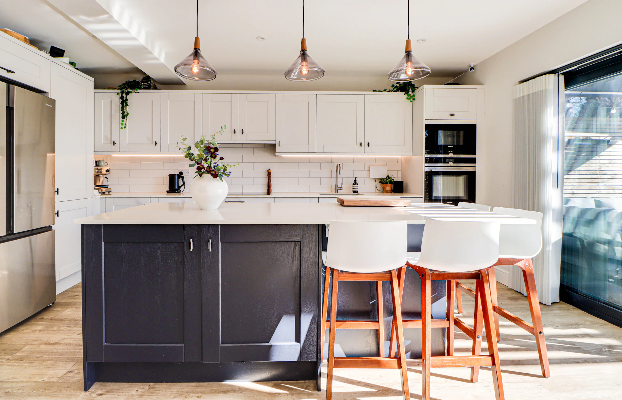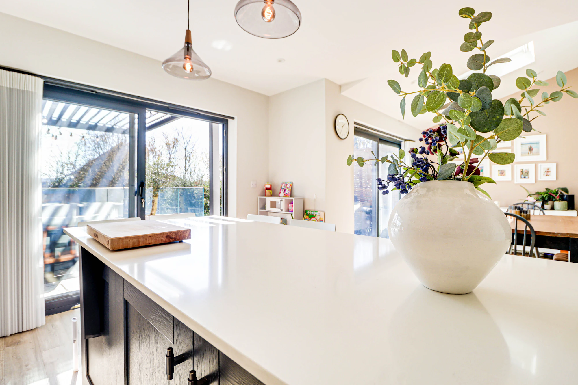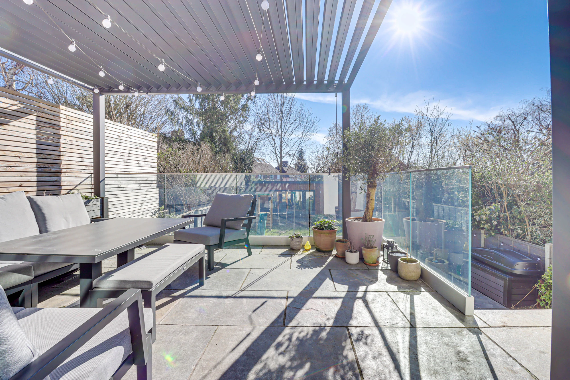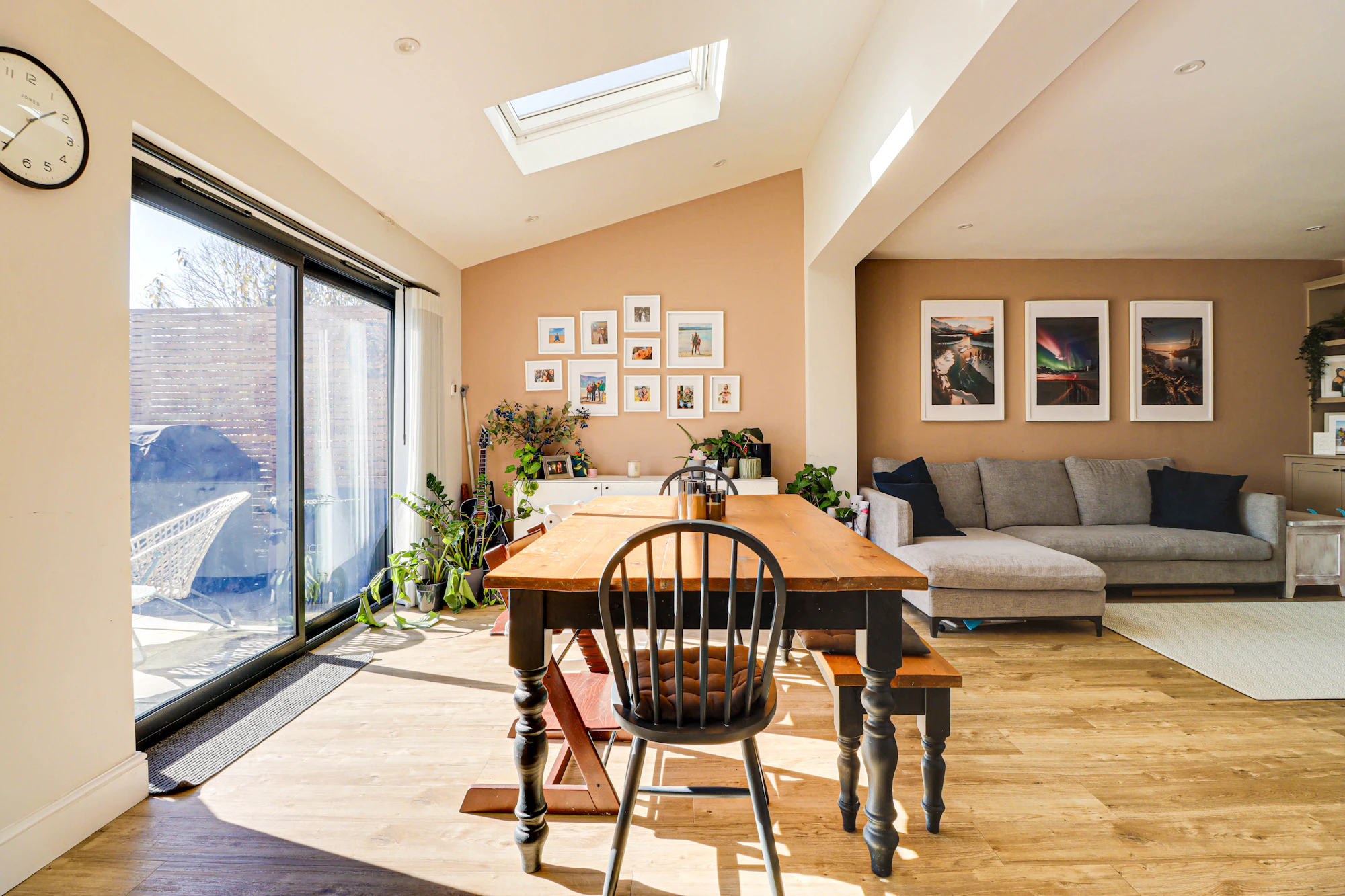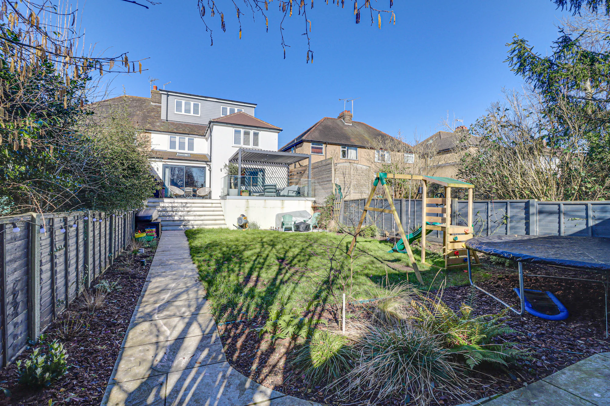 Set back from the street, the property welcomes you with a bright and airy hallway leading into a beautifully designed open-plan kitchen and dining area. The kitchen features premium Siemens integrated appliances, a wine cooler, a double fridge-freezer, generous counter space, and a sleek island. Velux windows and two sets of balcony doors flood the space with natural light, opening onto a paved patio with an overhead pergola, and outdoor heaters, perfect for enjoying the outdoors in all seasons. Steps lead down to the lawn and a versatile airconditioned home office/gym at the rear of the garden.