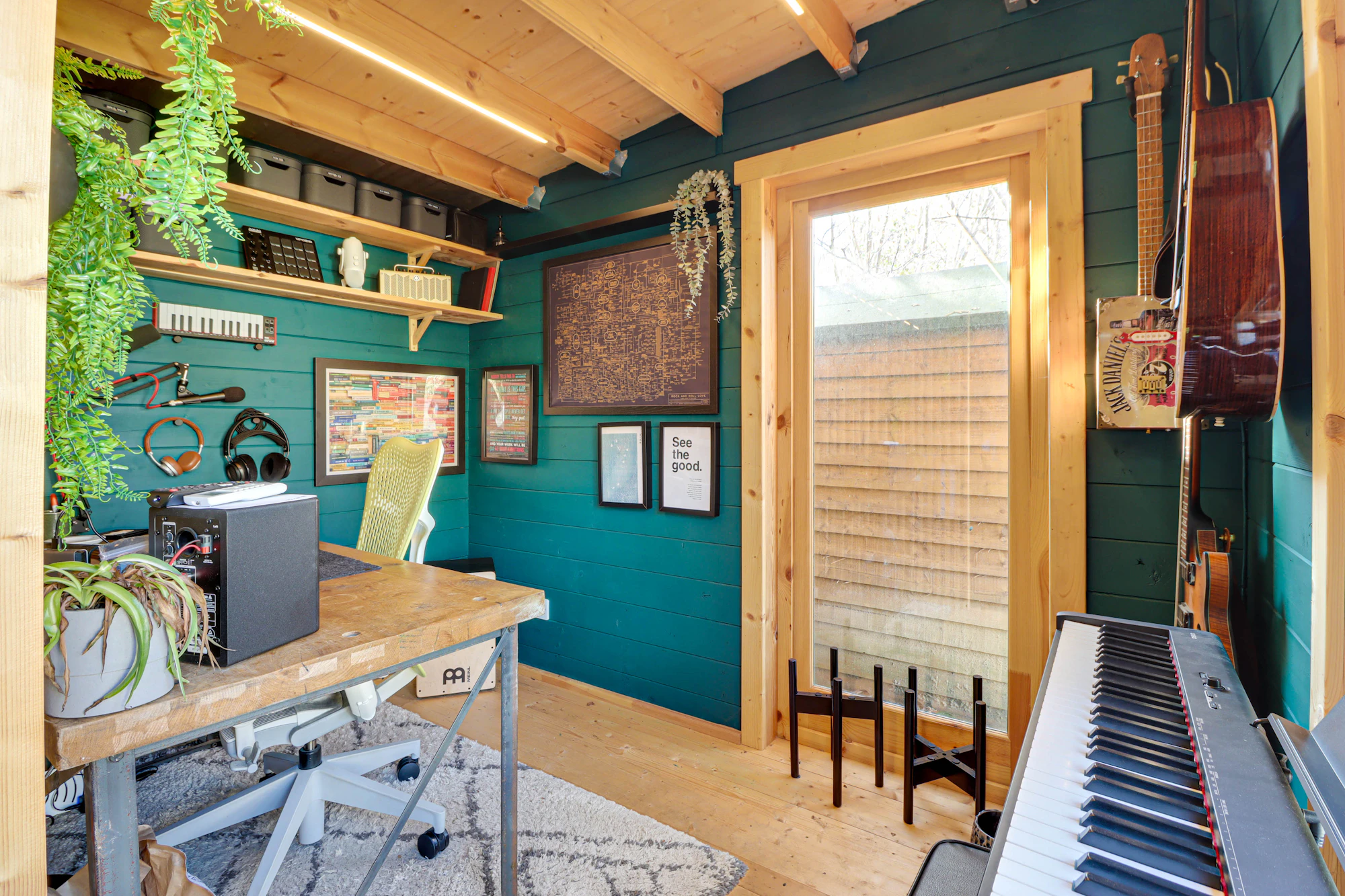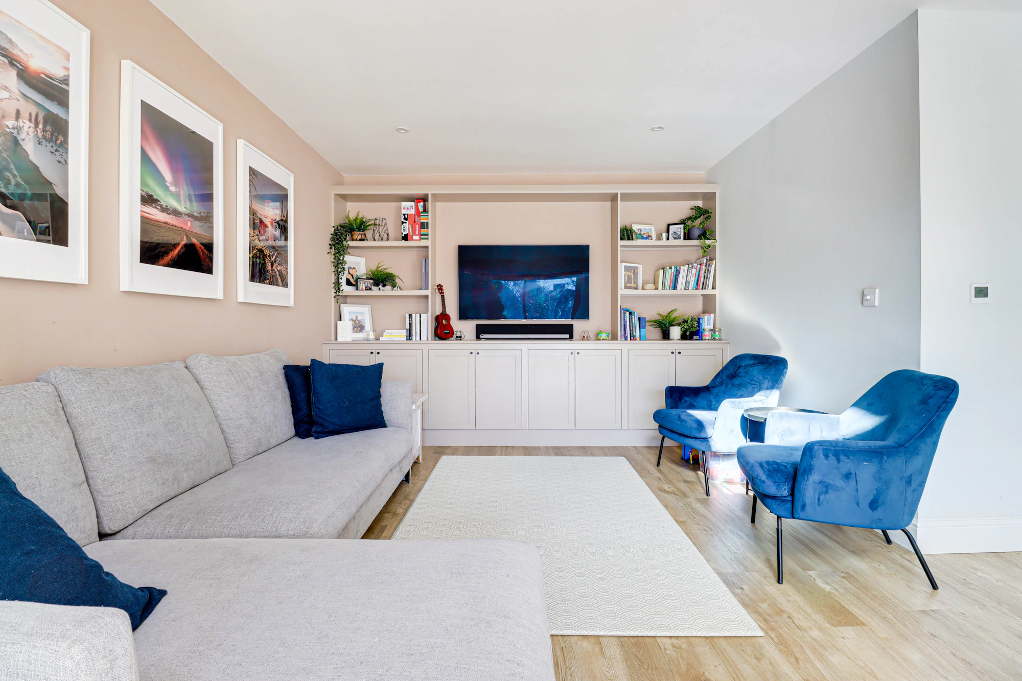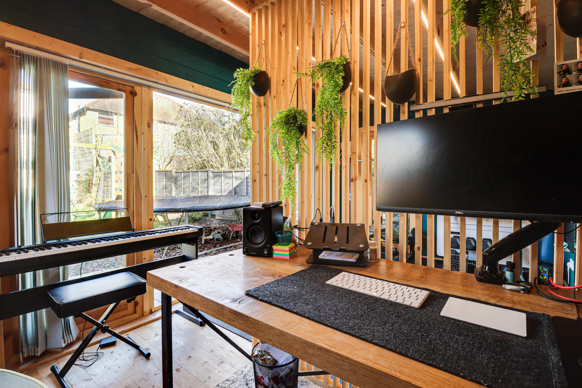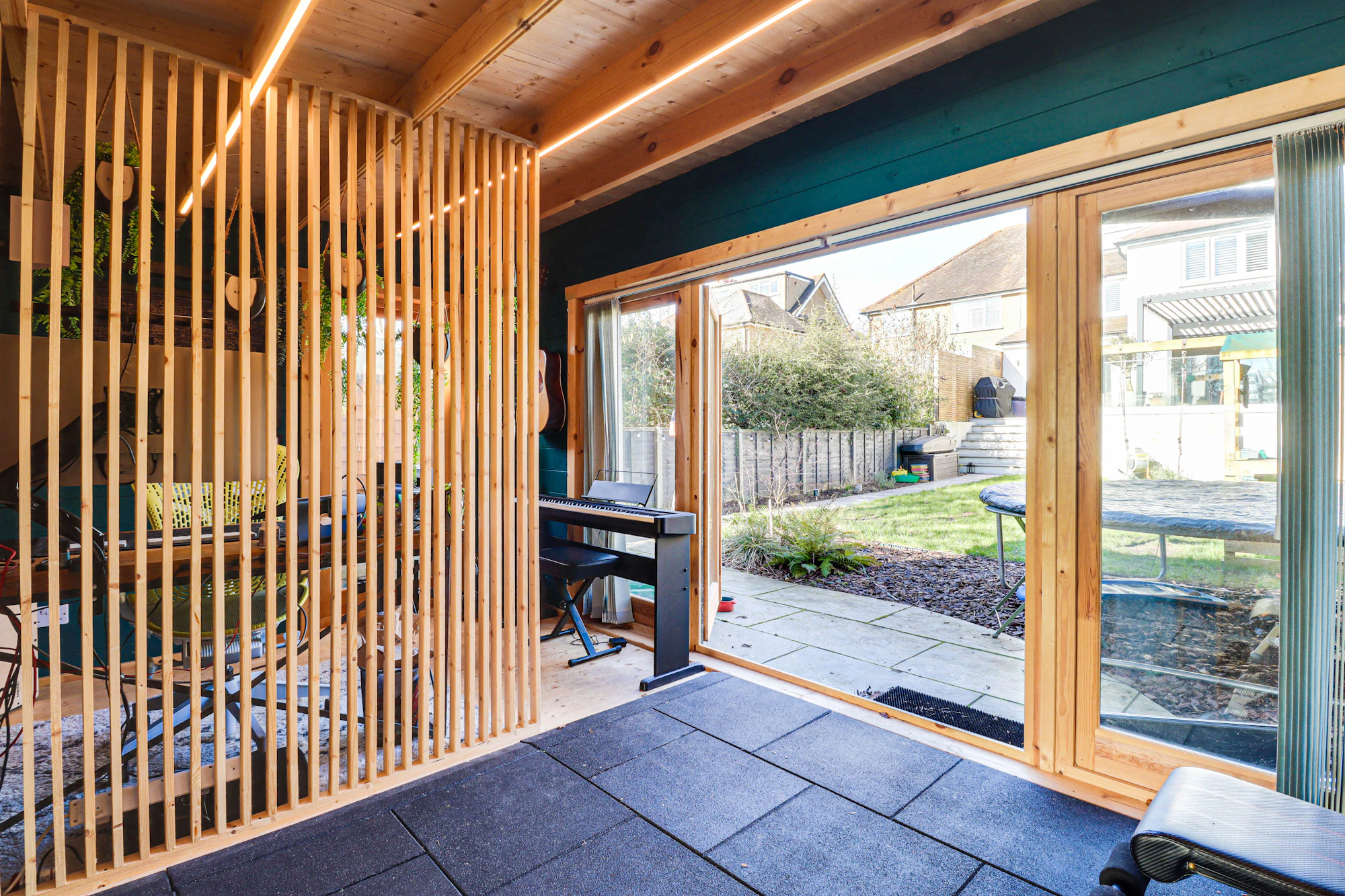 Set back from the street, the property welcomes you with a bright and airy hallway leading into a beautifully designed open-plan kitchen and dining area. The kitchen features premium Siemens integrated appliances, a wine cooler, a double fridge-freezer, generous counter space, and a sleek island. Velux windows and two sets of balcony doors flood the space with natural light, opening onto a paved patio with an overhead pergola, and outdoor heaters, perfect for enjoying the outdoors in all seasons. Steps lead down to the lawn and a versatile airconditioned home office/gym at the rear of the garden.