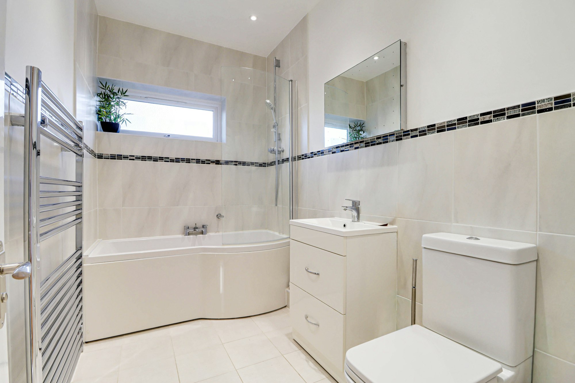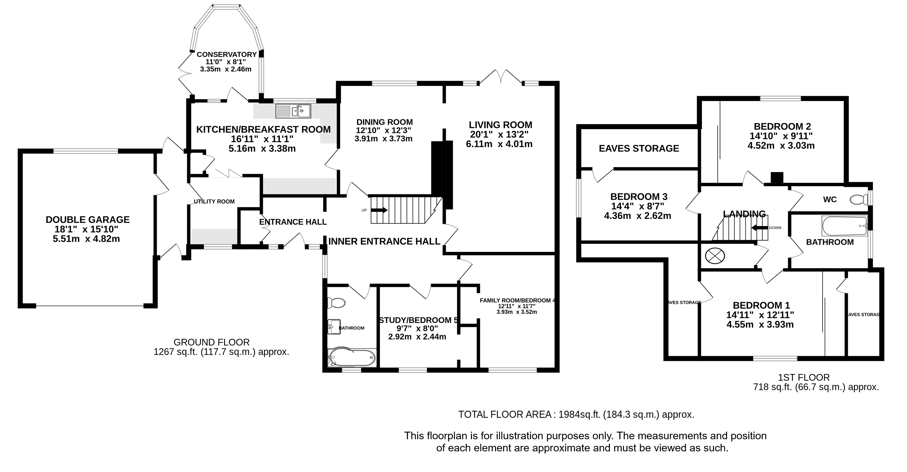 To the first floor are three well-sized bedrooms with fitted wardrobes and eaves storage, served by a family bathroom with bath, shower cubicle and separate WC.