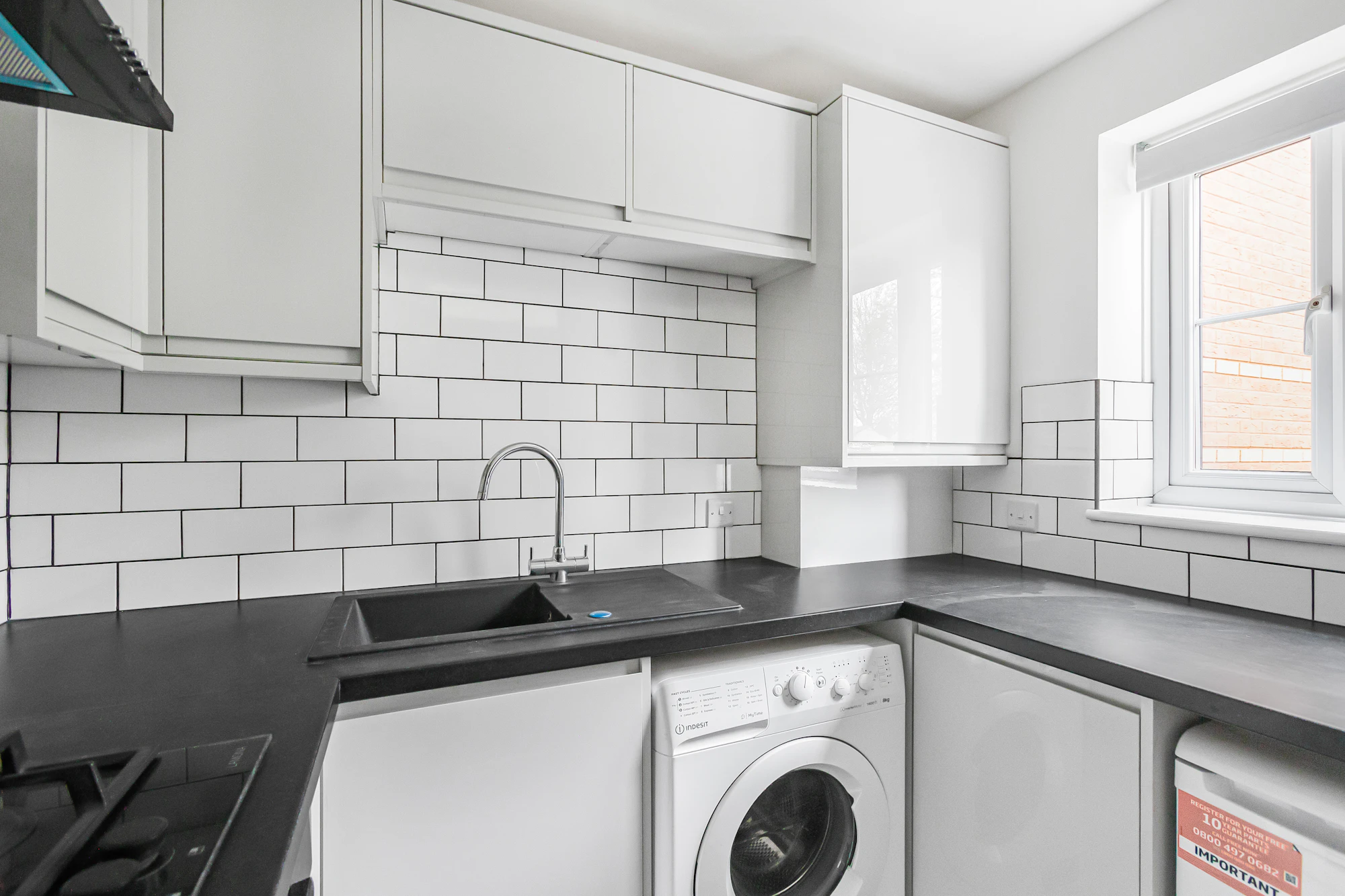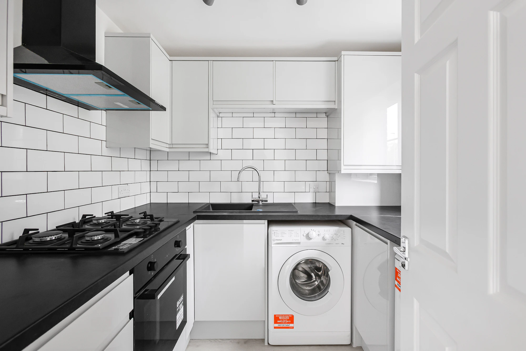 The generous lounge flows seamlessly into a newly fitted, neutral kitchen, complete with modern appliances including a gas oven and hob, washing machine, and separate fridge and freezer. There is also ample worktop and cupboard space.