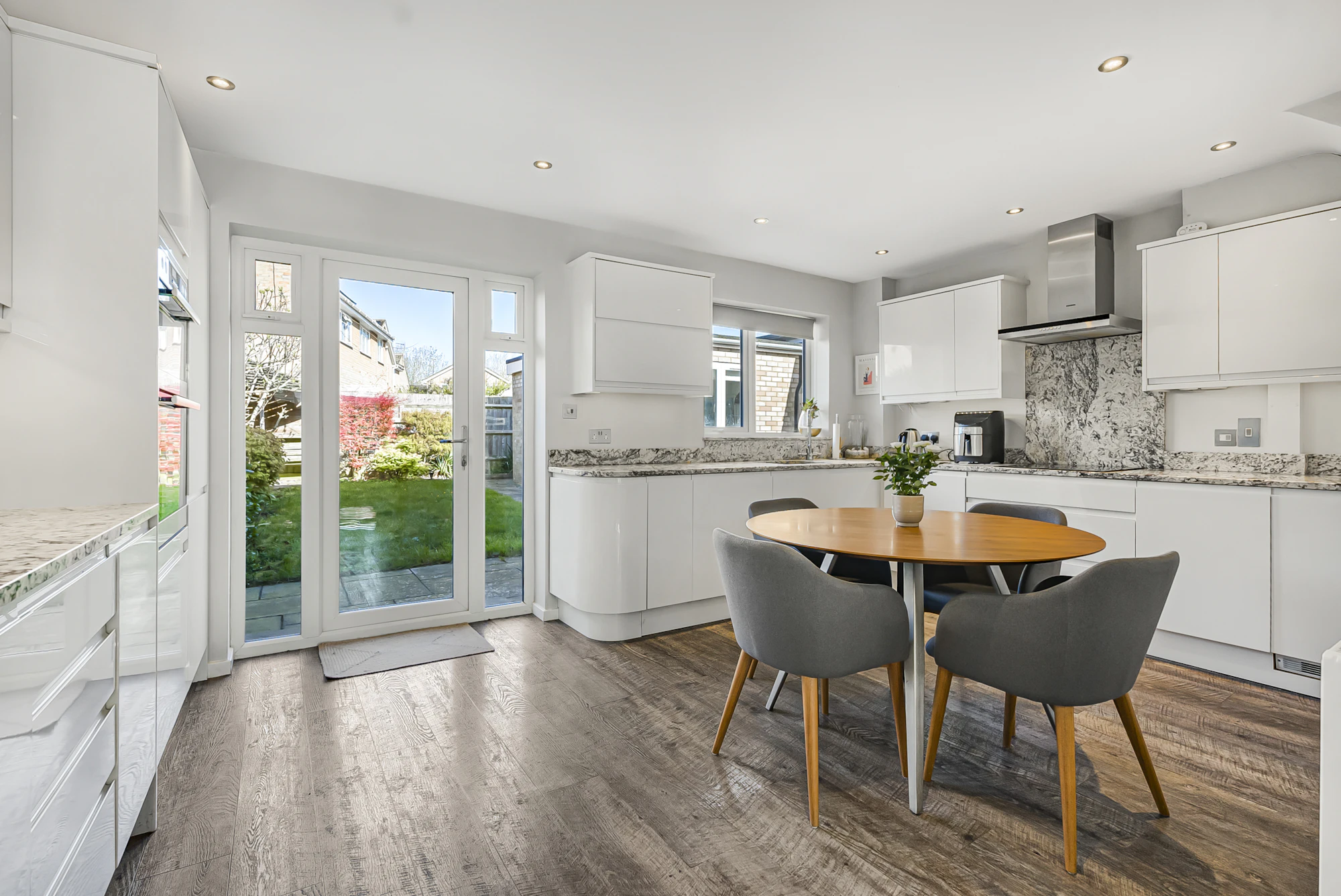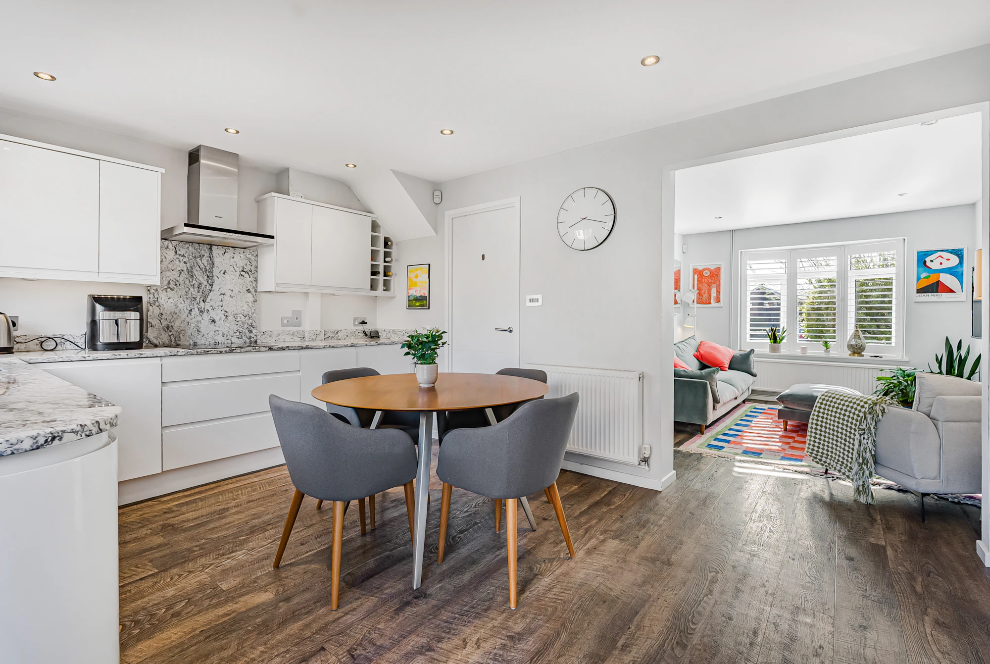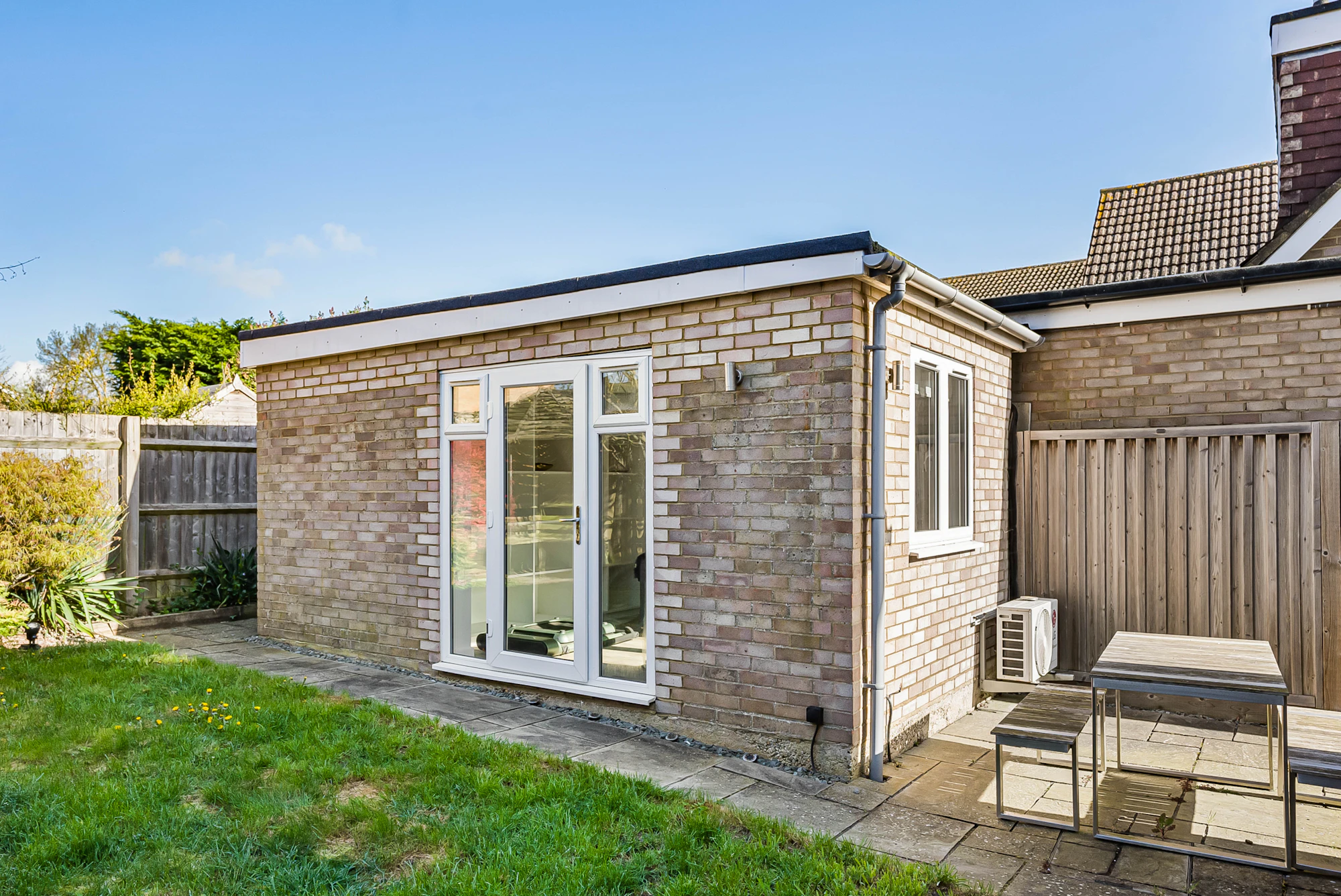 Inside, there is a bright and airy lounge featuring shutter windows, along with a spacious, newly fitted kitchen that provides ample cupboard storage, generous worktop space, and integrated appliances, as well as room for dining. Doors from the kitchen open onto a well-maintained garden, which includes a separate paved dining area and convenient side access.