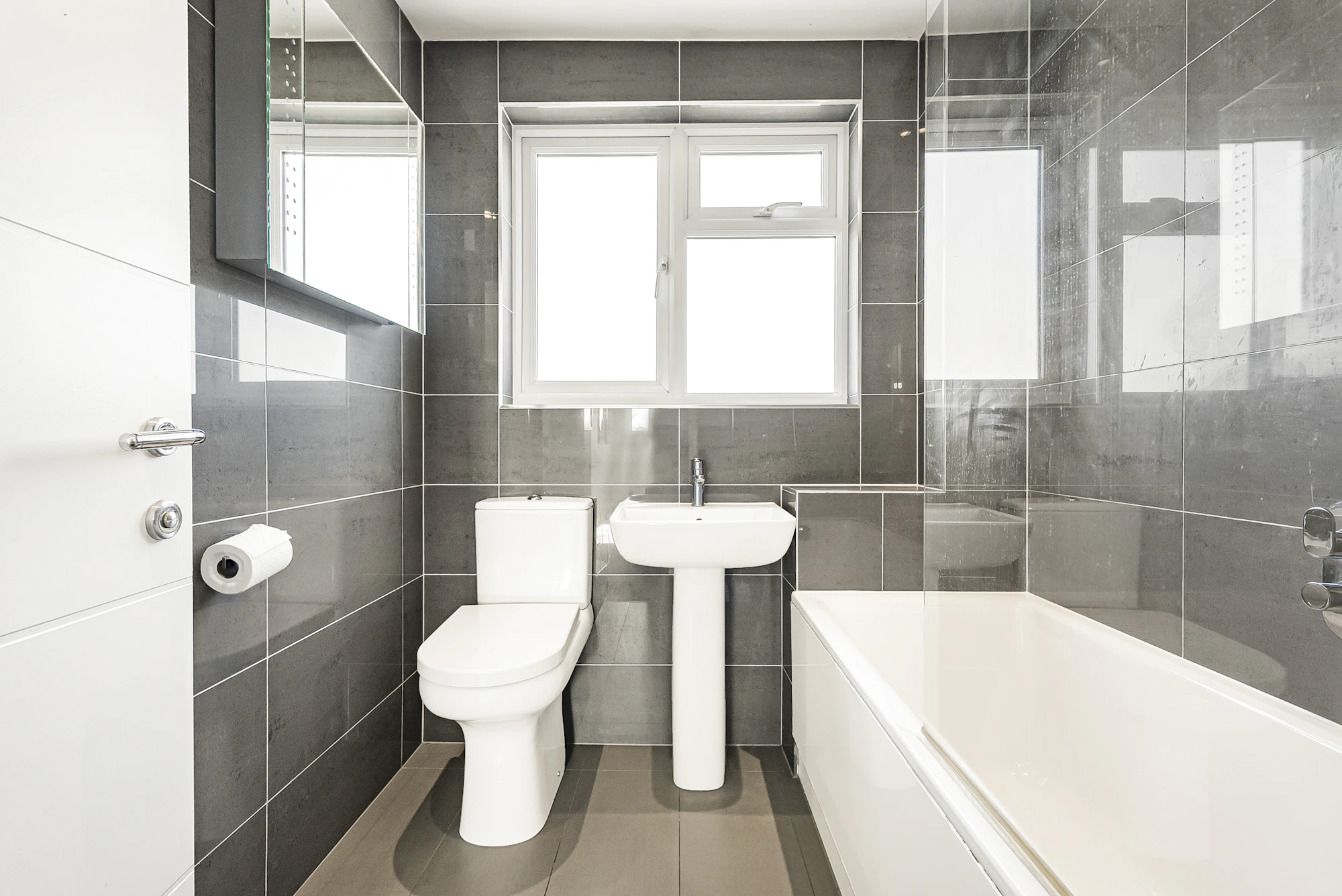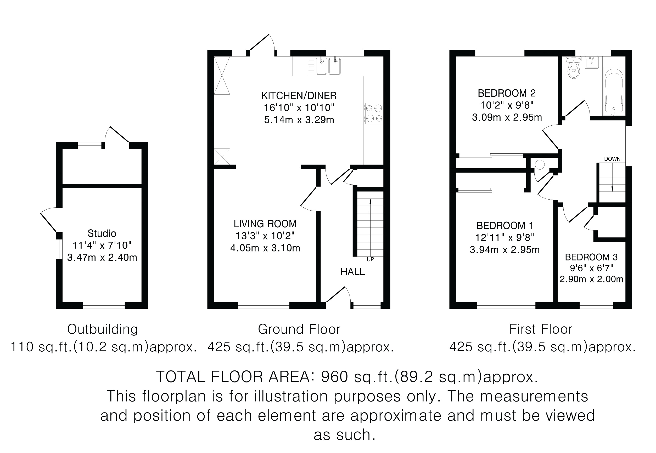 Upstairs, the first floor comprises three well-proportioned bedrooms. The principal and second bedrooms both feature fitted wardrobes, and there are useful storage cupboards throughout. The tiled bathroom is modern with a bath and overhead shower.