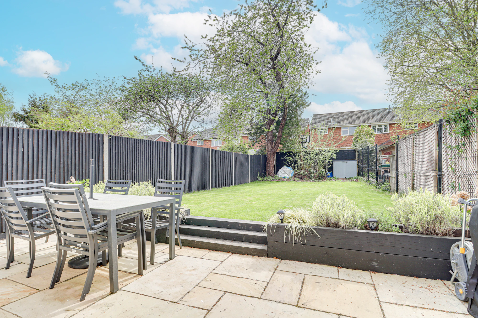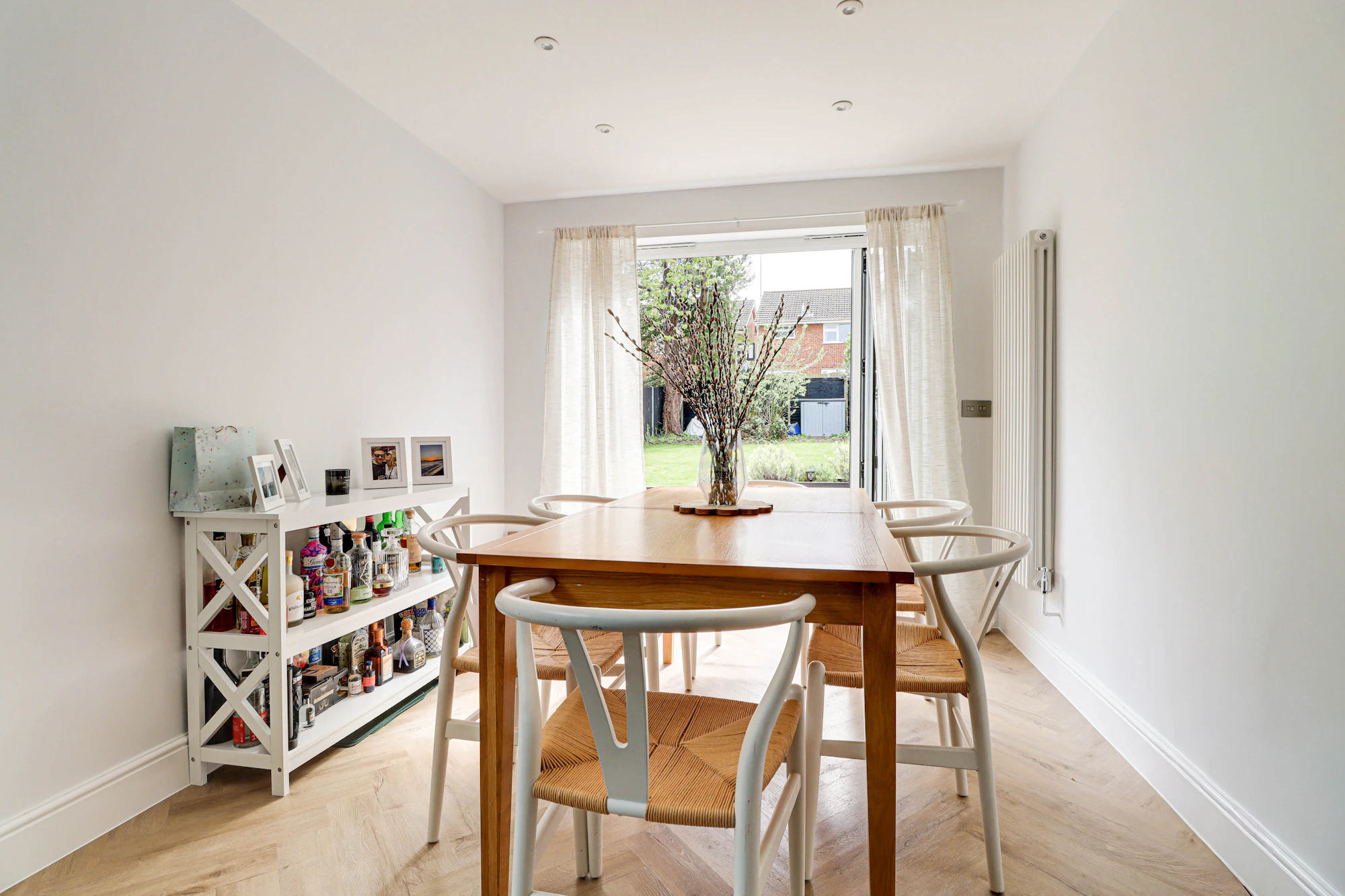 The dining area enjoys views over the rear garden and benefits from bi-folding doors that open out onto a low-maintenance outdoor space, complete with paving and a lawned area.